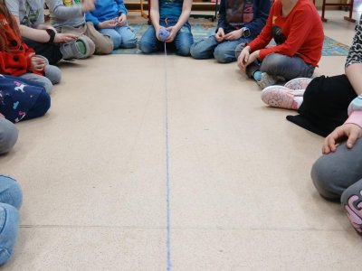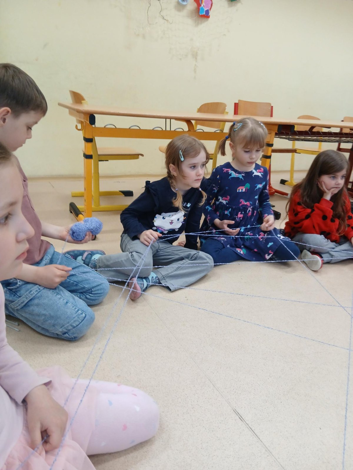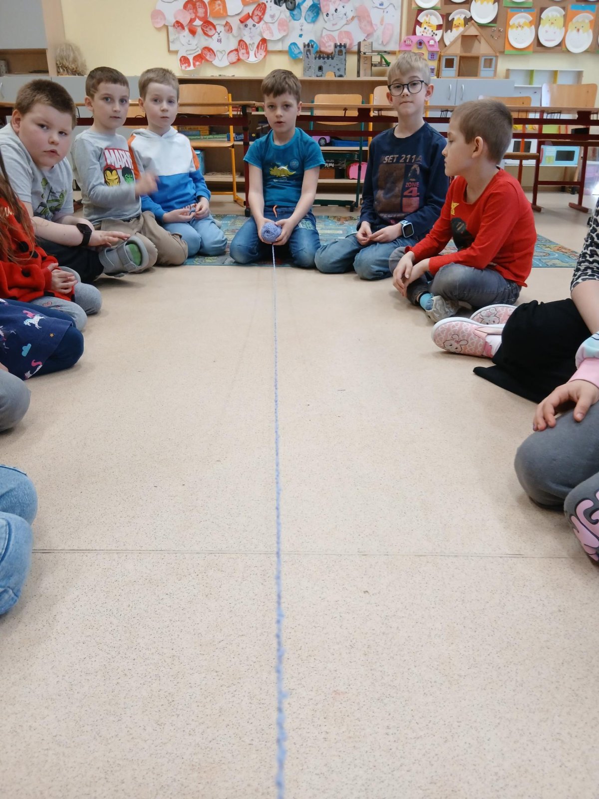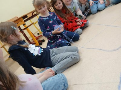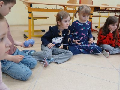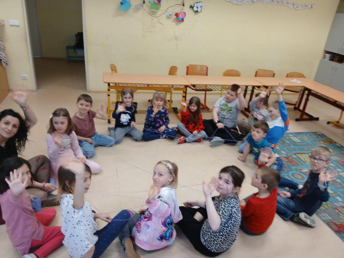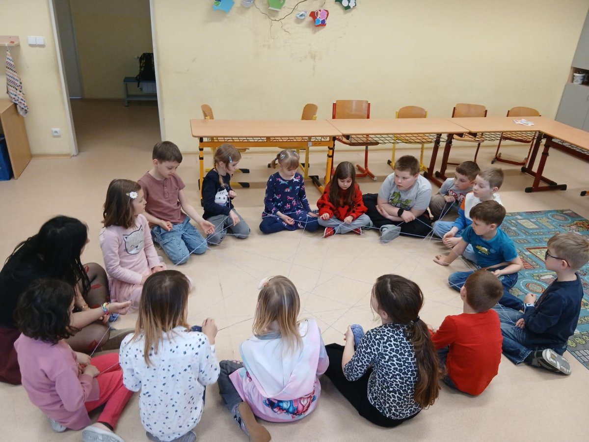 Ve školní družině jsme si dnes vyzkoušeli zábavnou a zároveň milou aktivitu s klubkem vlny. Sedli jsme si do kruhu a navzájem si házeli klubko, čímž postupně vznikala „pavučina“. Každý, kdo klubko chytil, řekl o tom, komu ho hází, něco hezkého – co se mu na něm líbí nebo co na něm oceňuje.