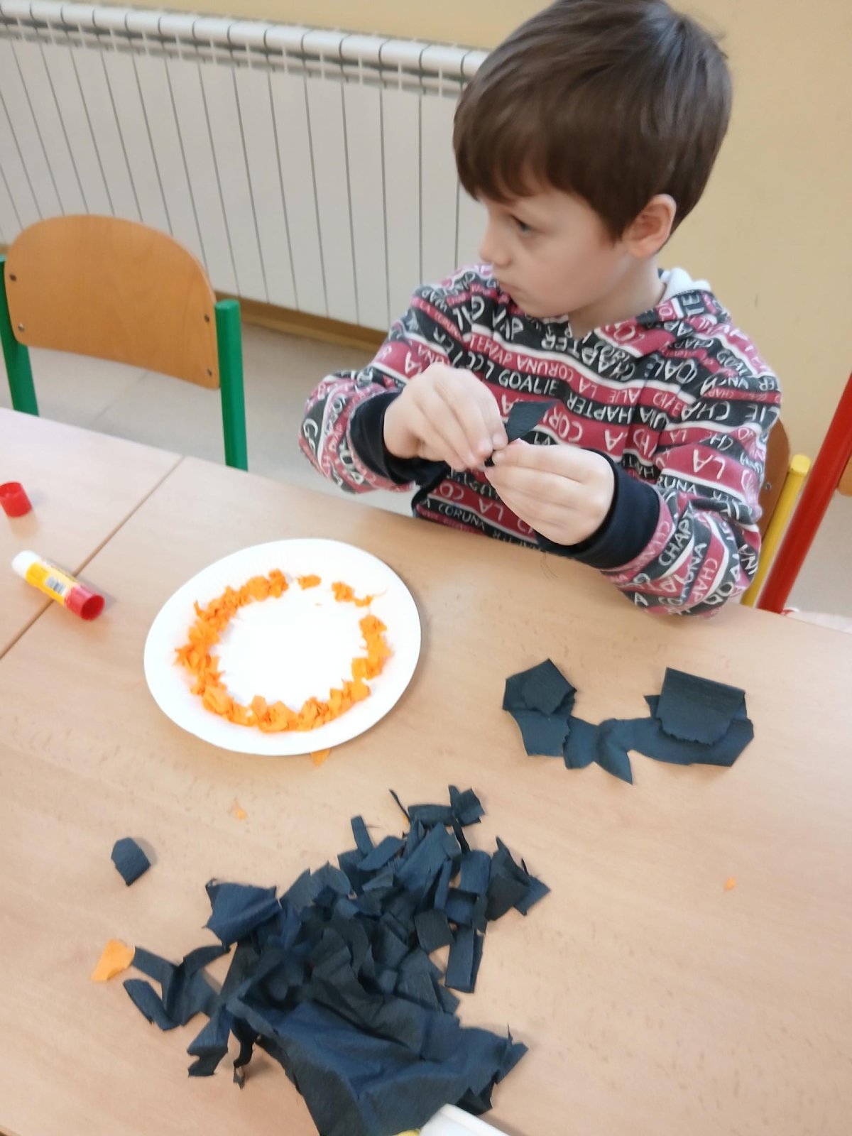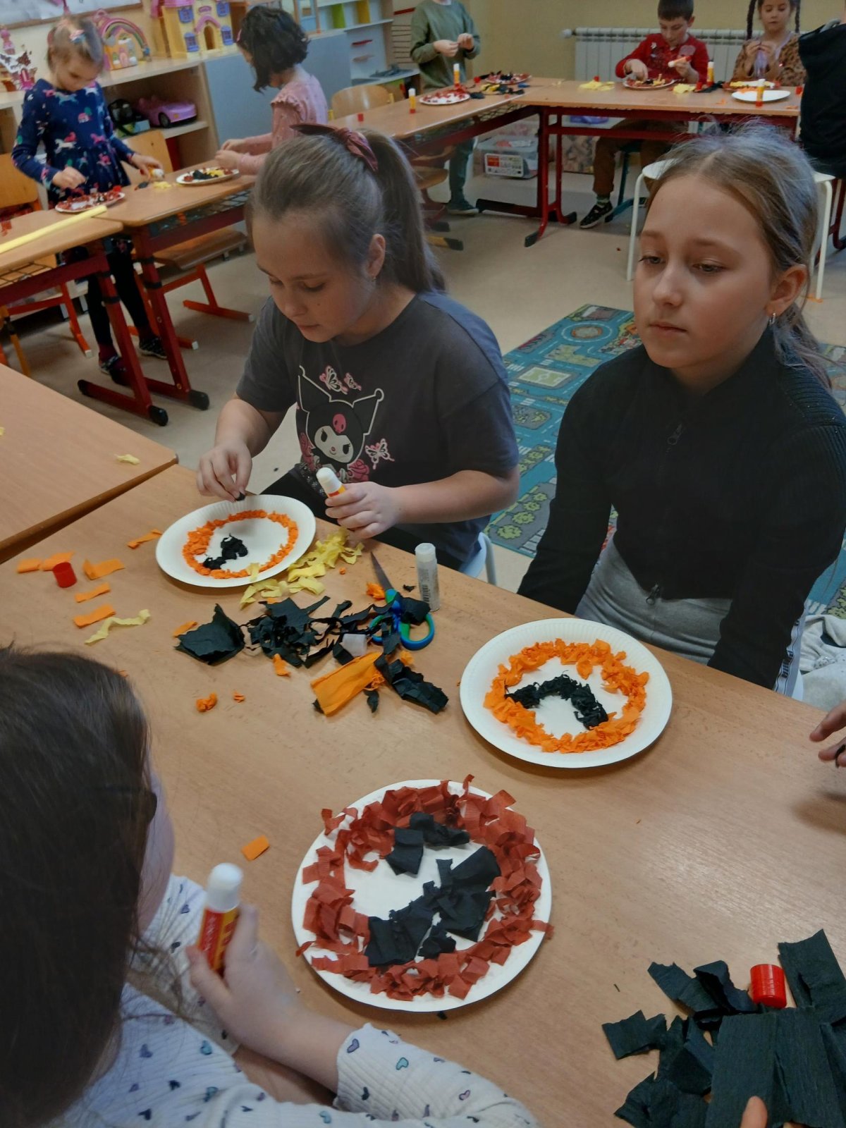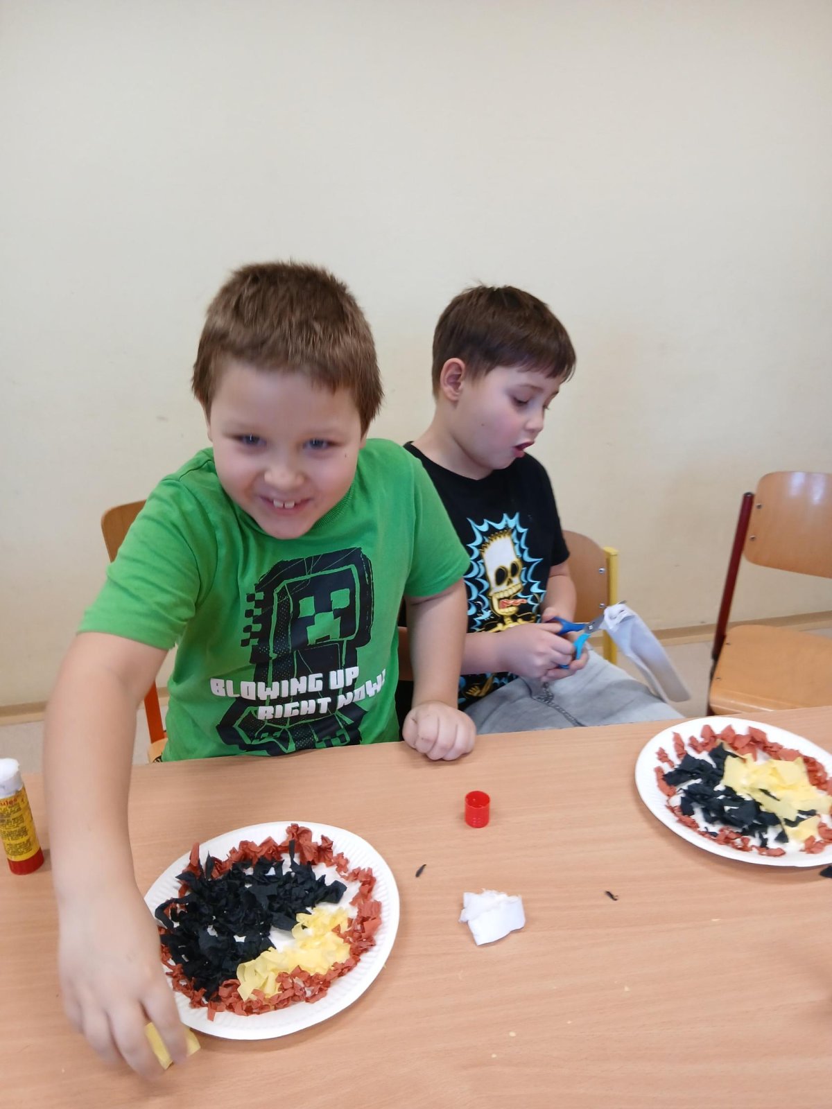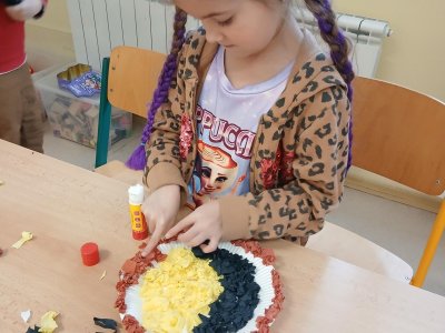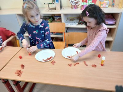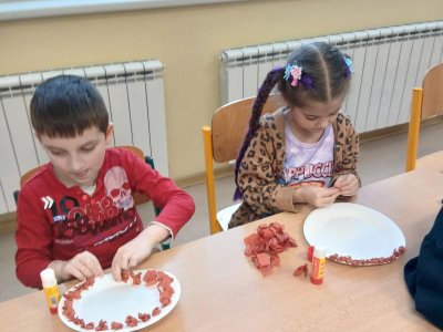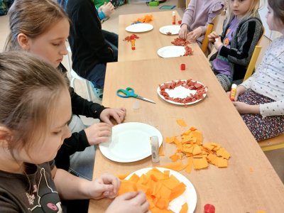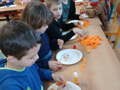 V rámci tematického bloku Masopust si děti ve školní družině vyzkoušely tvořivou činnost – vyráběly masopustní koláče z krepového papíru. Pomocí lepení barevných kuliček na tácek vznikaly originální a velmi povedené „koláče“, které dětem rozvíjely jemnou motoriku, fantazii i trpělivost. Práce je velmi bavila a výsledné výtvory se jim opravdu povedly.