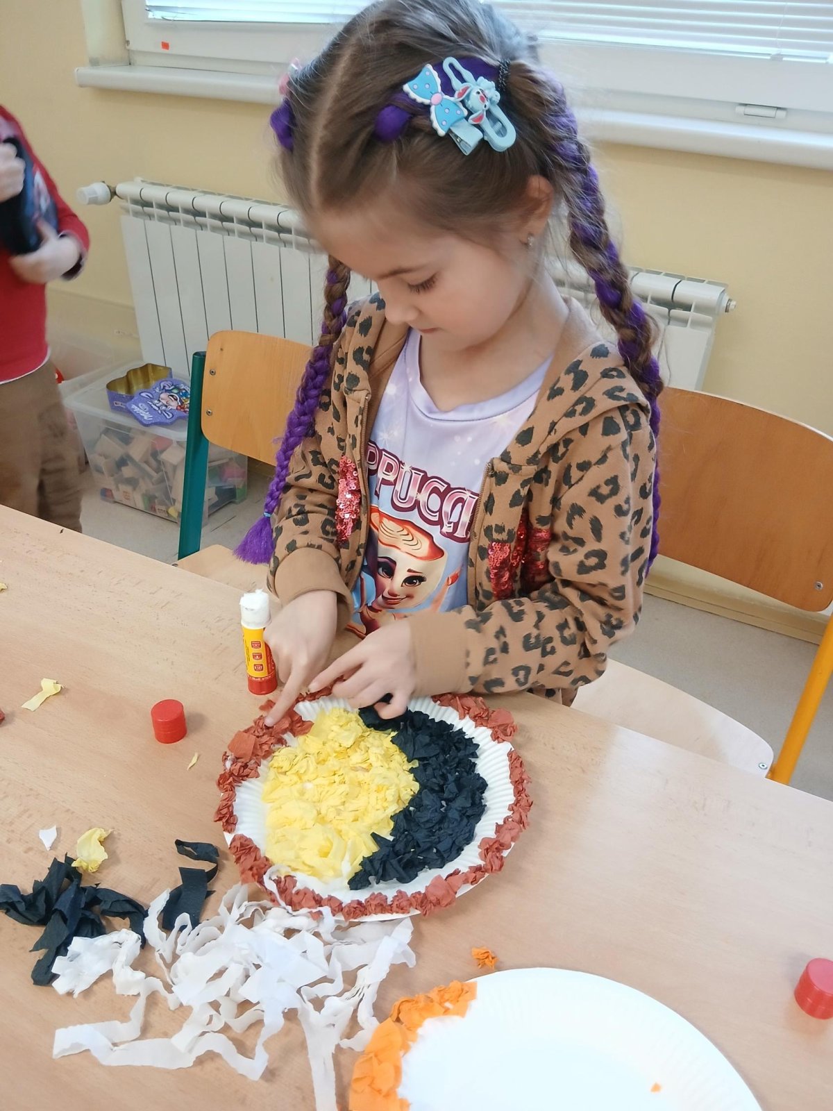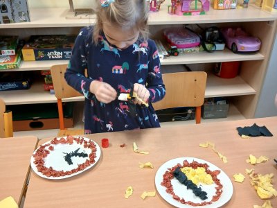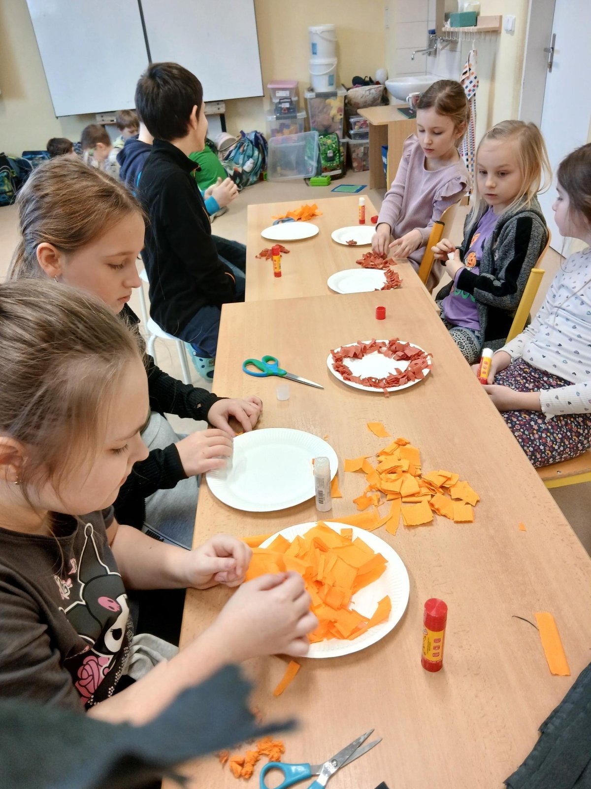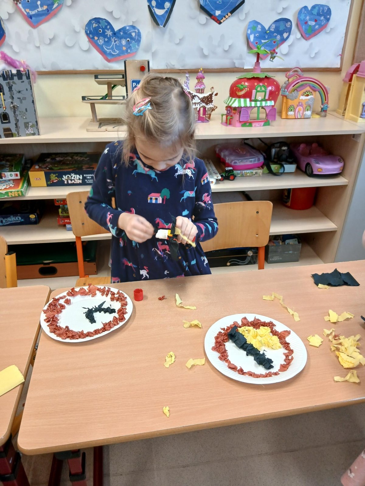 V rámci tematického bloku Masopust si děti ve školní družině vyzkoušely tvořivou činnost – vyráběly masopustní koláče z krepového papíru. Pomocí lepení barevných kuliček na tácek vznikaly originální a velmi povedené „koláče“, které dětem rozvíjely jemnou motoriku, fantazii i trpělivost. Práce je velmi bavila a výsledné výtvory se jim opravdu povedly.