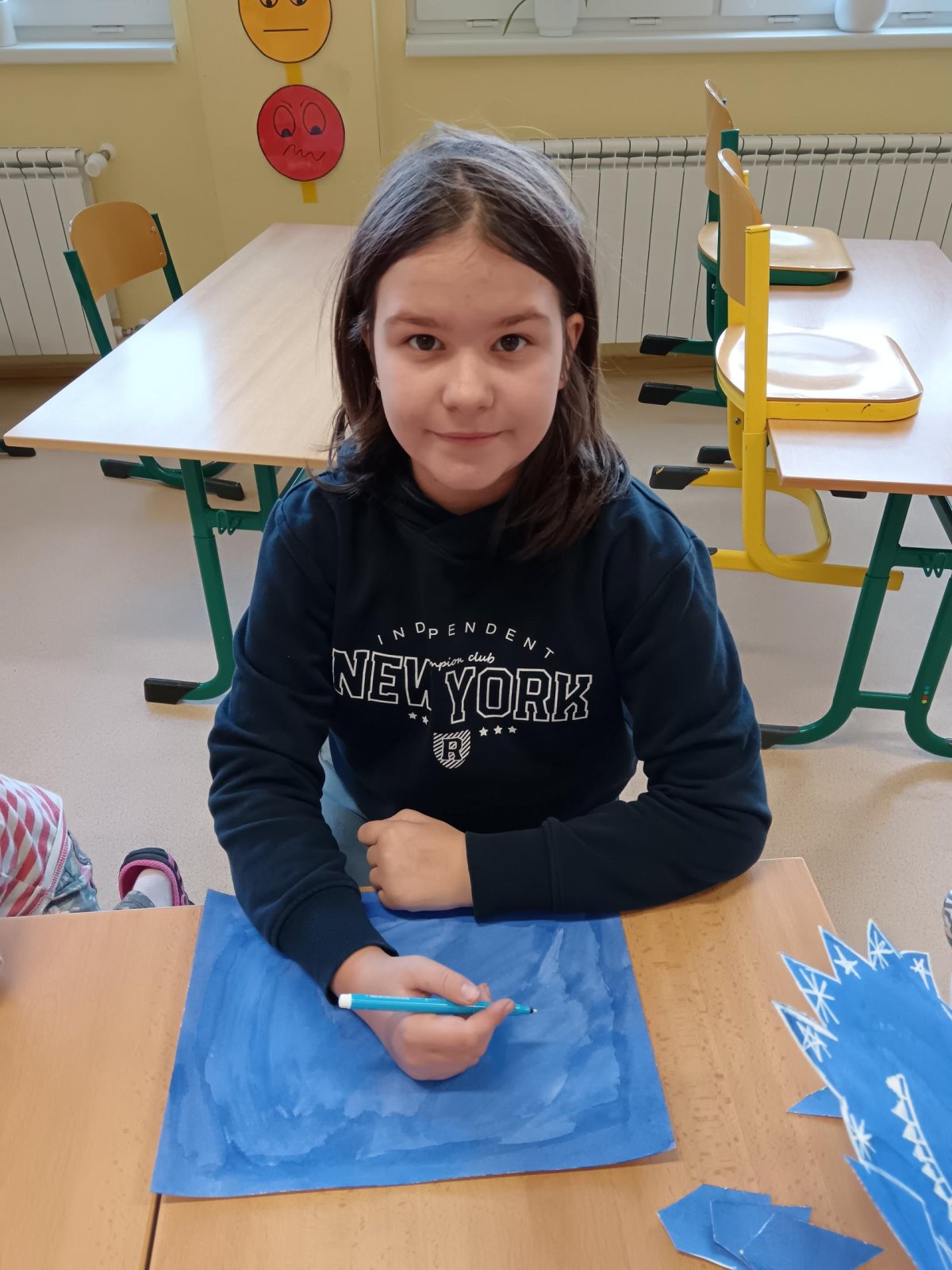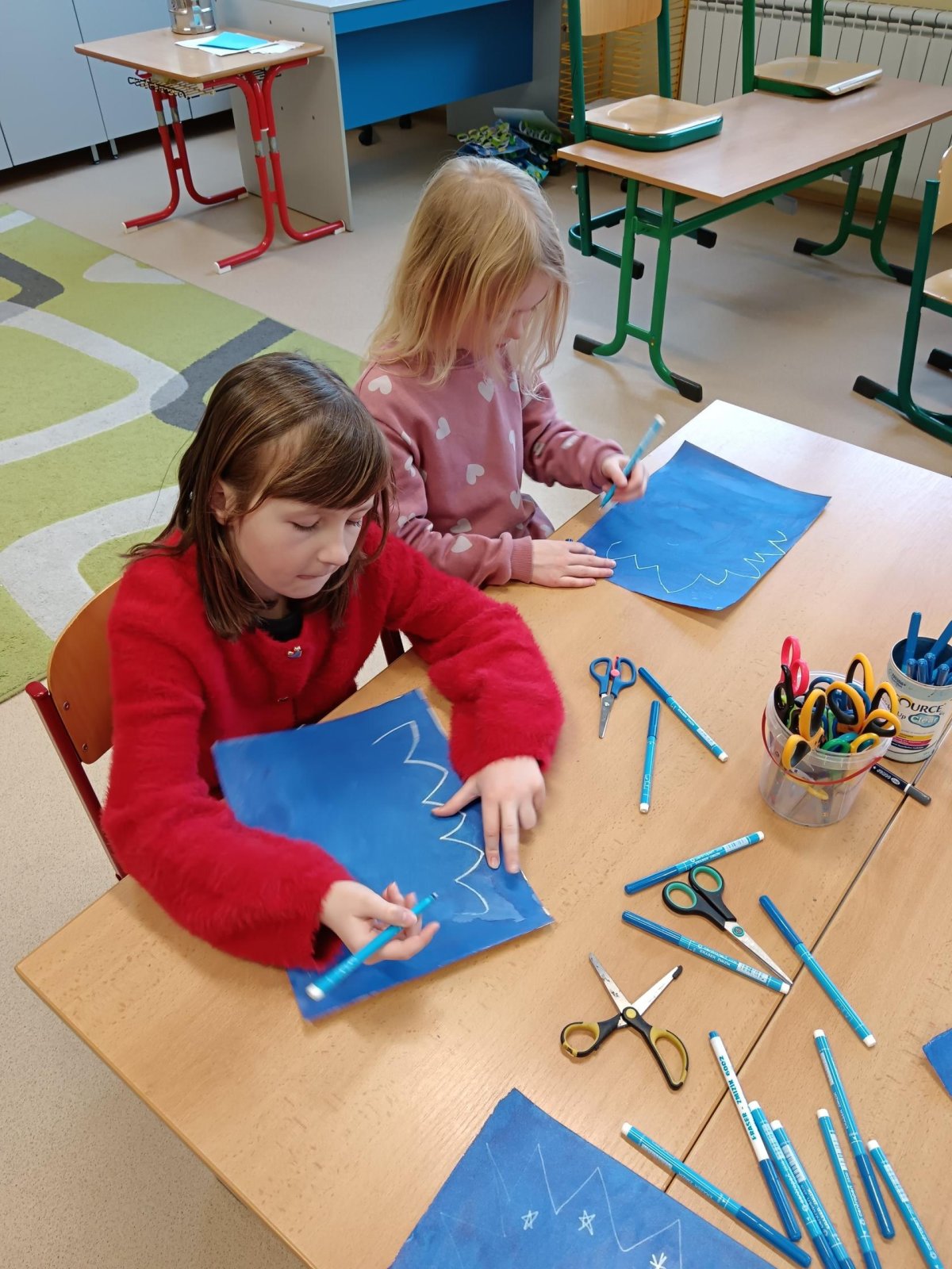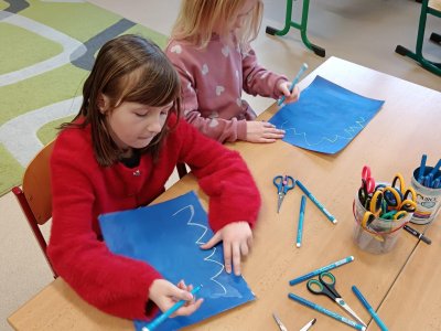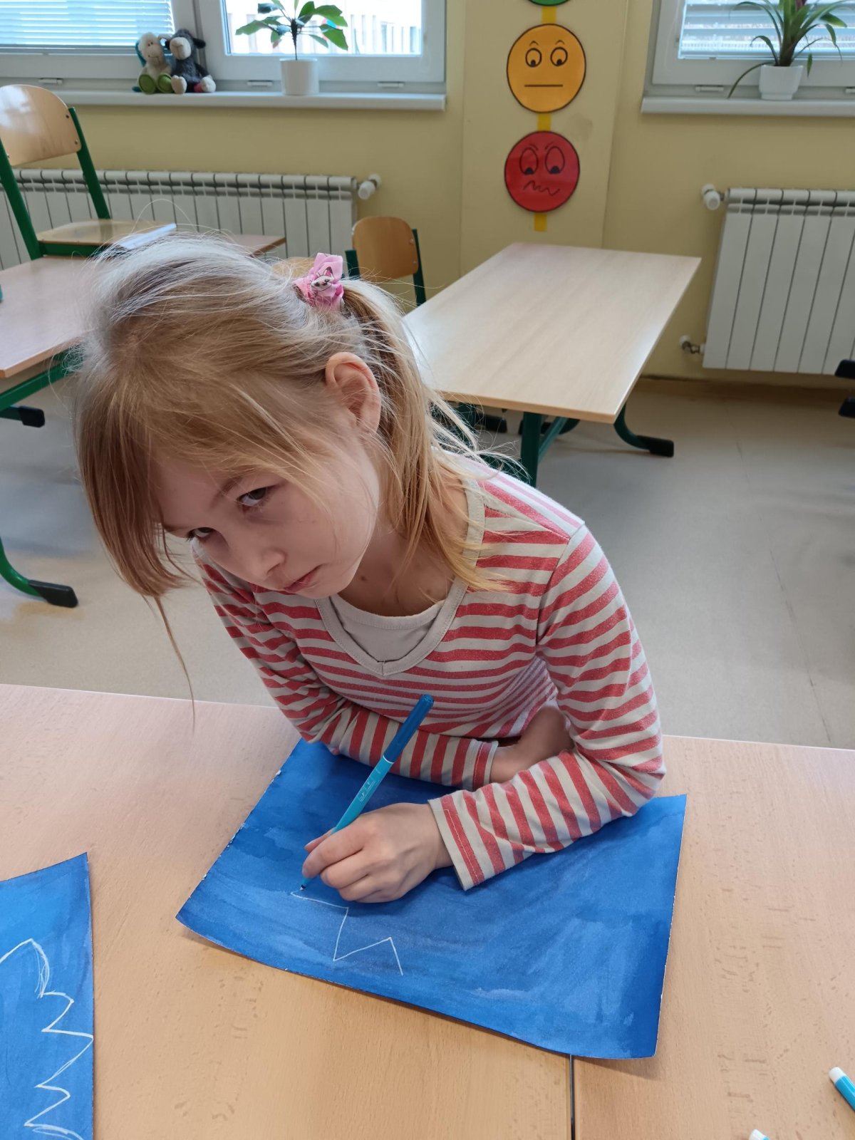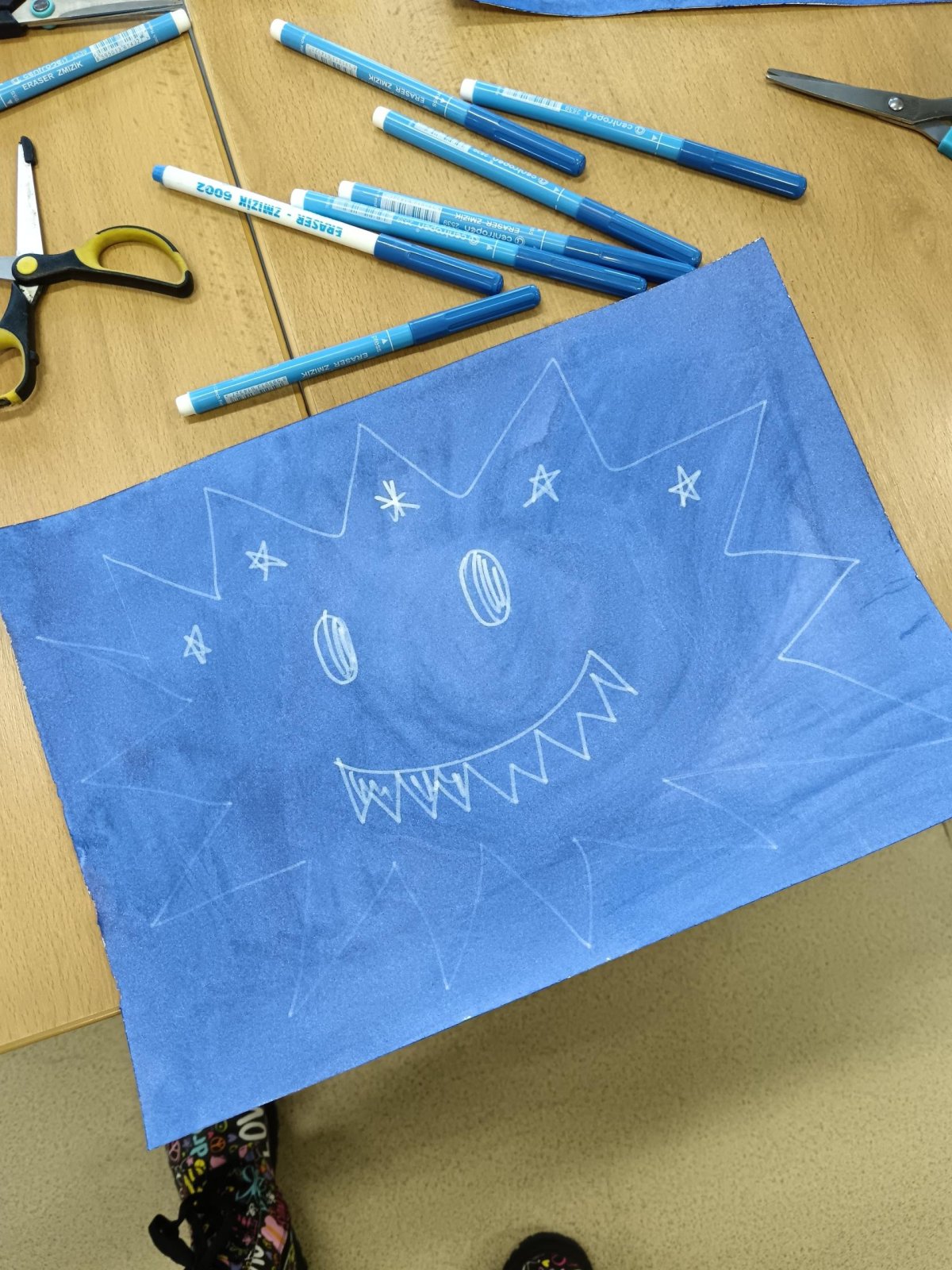 Malovaný mrazík ozdobil nástěnku mrazivým úsměvem. A proměnil ji v kouzelné umělecké dílo. Obrázky se povedly a rozzářily prostor u vchodových dveří.
