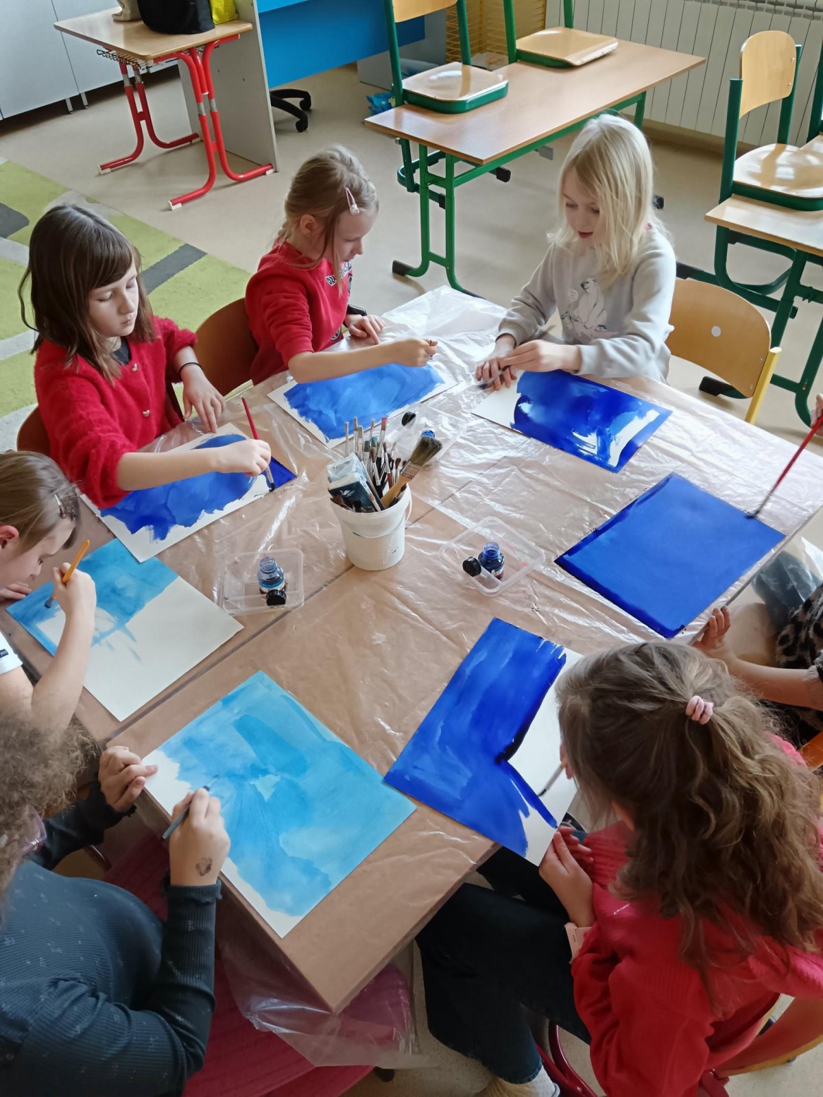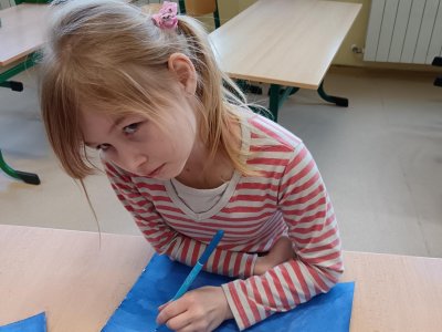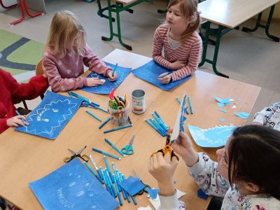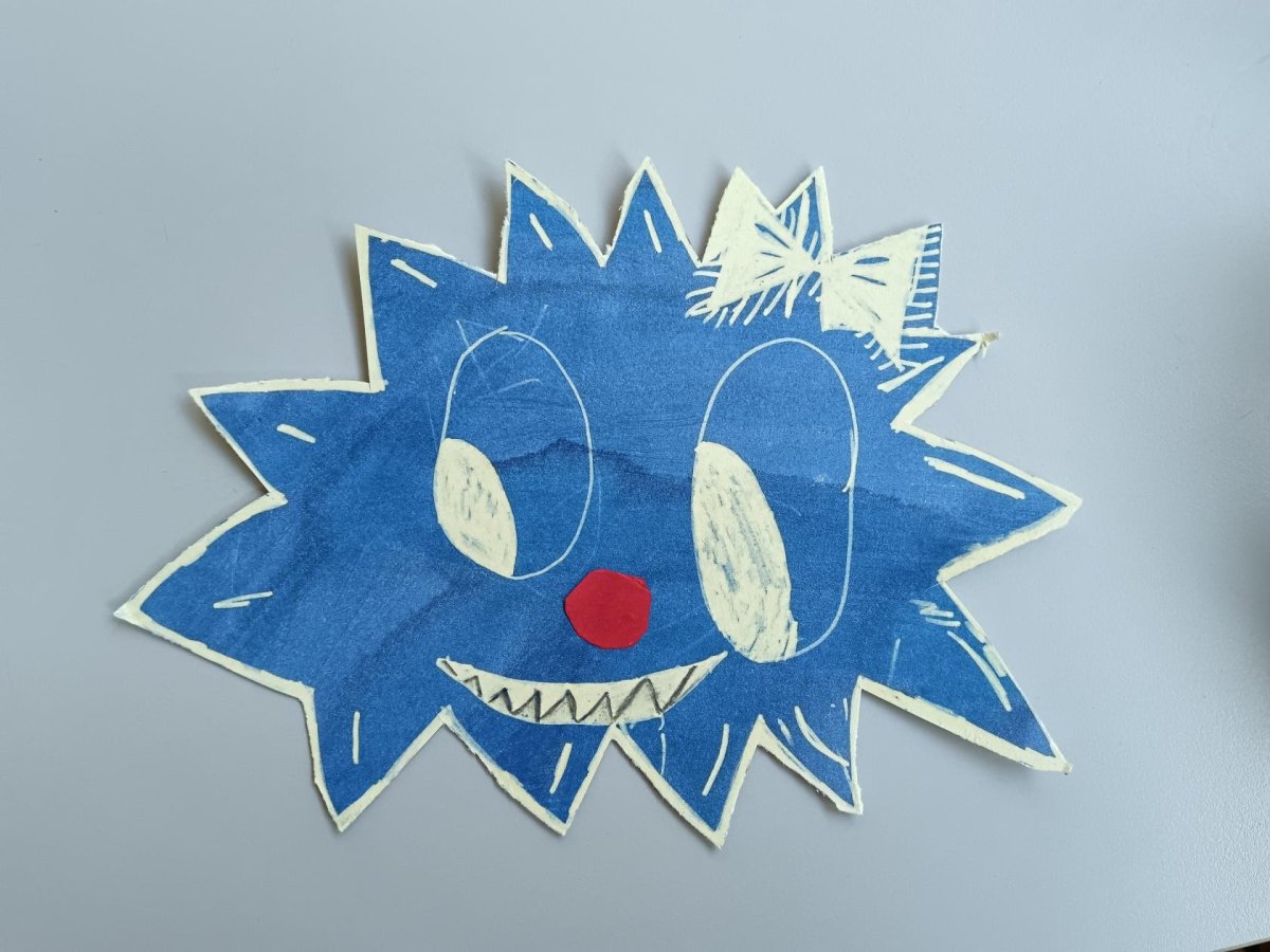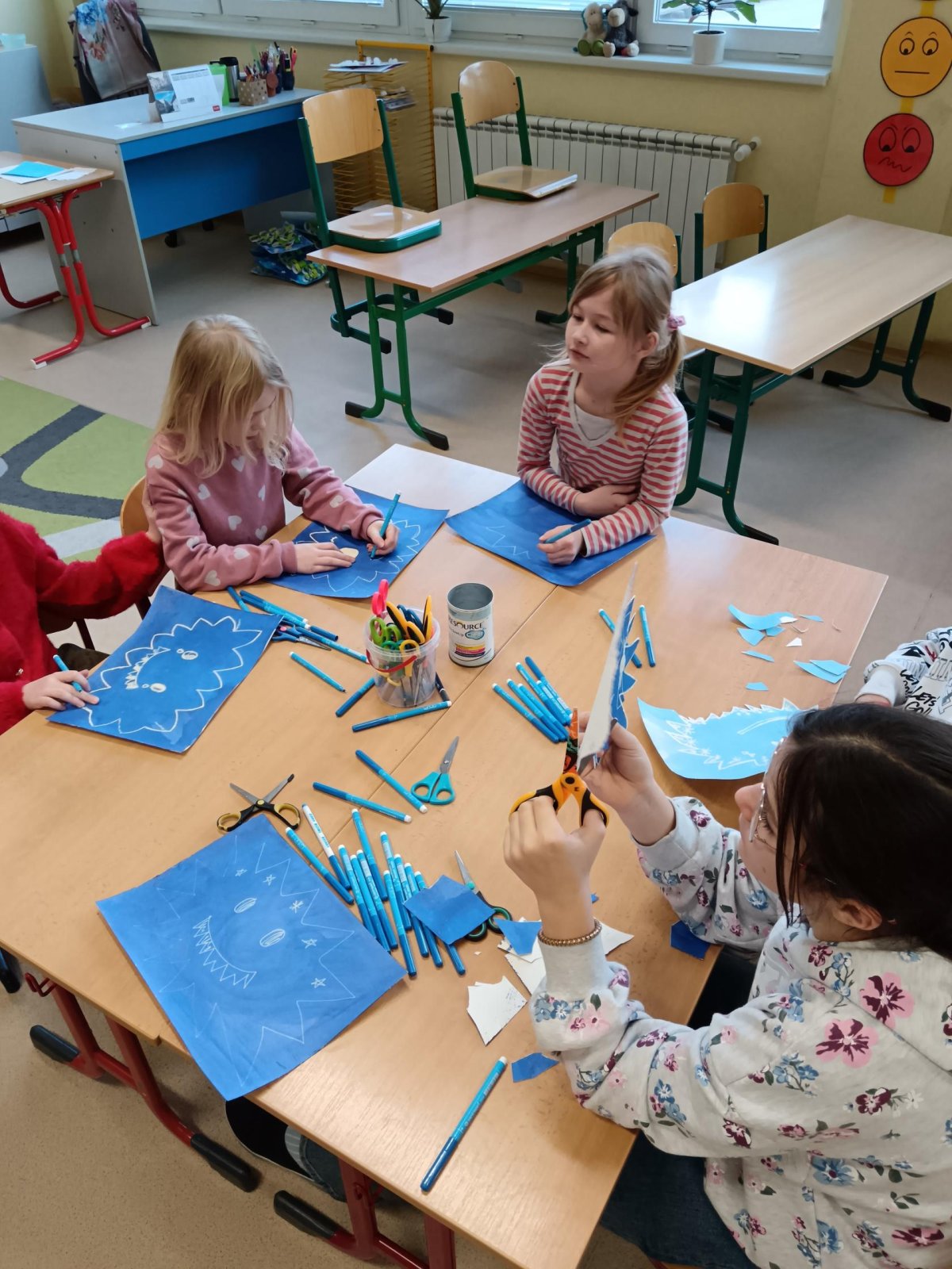 Malovaný mrazík ozdobil nástěnku mrazivým úsměvem. A proměnil ji v kouzelné umělecké dílo. Obrázky se povedly a rozzářily prostor u vchodových dveří.