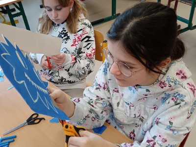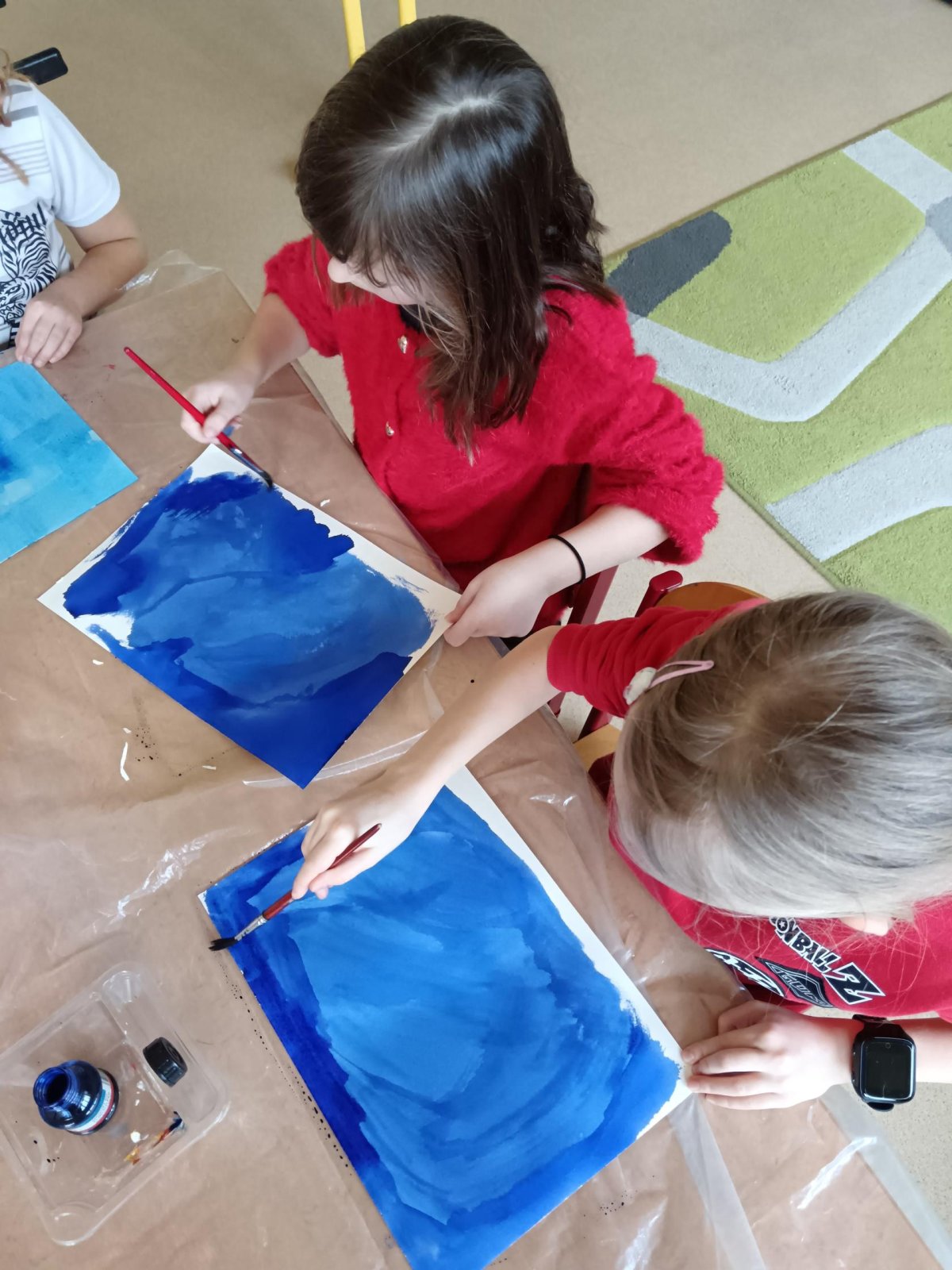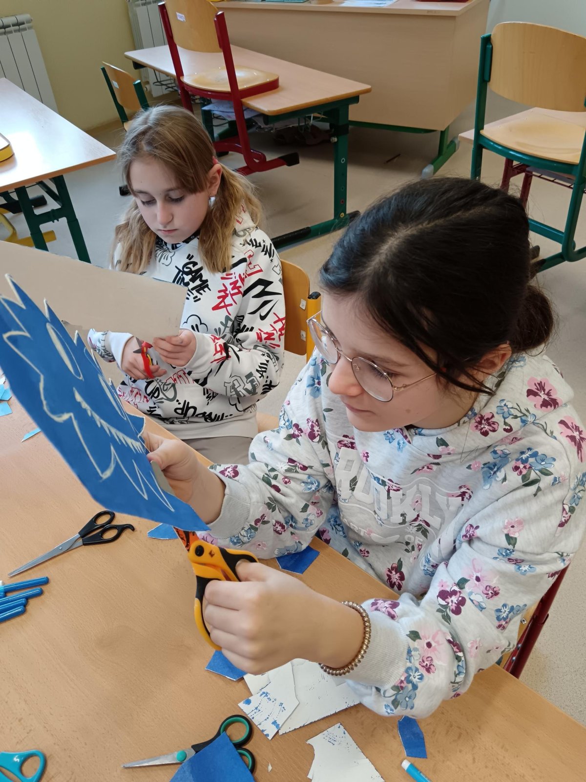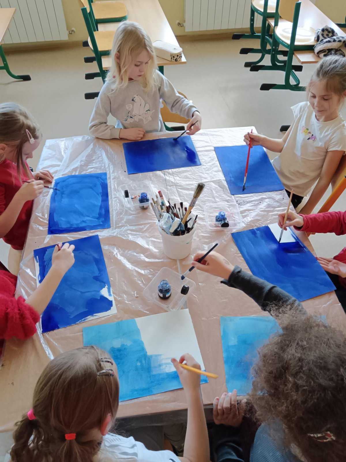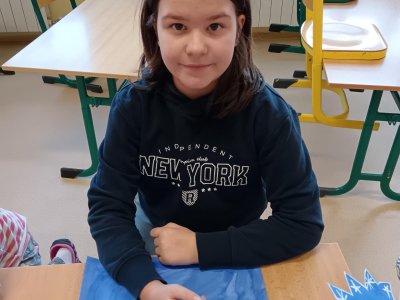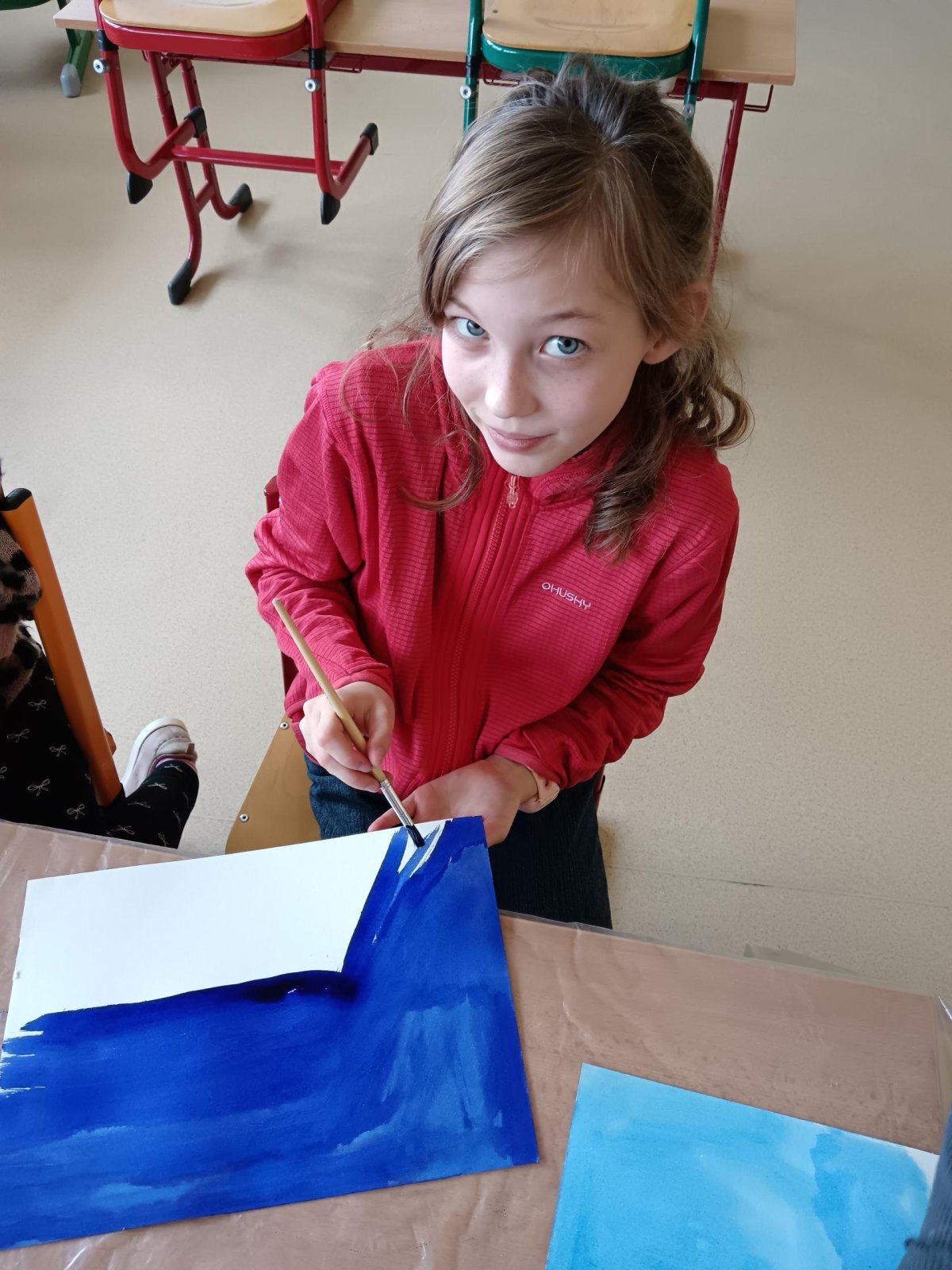 Malovaný mrazík ozdobil nástěnku mrazivým úsměvem. A proměnil ji v kouzelné umělecké dílo. Obrázky se povedly a rozzářily prostor u vchodových dveří.