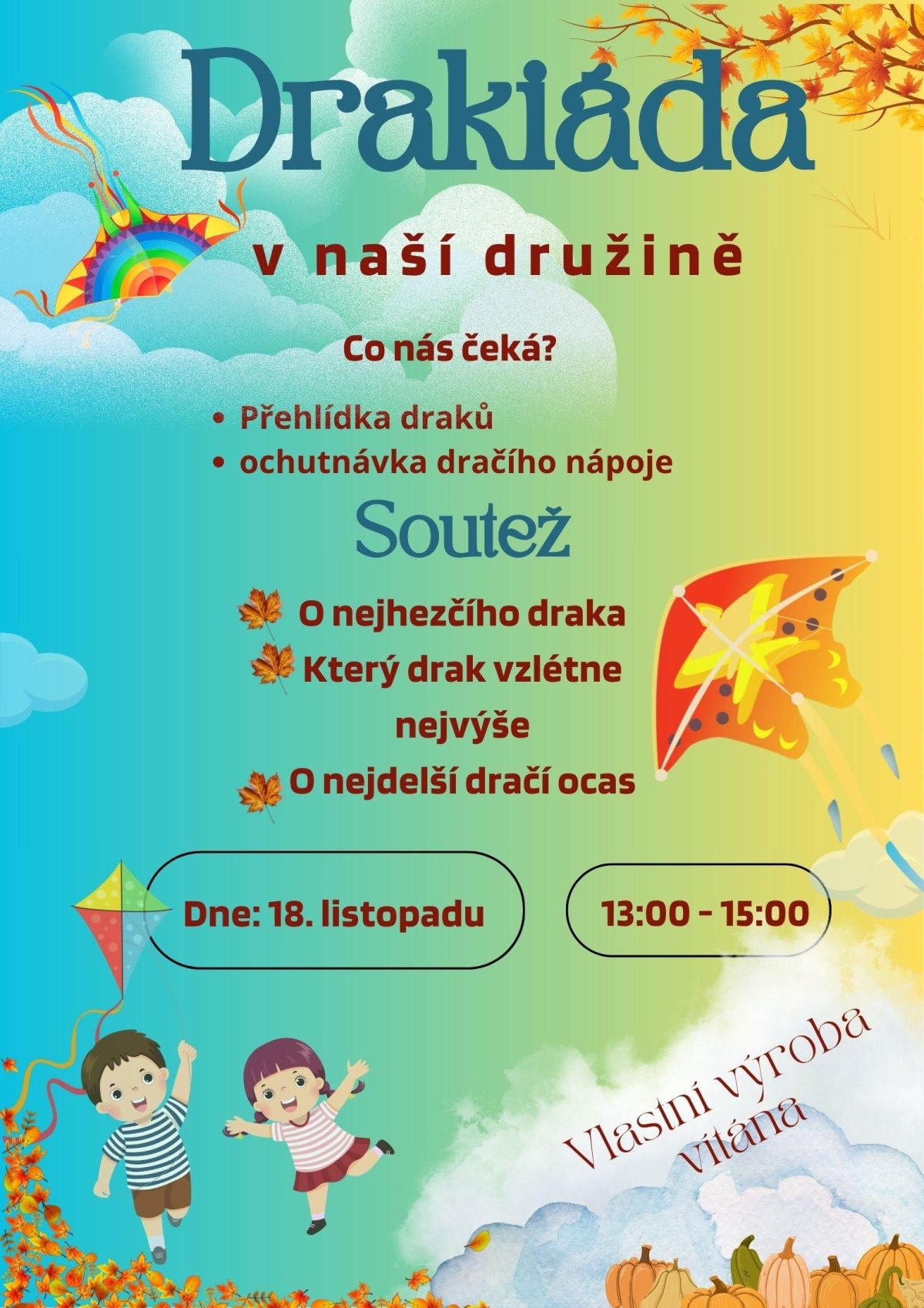 Naše školní družina uspořádala malou radostnou Drakiádu, která dětem nabídla zábavu i soutěžení. Sešla se nám velmi pestrá přehlídka draků všech tvarů, barev i velikostí. Každý z nich nesl kus fantazie.