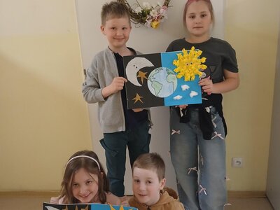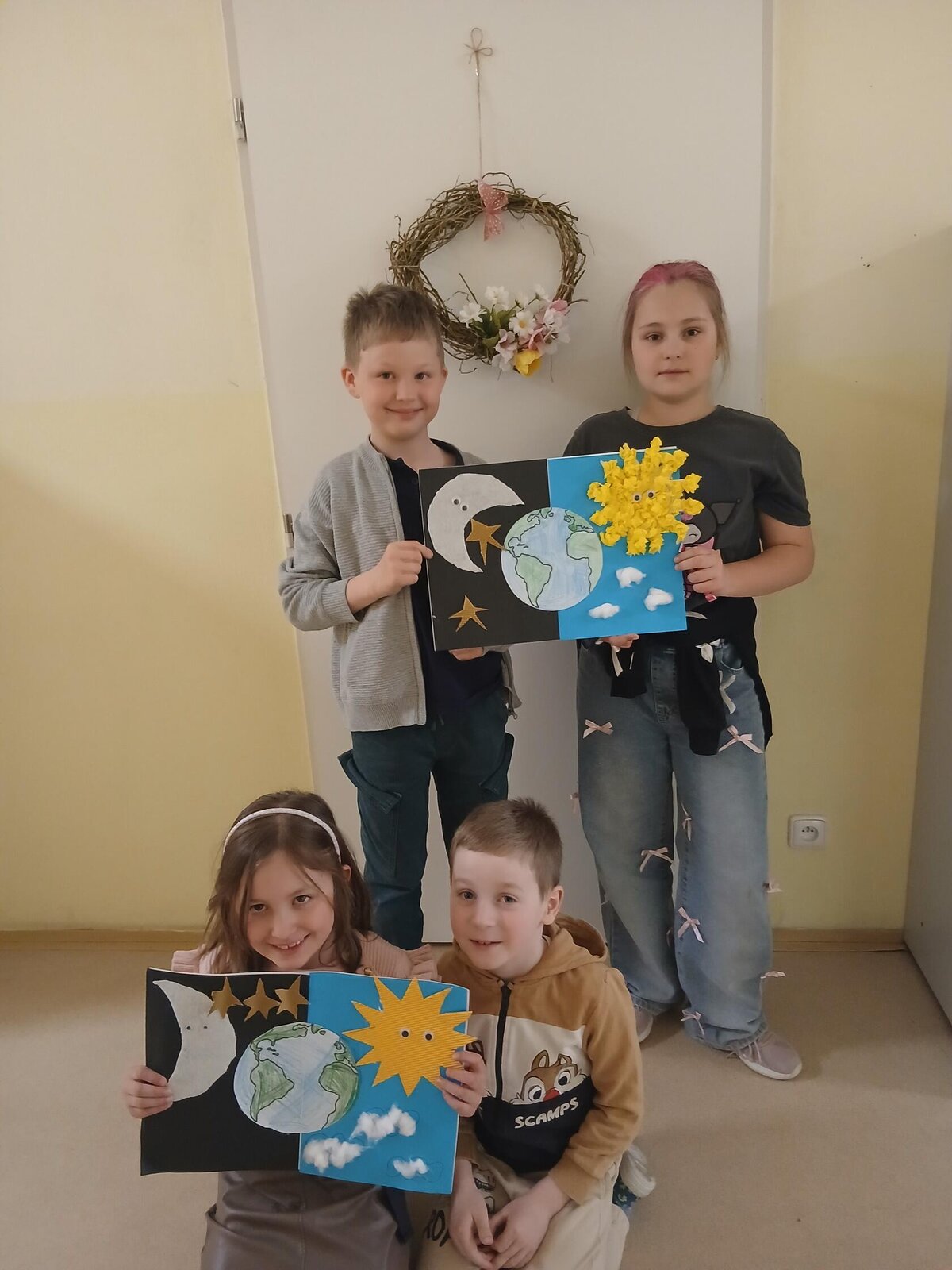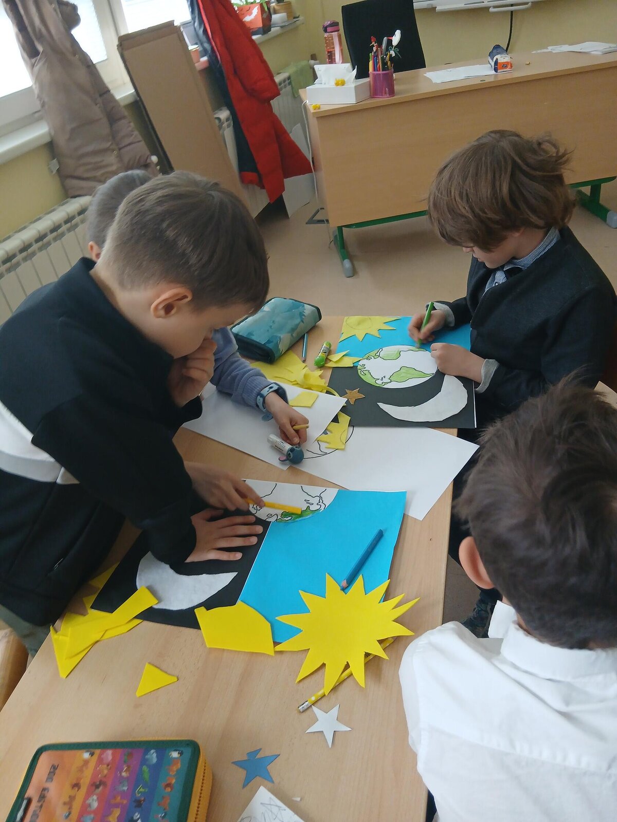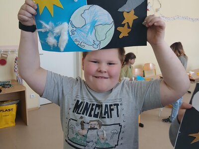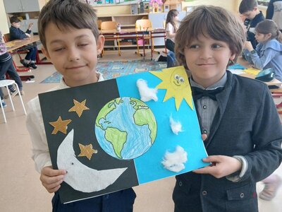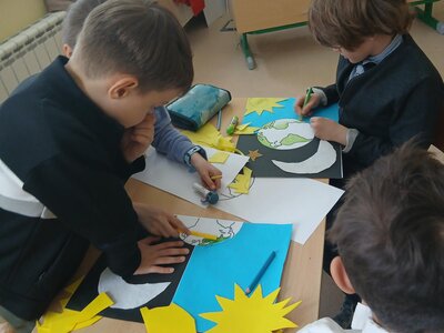 Děti se pustily do tvoření originálního obrázku, který znázorňuje naši planetu Zemi rozdělenou na den a noc. Na jedné straně nechybí měsíc a hvězdy, na druhé září sluníčko a obláčky.