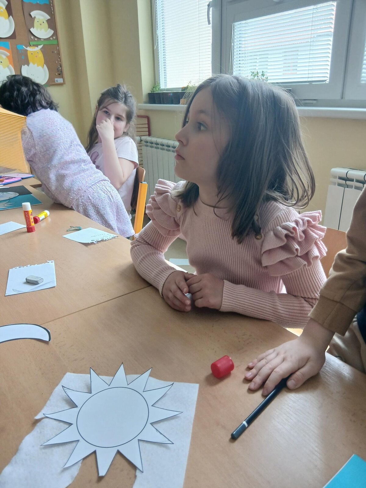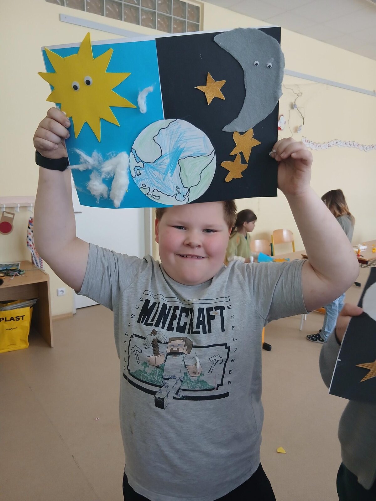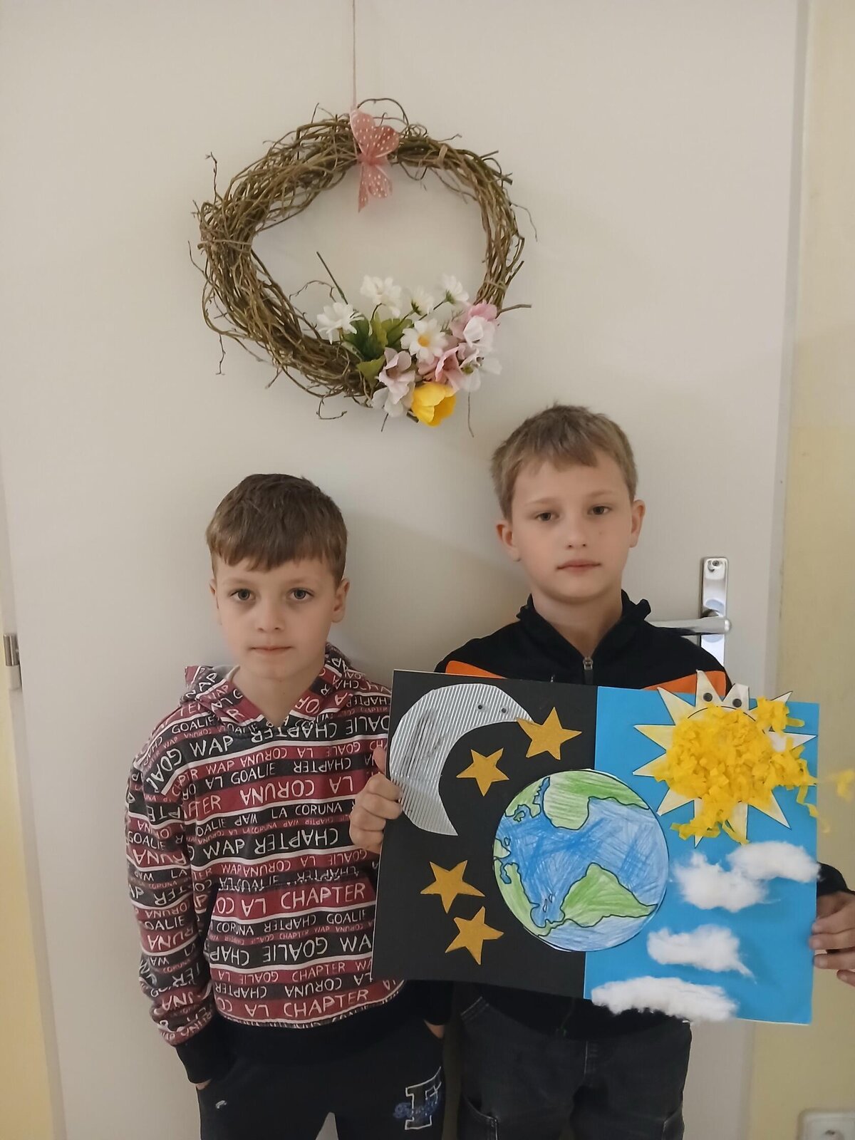 Děti se pustily do tvoření originálního obrázku, který znázorňuje naši planetu Zemi rozdělenou na den a noc. Na jedné straně nechybí měsíc a hvězdy, na druhé září sluníčko a obláčky.