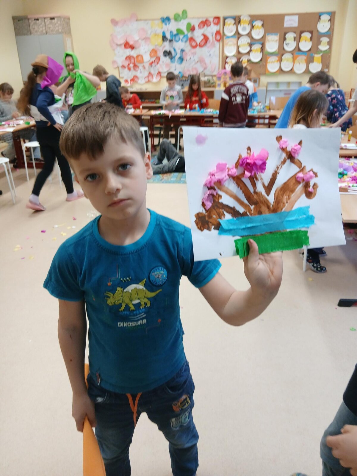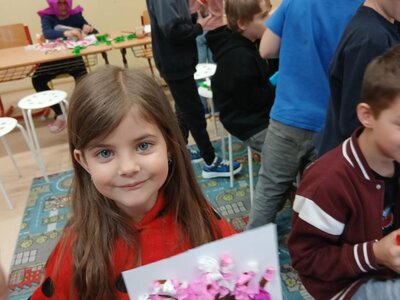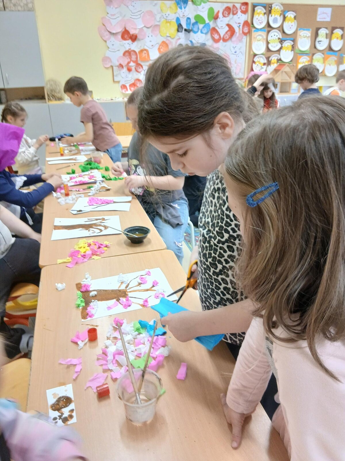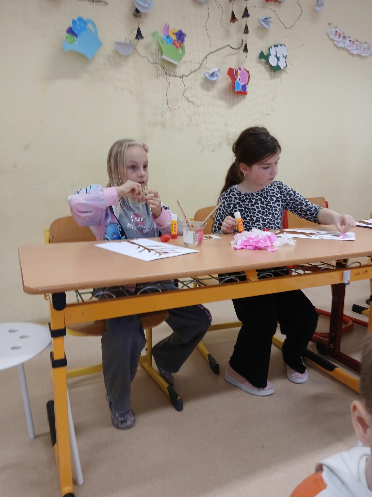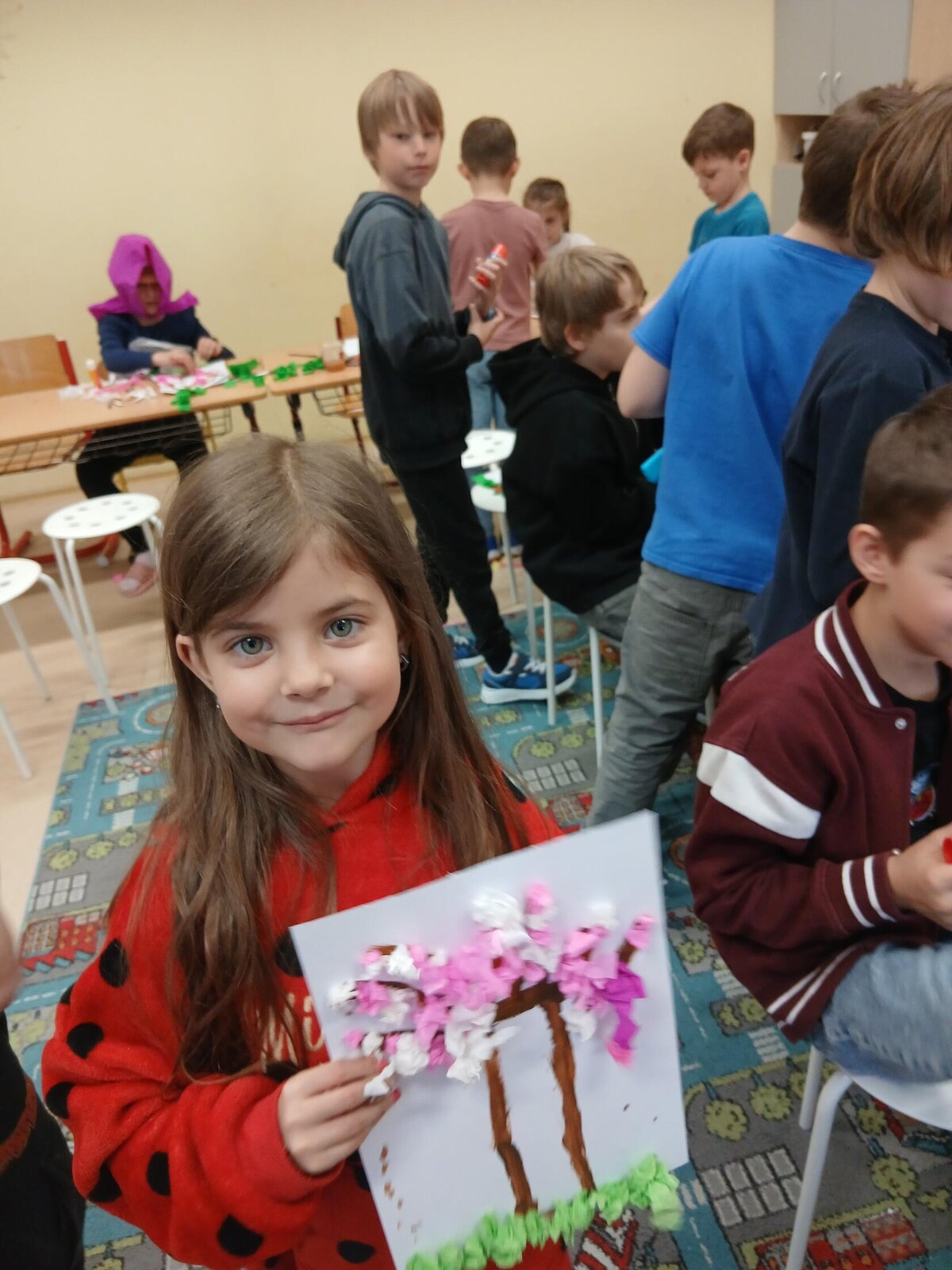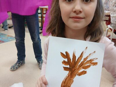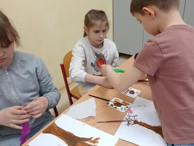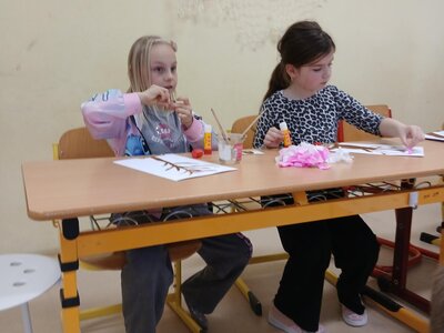 Ve školní družině jsme se věnovali jarnímu tvoření a výsledkem jsou krásné obrázky rozkvetlých stromů. Děti si nejprve namalovaly kmen a větve stromu, které následně ozdobily květy z mačkaného papíru. Kombinací růžové a bílé barvy vznikly něžné jarní květy, které dodaly obrázkům veselý a svěží vzhled.