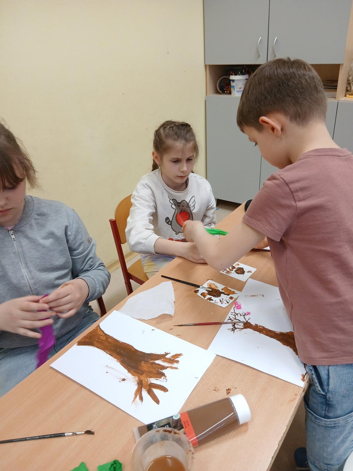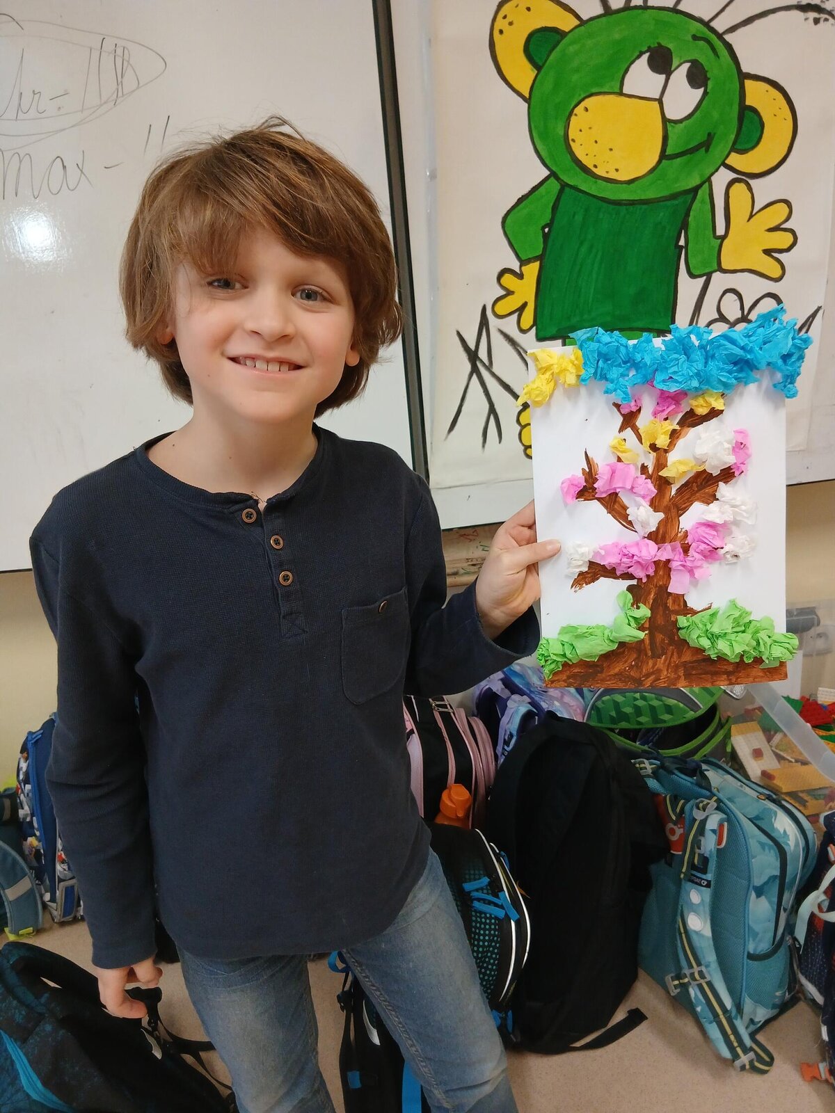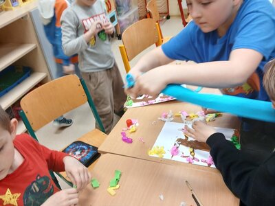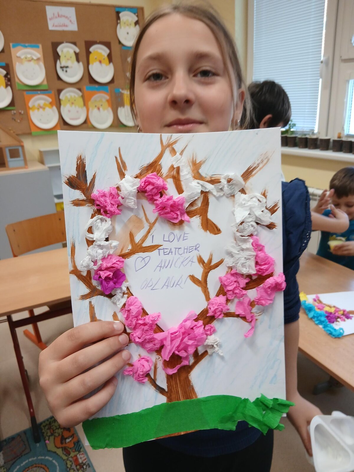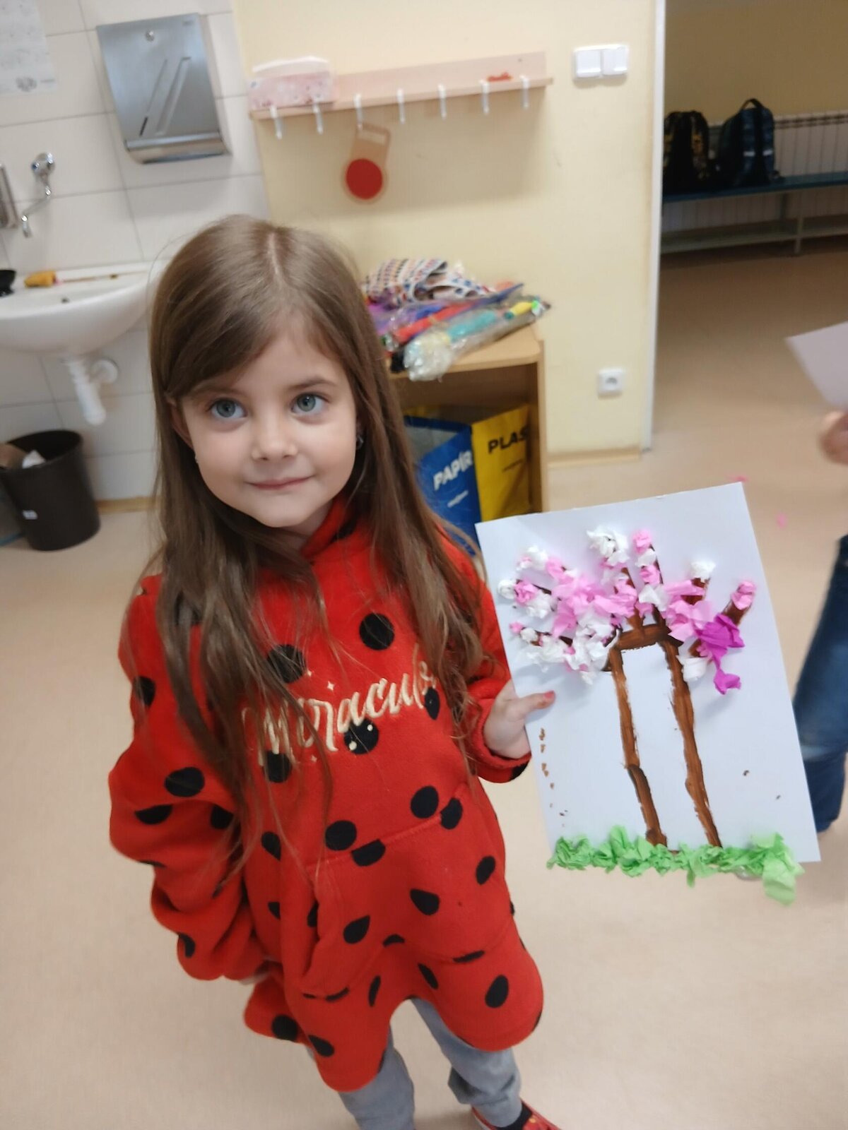 Ve školní družině jsme se věnovali jarnímu tvoření a výsledkem jsou krásné obrázky rozkvetlých stromů. Děti si nejprve namalovaly kmen a větve stromu, které následně ozdobily květy z mačkaného papíru. Kombinací růžové a bílé barvy vznikly něžné jarní květy, které dodaly obrázkům veselý a svěží vzhled.