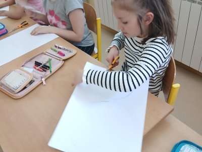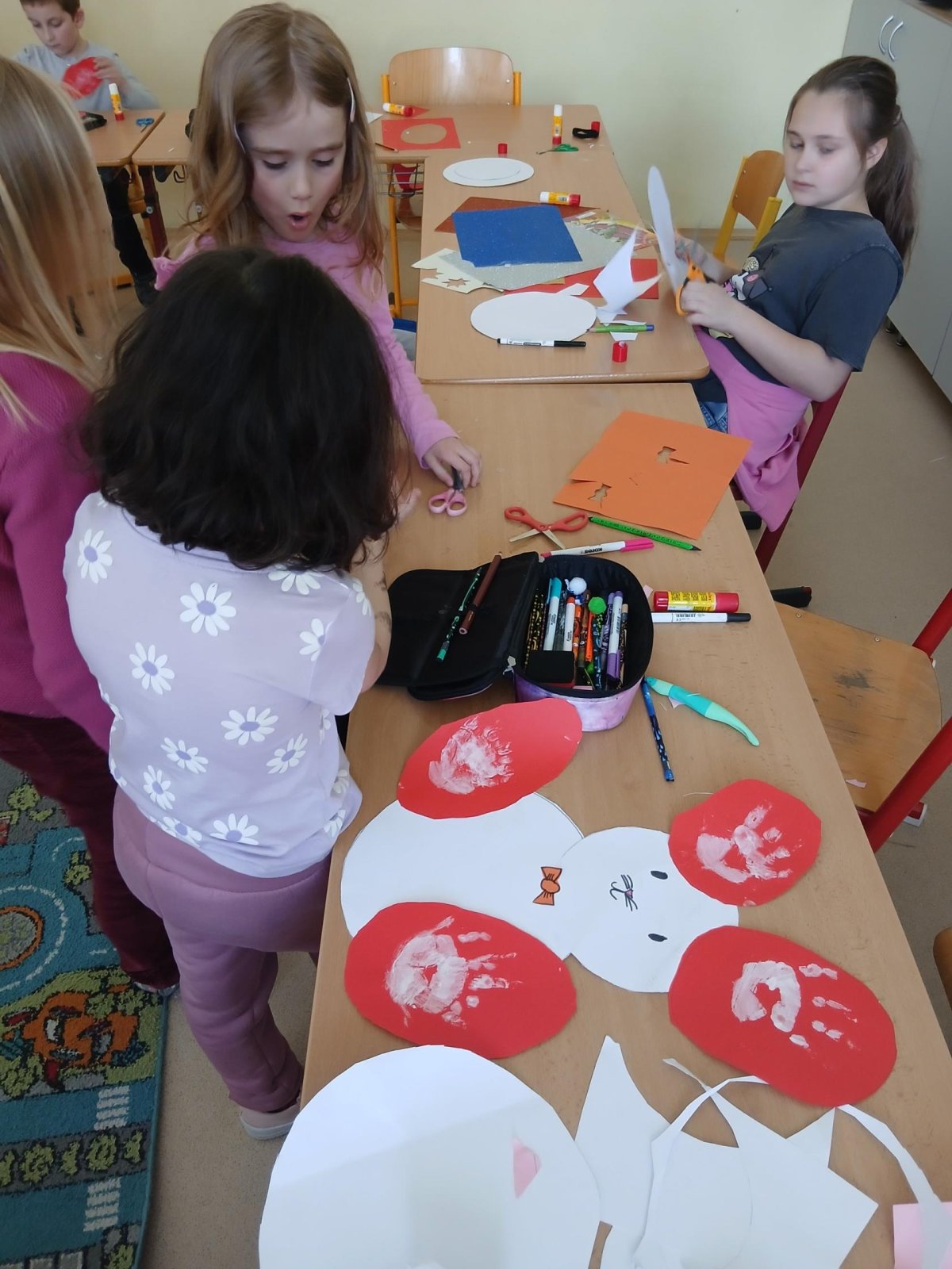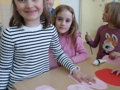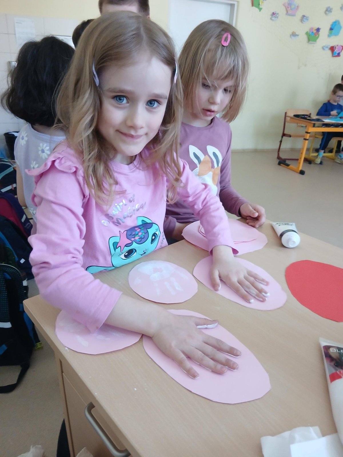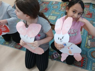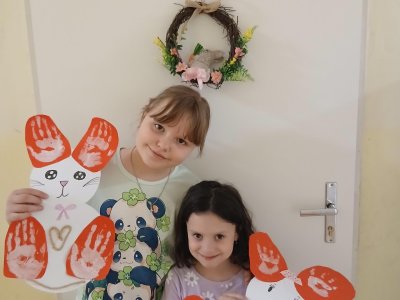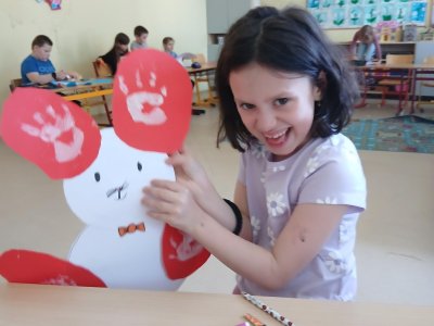 Nejprve si děti připravily základ z papíru, poté pomocí barev vytvořily otisky svých dlaní, které se proměnily v roztomilé detaily zajíčka. Při práci jsme si povídali o velikonočních tradicích a symbolech jara.
