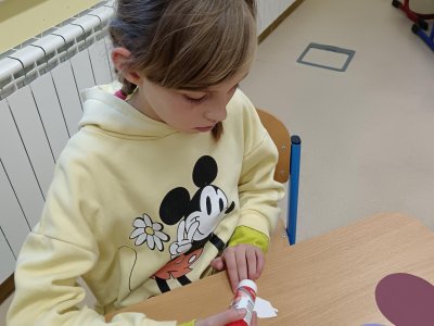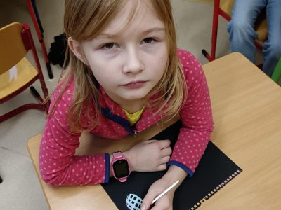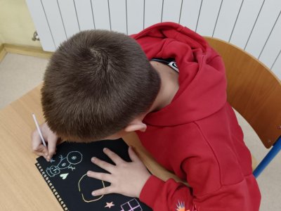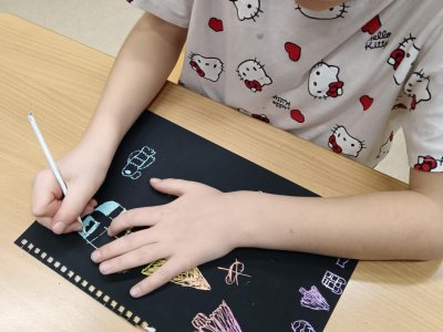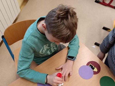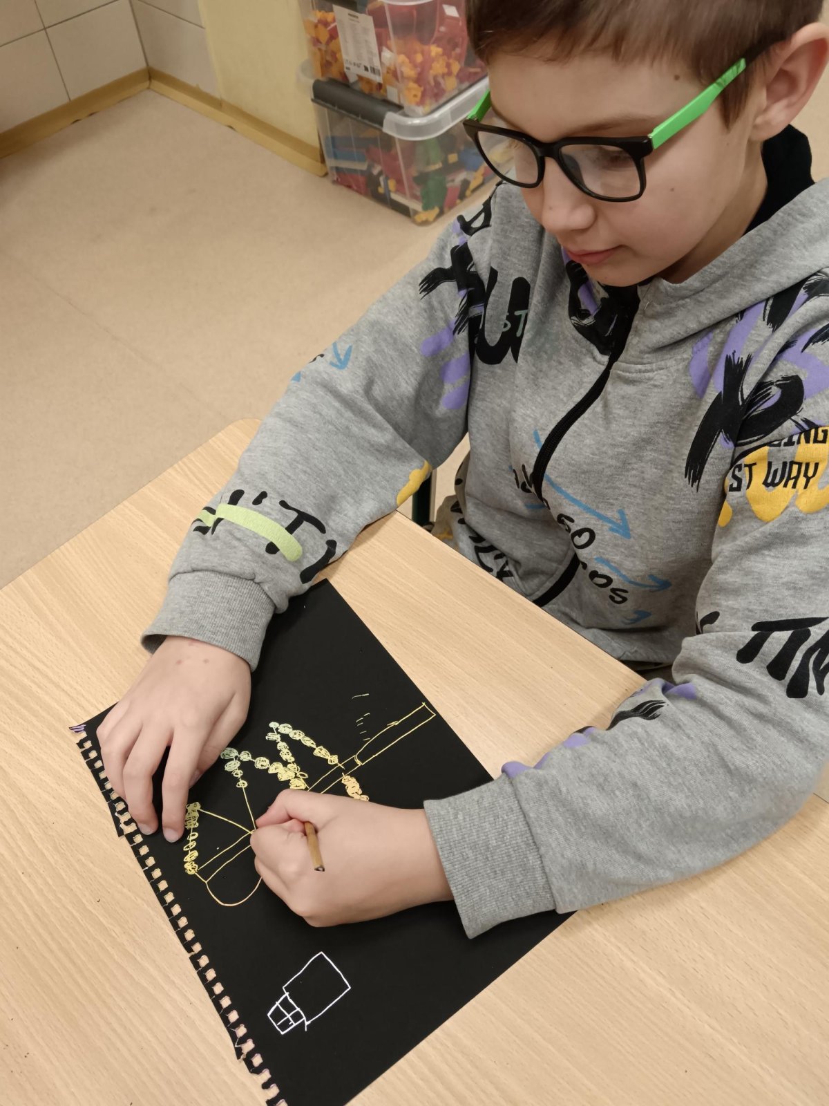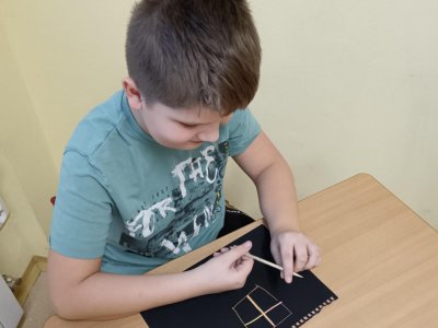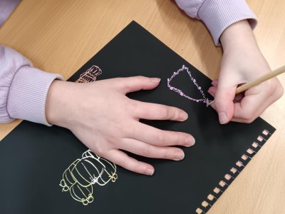 Děti vyráběly vánoční ozdoby na stromeček pomocí vyškrabávacích obrázků. Vytvořily se tak barevné a originální motivy. S radostí objevovaly skryté barvy pod černou vrstvou a každá ozdoba tak získala jedinečný vzhled.