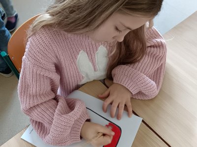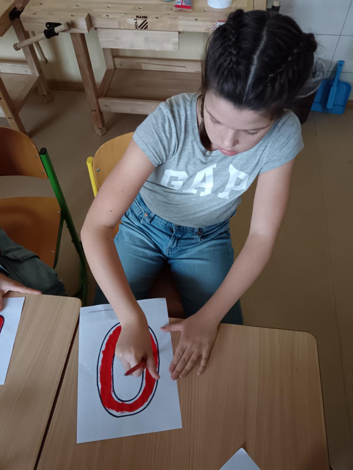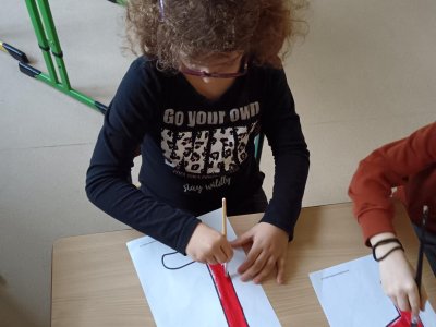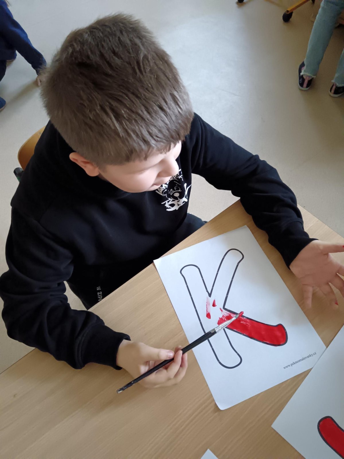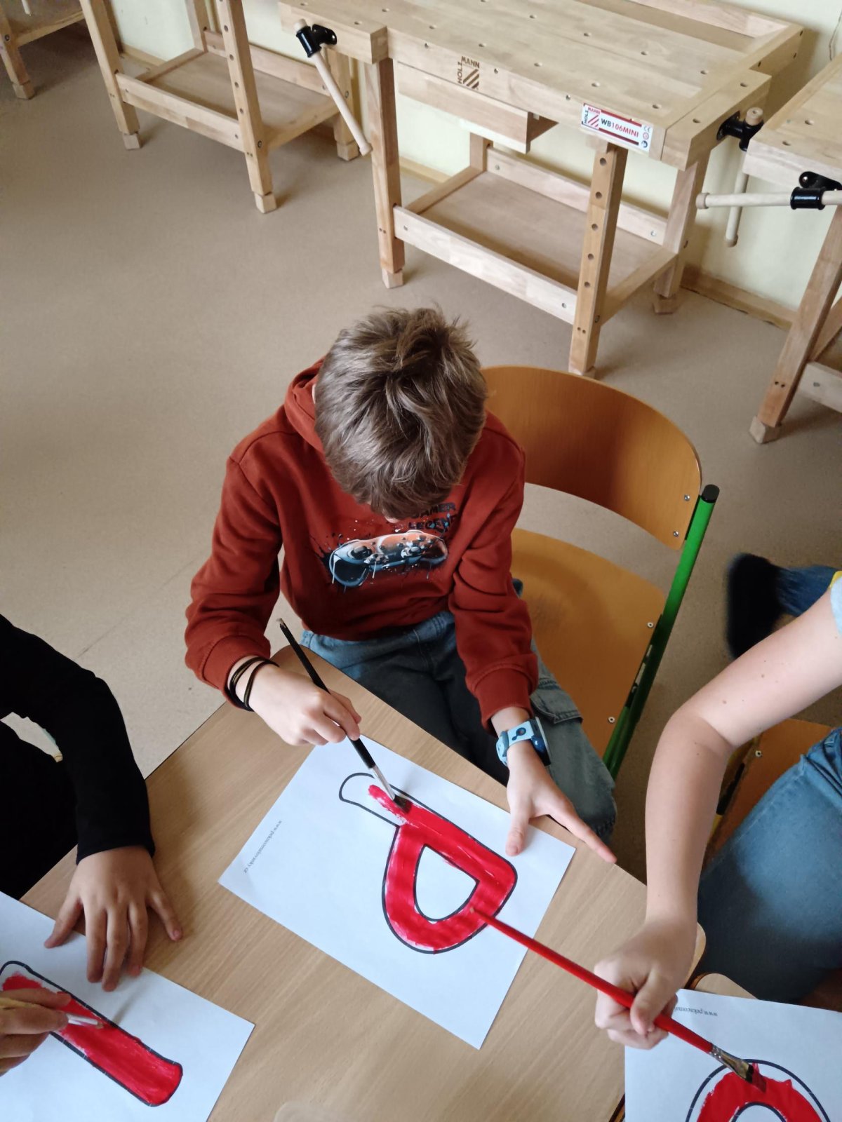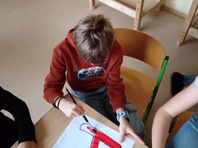 Děti se podílely na výrobě velkého nápisu PEKLO, který bude zdobit čertovskou scénu. S nadšením vybarvovaly písmenka, aby vznikl působivý a strašidelný nápis. Celá výroba probíhala v příjemné atmosféře.