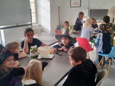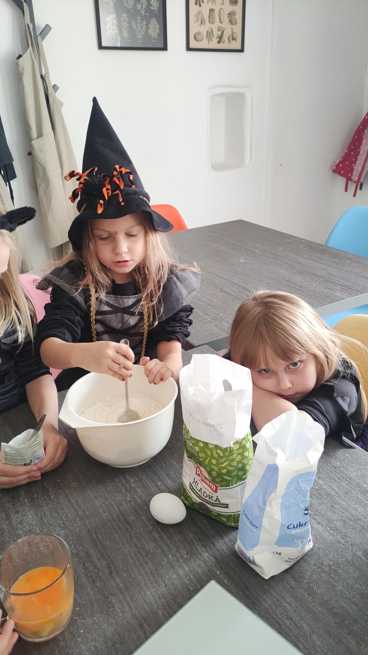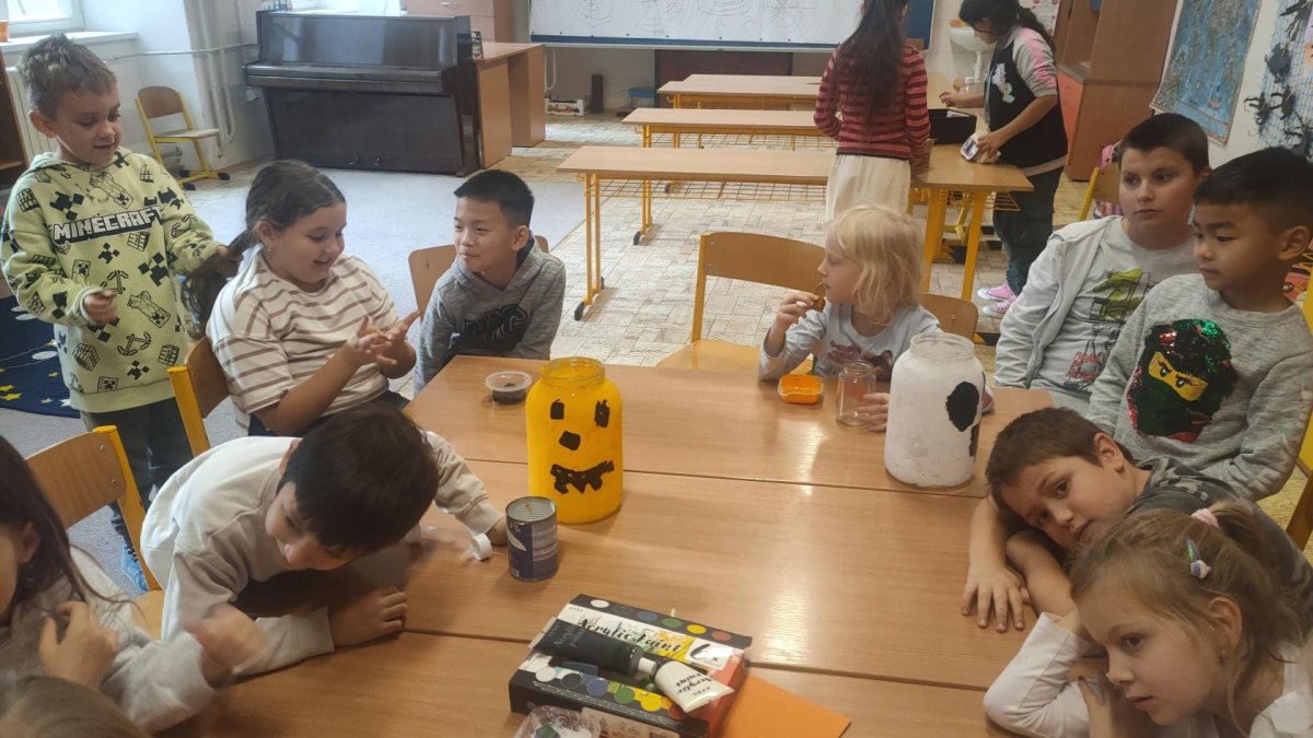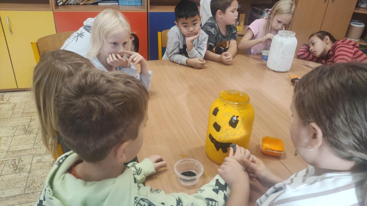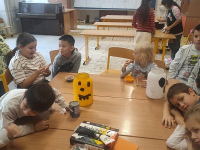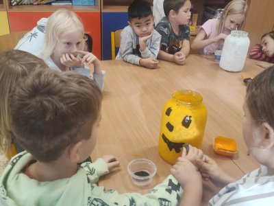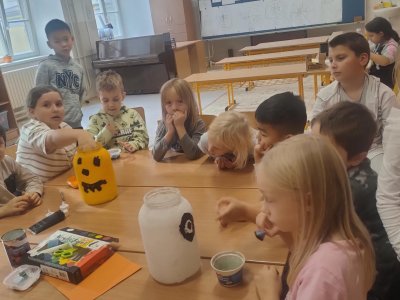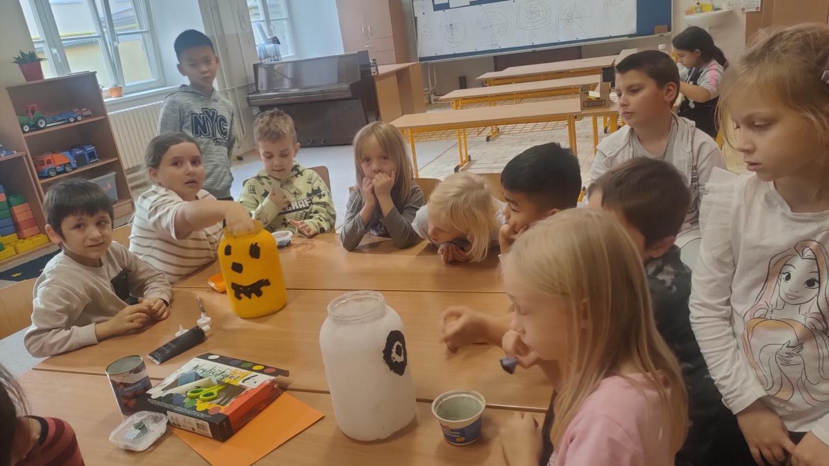 Začali jsme výrobou lampiček, ať se v té mlhavé podzimní atmosféře neztratime a tolik se nebojíme. Na zavařovací sklenice stačí nanést houbičkou akrylovou barvu podle toho, jestli chceme vytvořit dýni nebo bílého ducha. Potom obličej, nechat zaschnout a lampičky rozsvítime světelnými řetězy. V šeru schodiště působily tak tajemně.