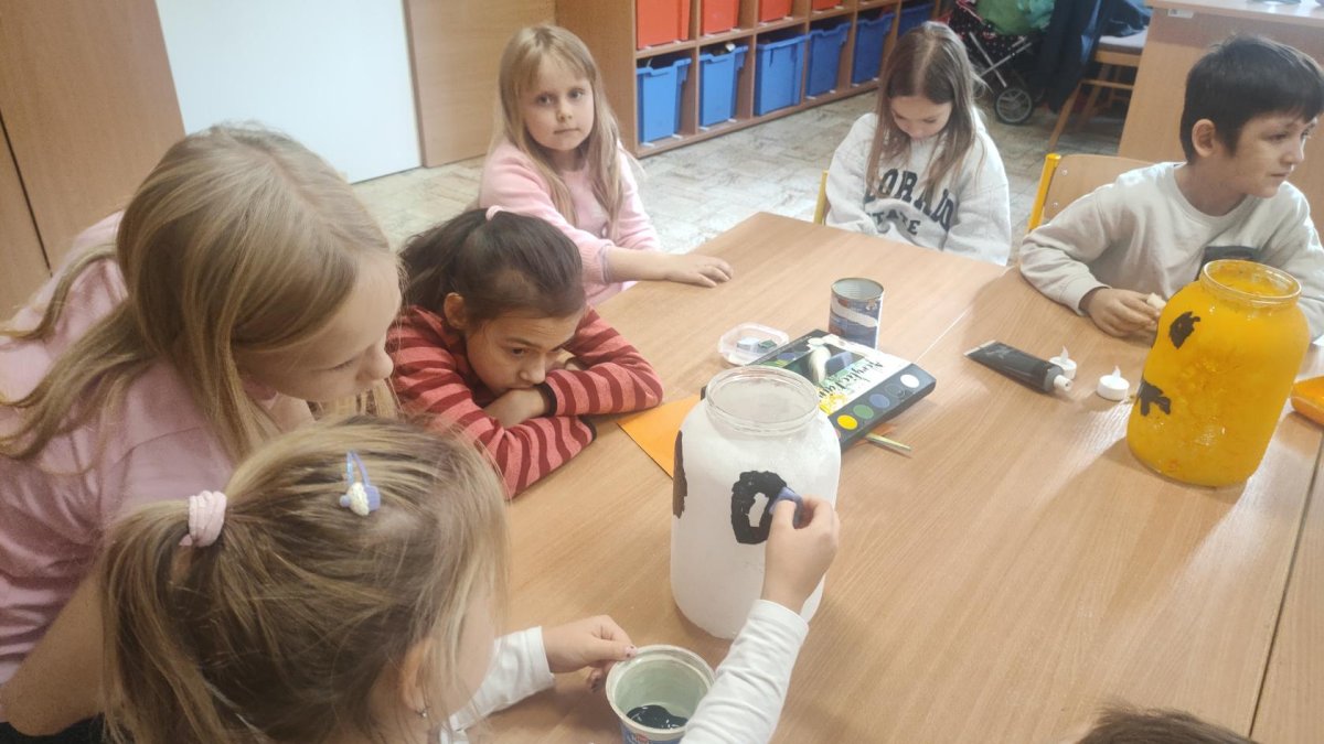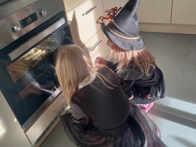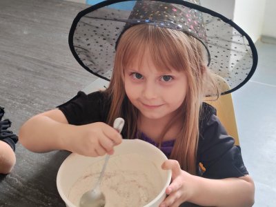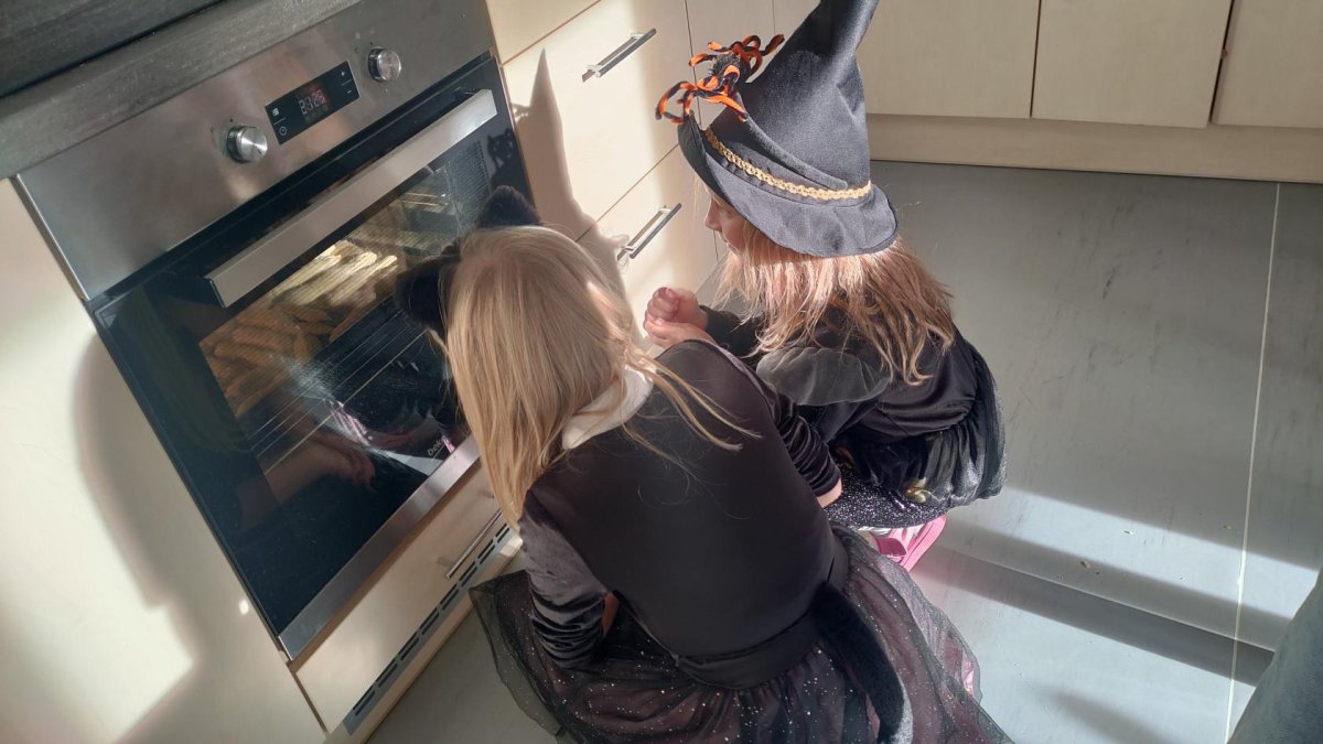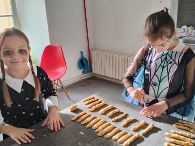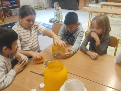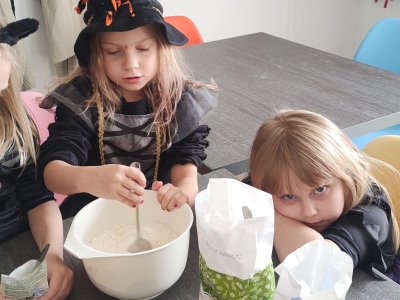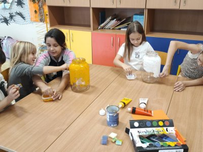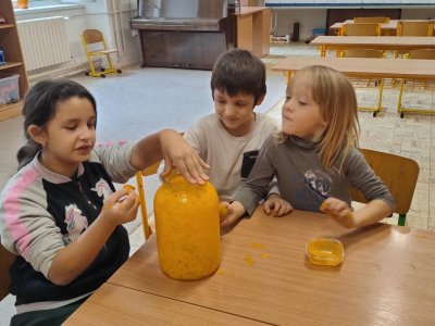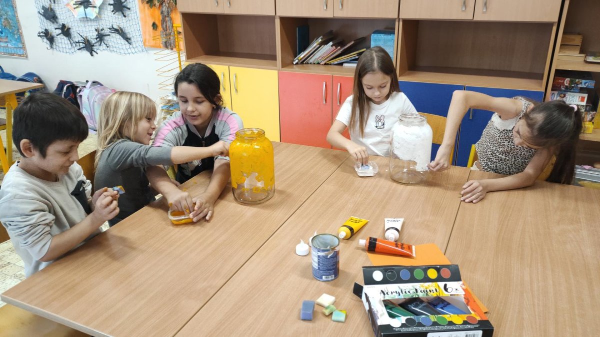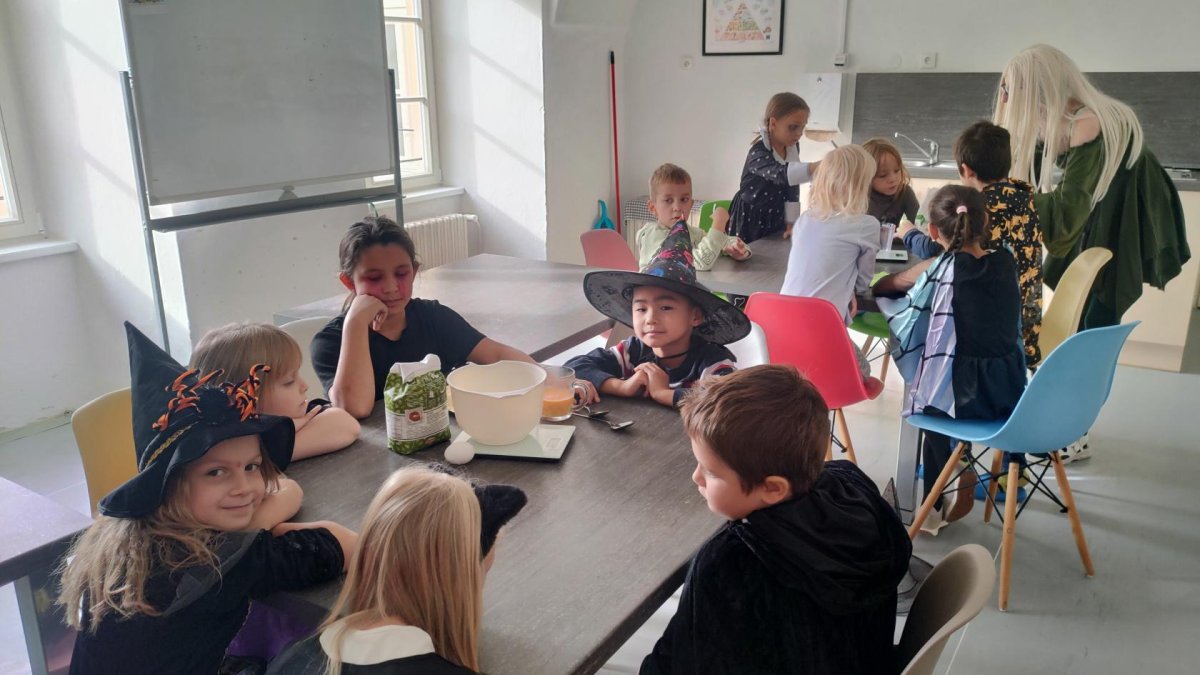 Začali jsme výrobou lampiček, ať se v té mlhavé podzimní atmosféře neztratime a tolik se nebojíme. Na zavařovací sklenice stačí nanést houbičkou akrylovou barvu podle toho, jestli chceme vytvořit dýni nebo bílého ducha. Potom obličej, nechat zaschnout a lampičky rozsvítime světelnými řetězy. V šeru schodiště působily tak tajemně.