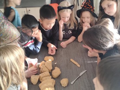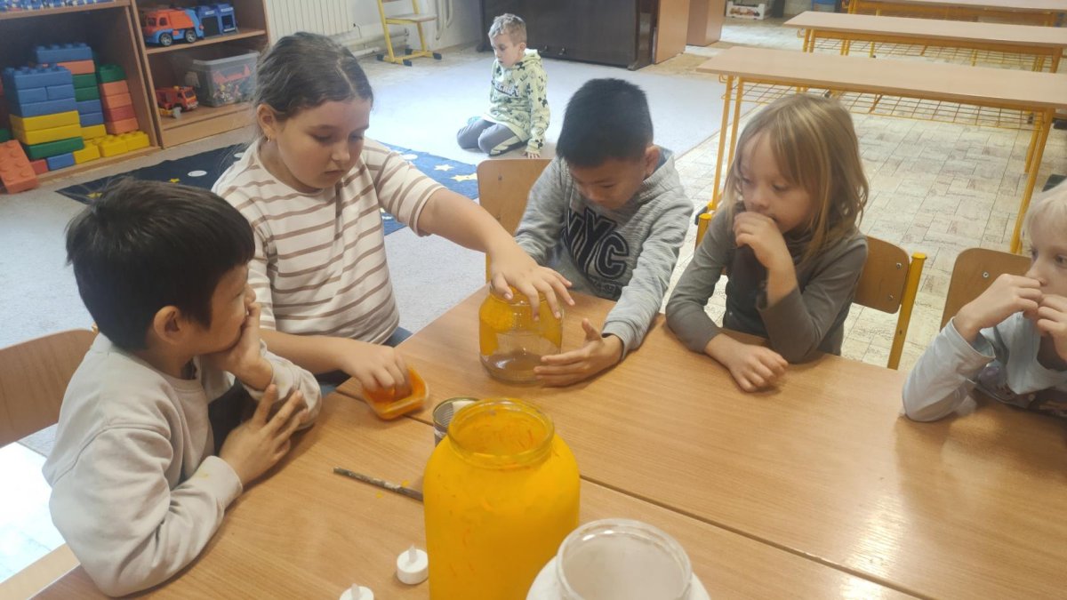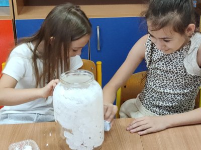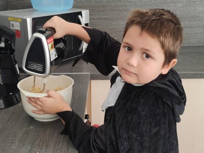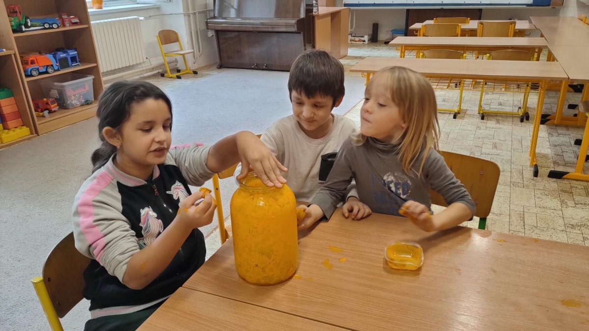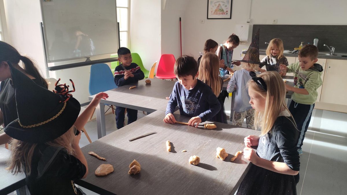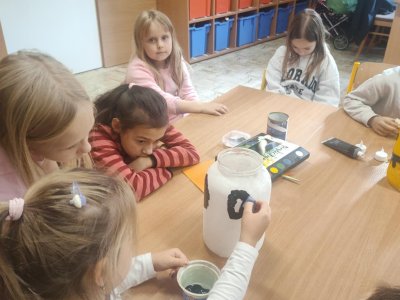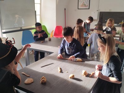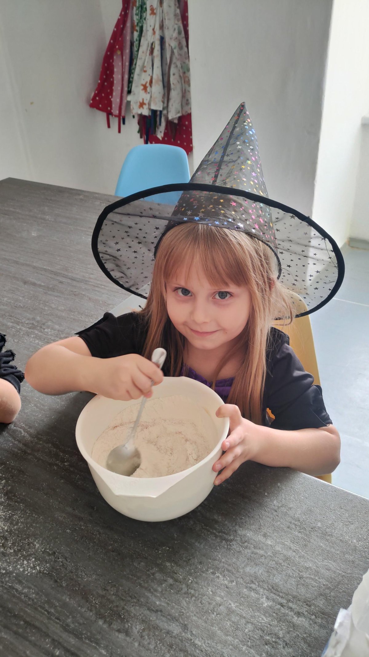 Začali jsme výrobou lampiček, ať se v té mlhavé podzimní atmosféře neztratime a tolik se nebojíme. Na zavařovací sklenice stačí nanést houbičkou akrylovou barvu podle toho, jestli chceme vytvořit dýni nebo bílého ducha. Potom obličej, nechat zaschnout a lampičky rozsvítime světelnými řetězy. V šeru schodiště působily tak tajemně.