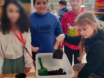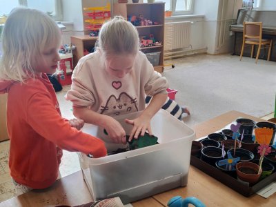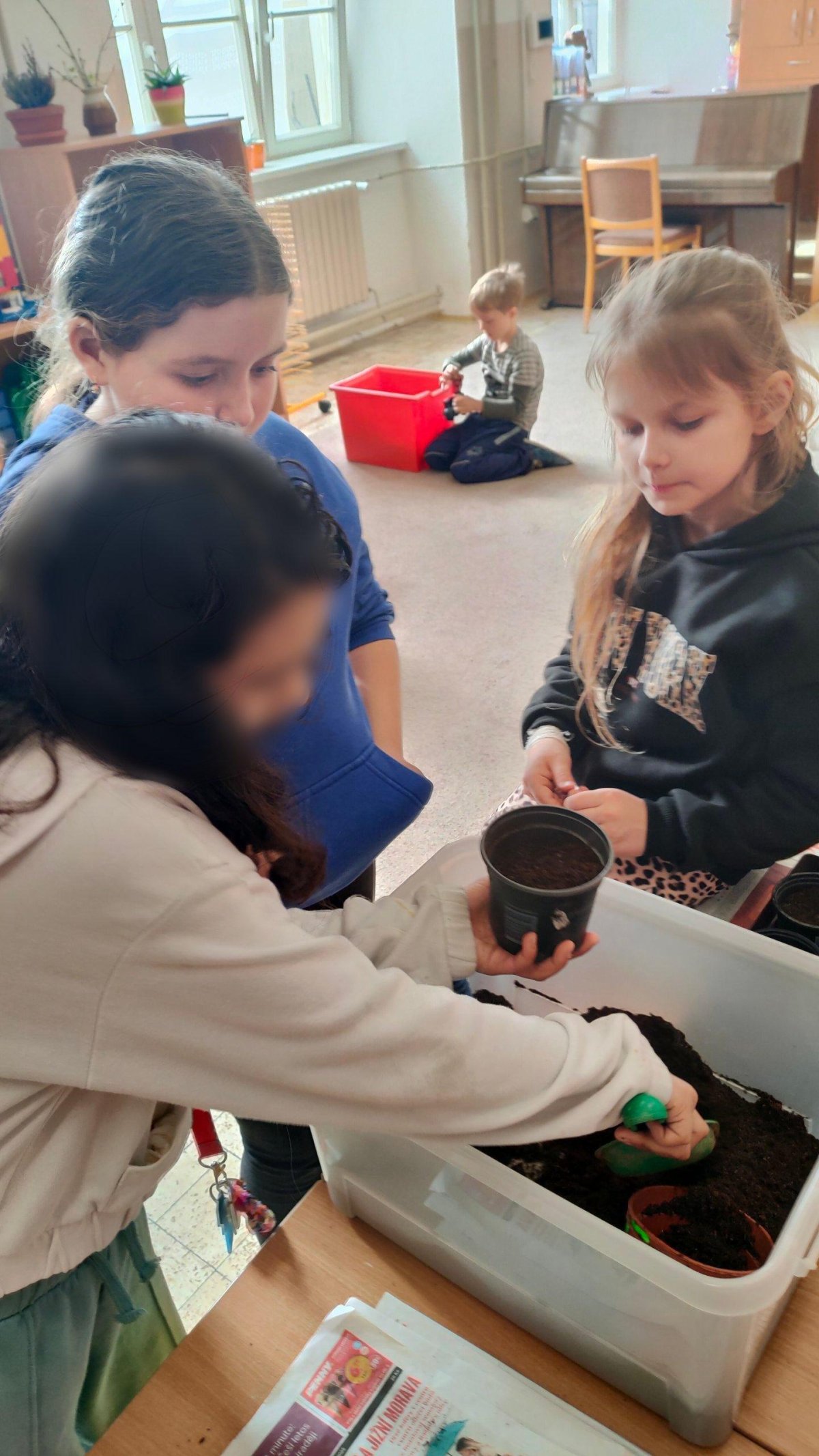 Připravené květináčky děti plnily zeminou, vysévaly semínka bylinek a následně zalévaly vodou z konvičky. Práce s hlínou děti zlákala, takže po chvíli odkládaly lopatky a hlínu promíchávaly a nabíraly holýma rukama. Měli jsme všichni špinavé (nejen) ruce, ale to k pořádné práci patří.