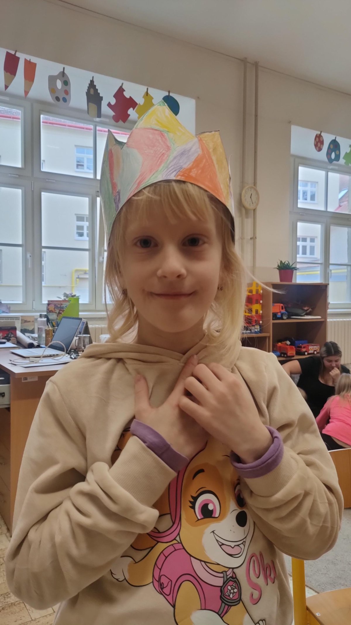 Protože jsme si královskou korunu vyrobili skoro všichni, byla králů plná družina. Tentokrát nám stačil na výrobu tvrdý bílý papír, pastelky a nůžky.