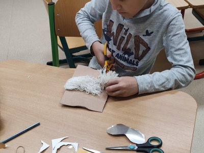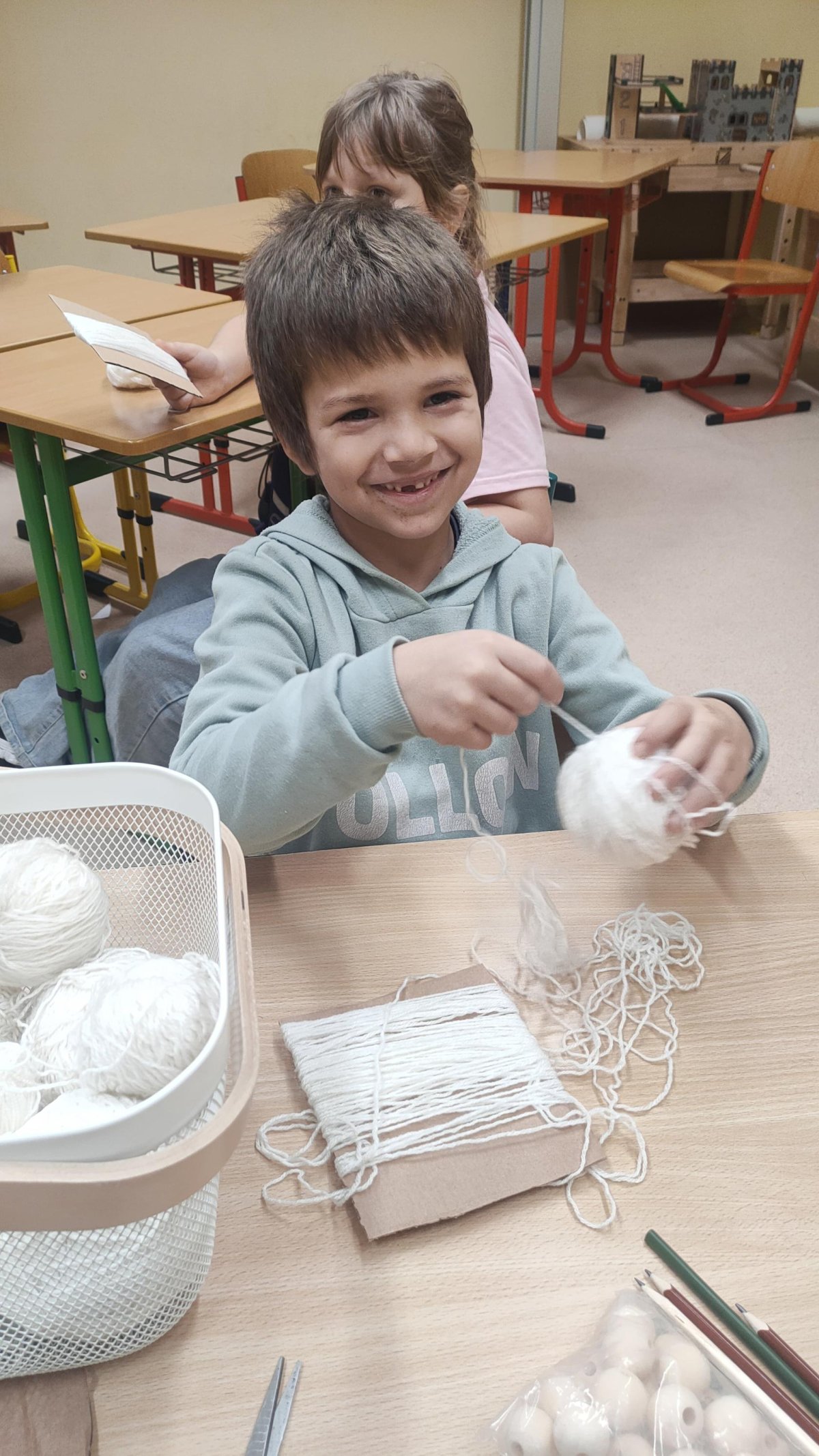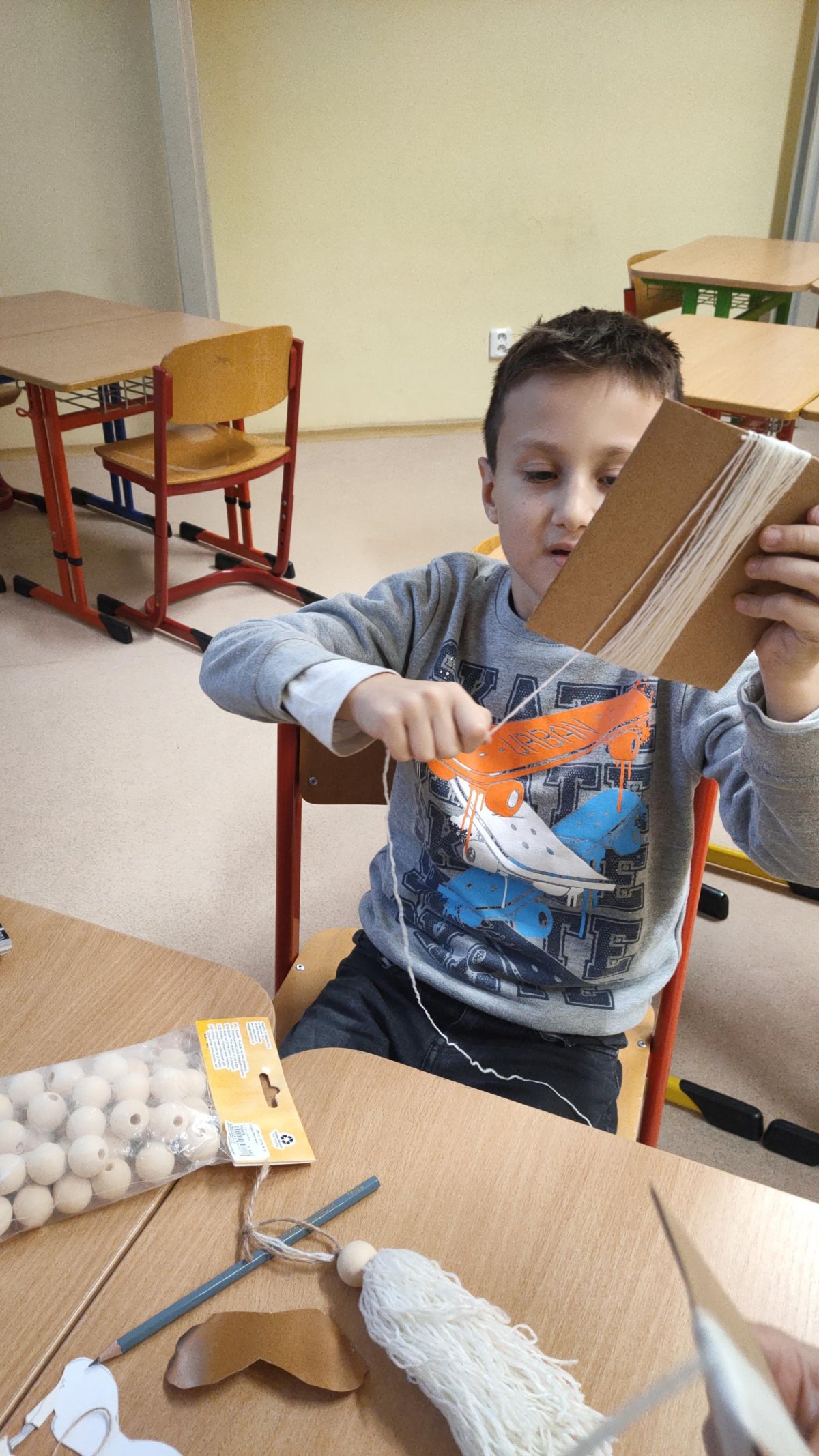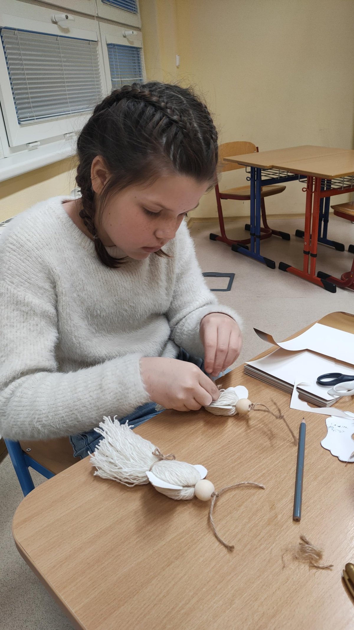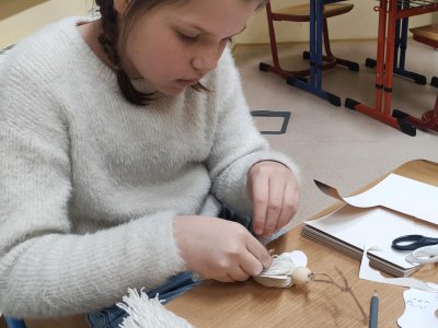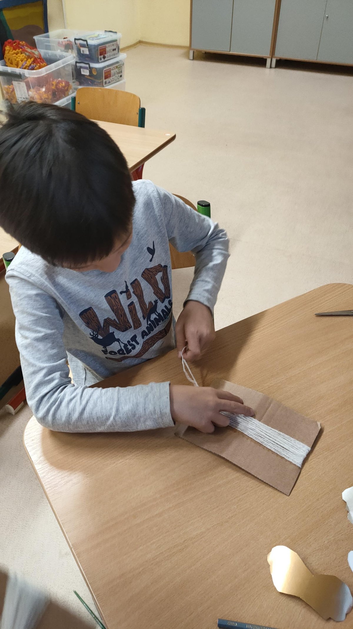 Výroba andílků od nás vyžadovala značnou trpělivost při práci s přízí, zato následný výběr a stříhání třpytivého papíru byla pro nás příjemná odměna.