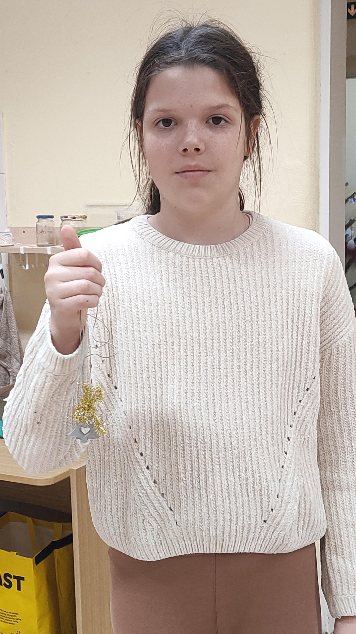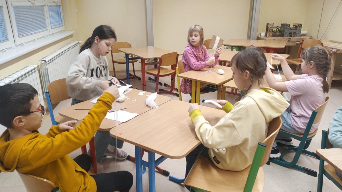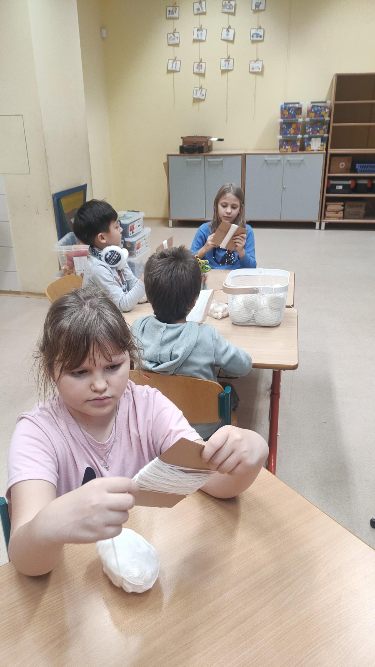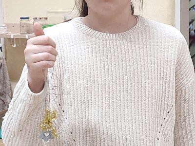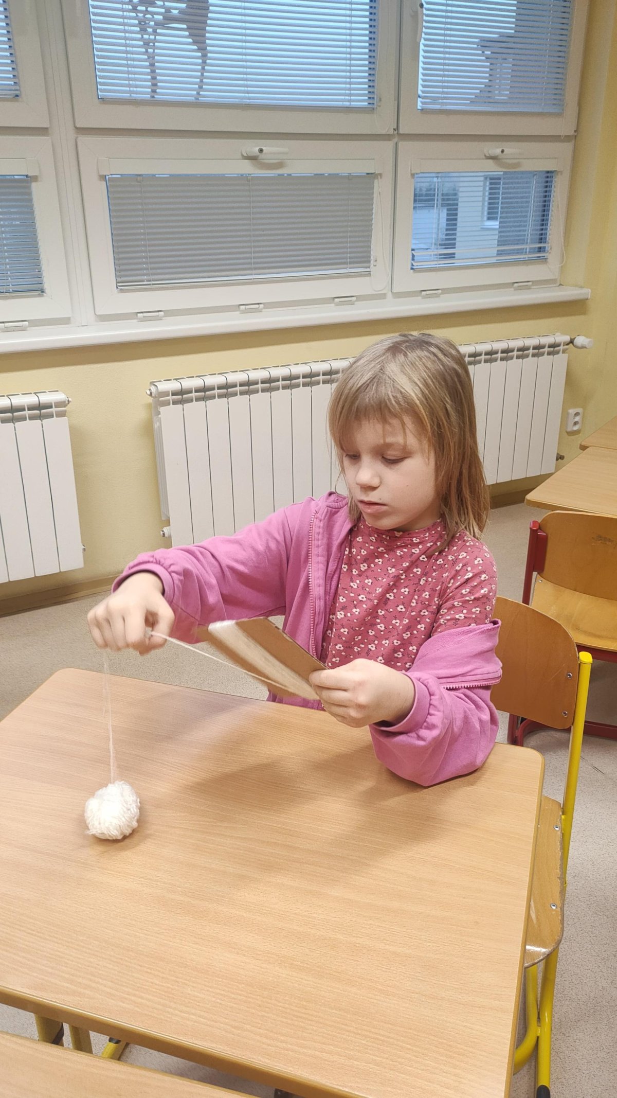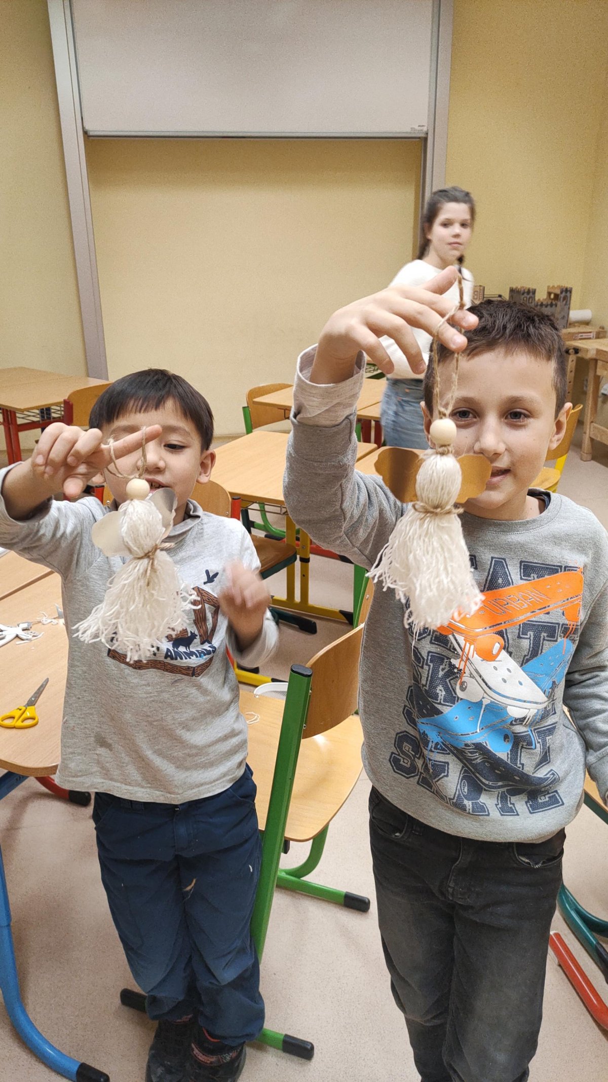 Výroba andílků od nás vyžadovala značnou trpělivost při práci s přízí, zato následný výběr a stříhání třpytivého papíru byla pro nás příjemná odměna.