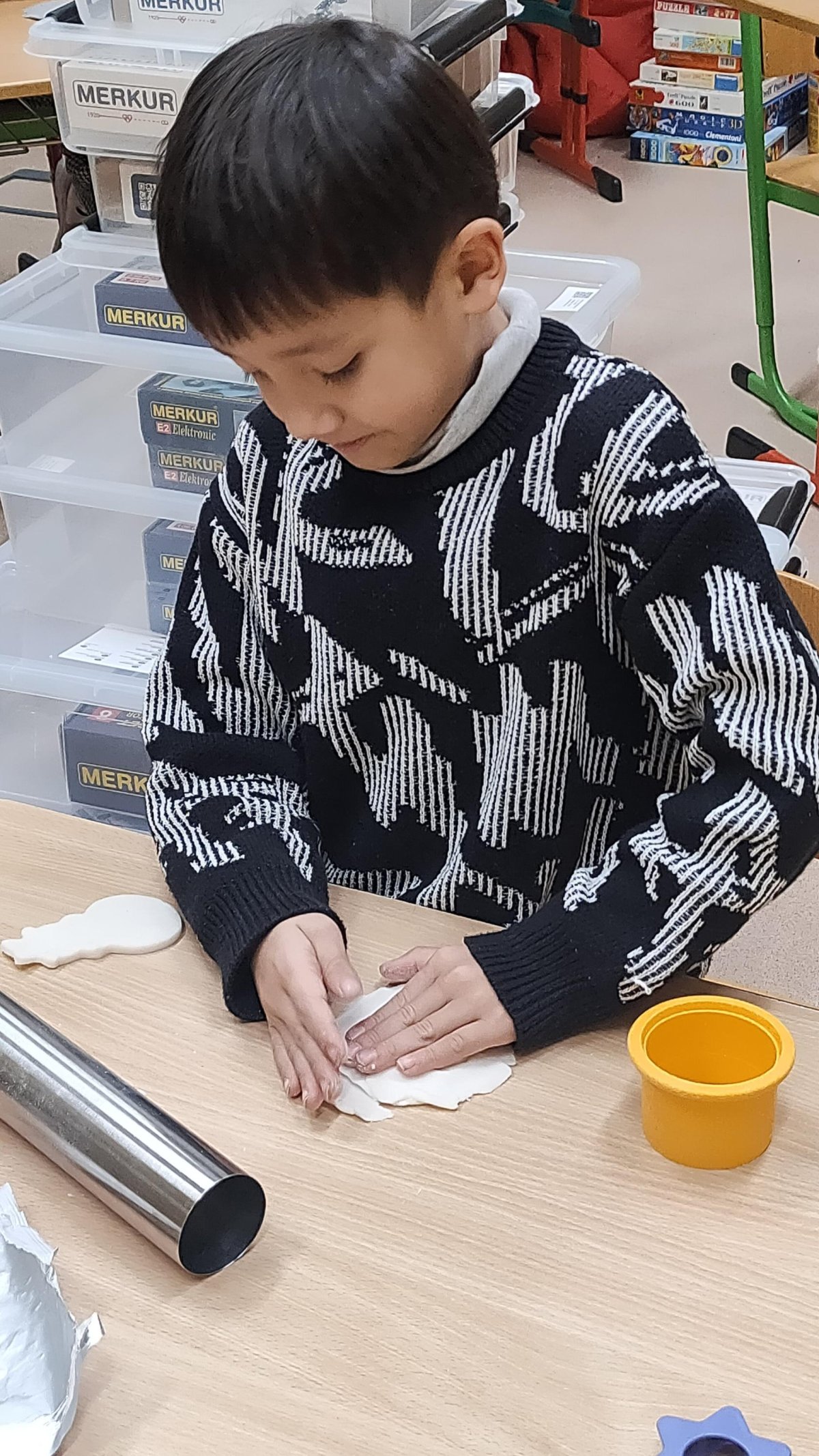 K vykrajování vánočních ozdob jsme využili samotvrdnouci hmotu a studený porcelán. Ty jsme následně nabarvili akrylovými barvami a dozdobili třpytivými doplňky.