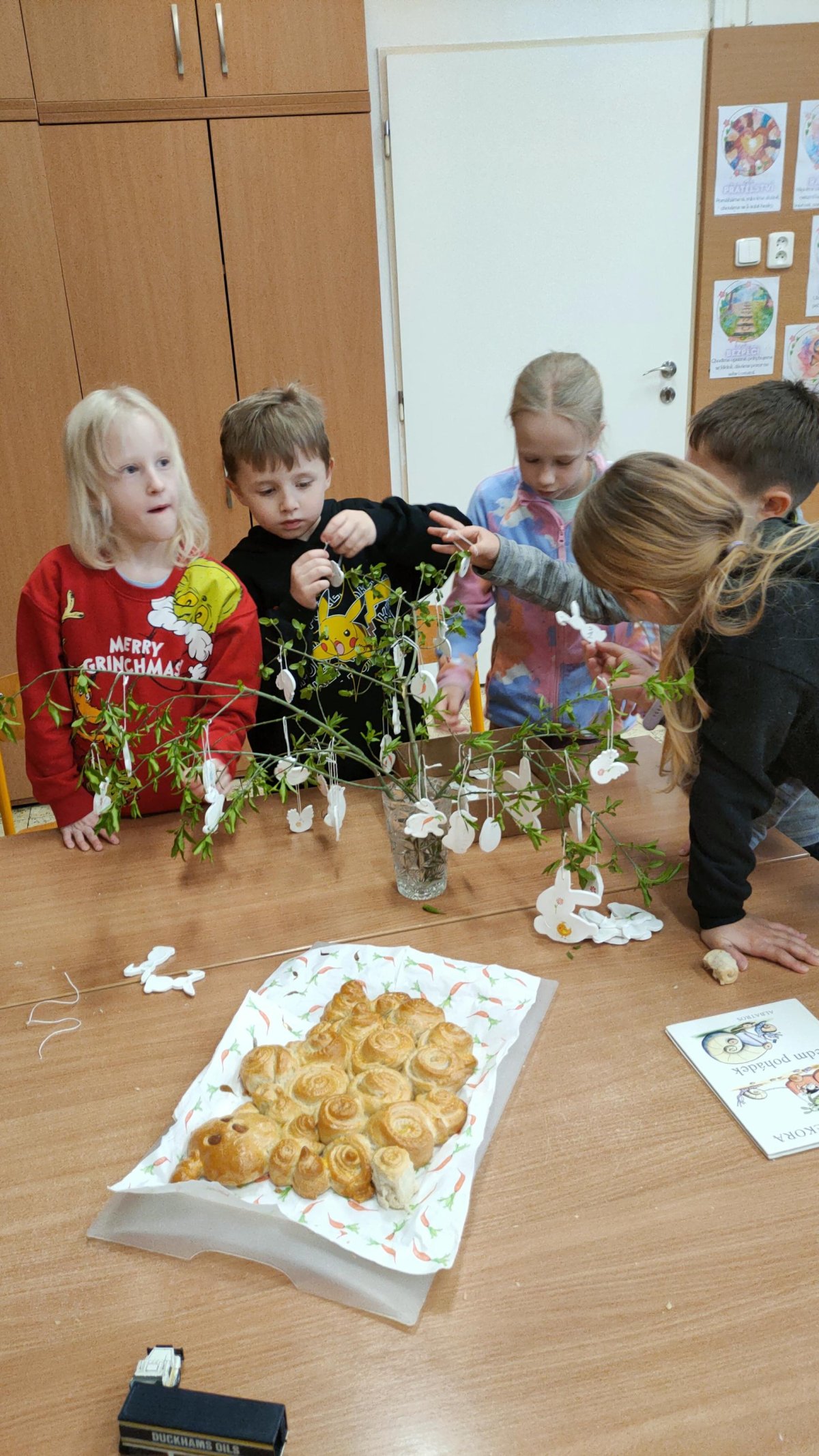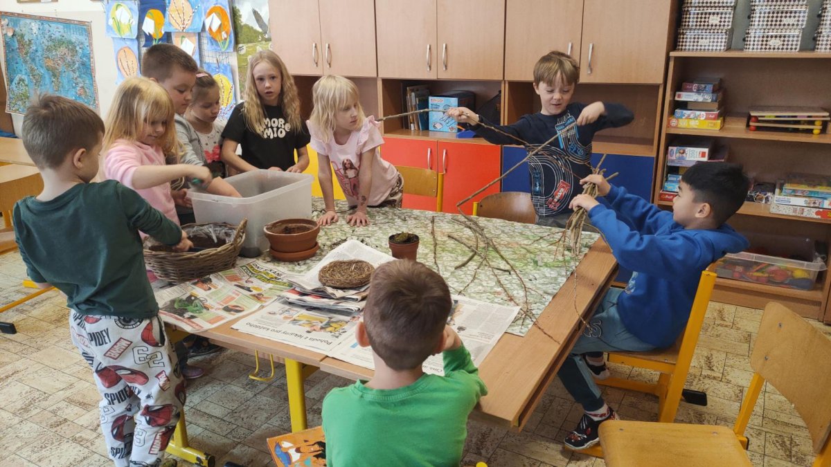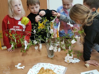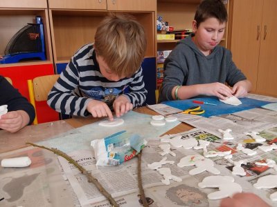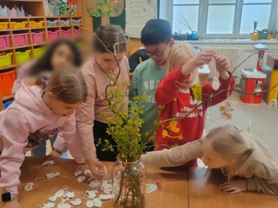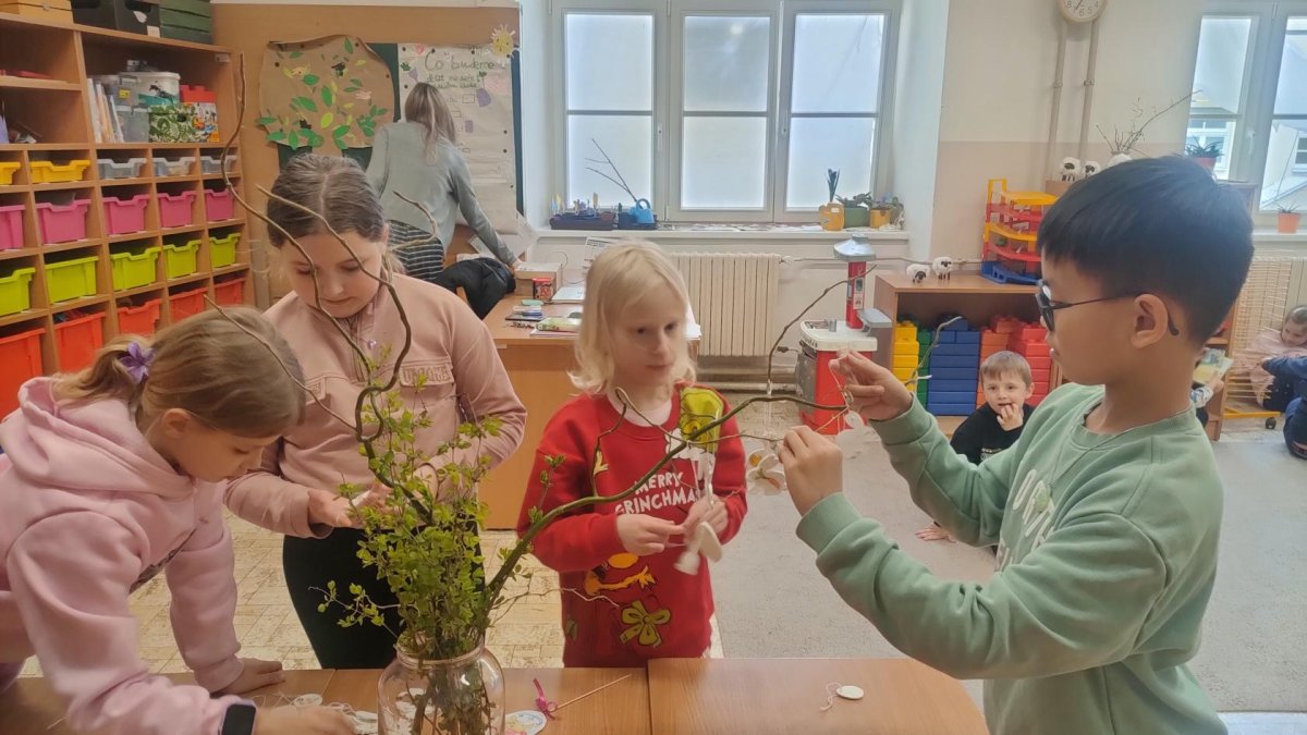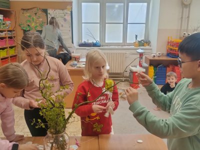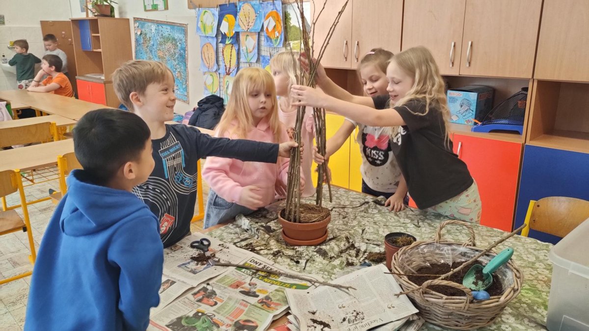 Podívejte, jak jsme si letos pohráli s velikonoční výzdobou. Ve vypěstovaném zeleném osení se schovávaji slepičky, jarní větvičky zdobí vajíčka a zajíčci a stádo oveček jsme oblékli do vlněných kabátků . Přinesli jsme si jaro až do školy a každý den nám dělá radost a dobrou náladu.