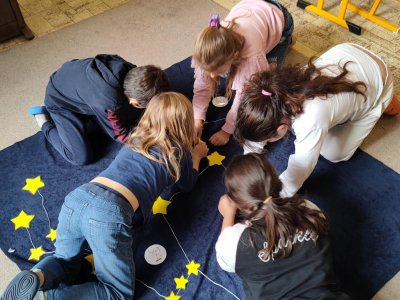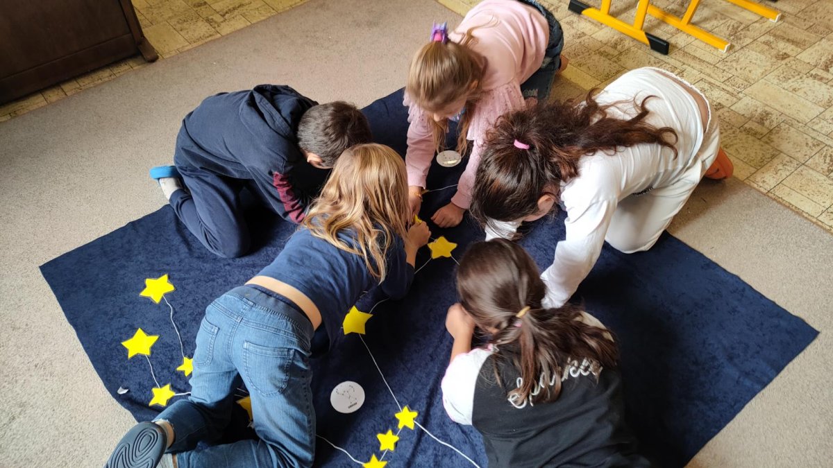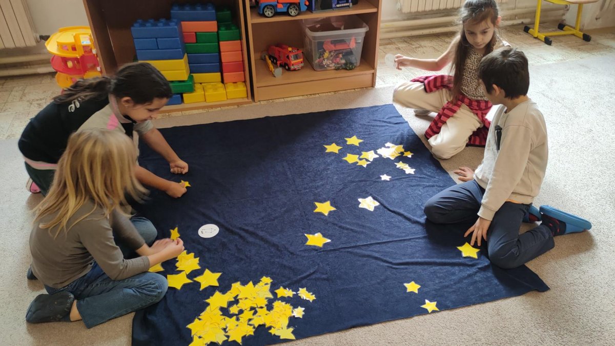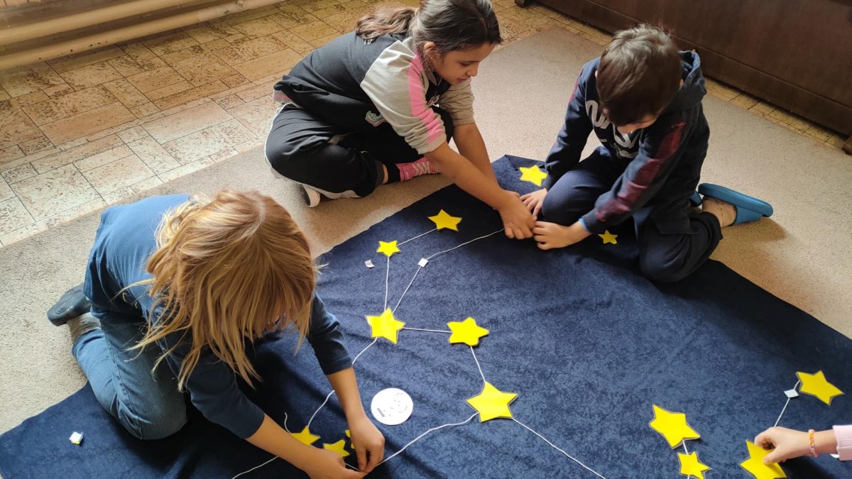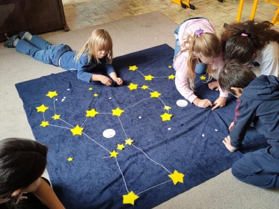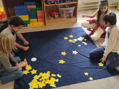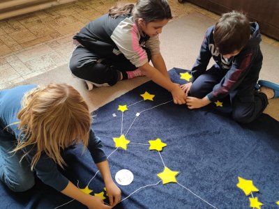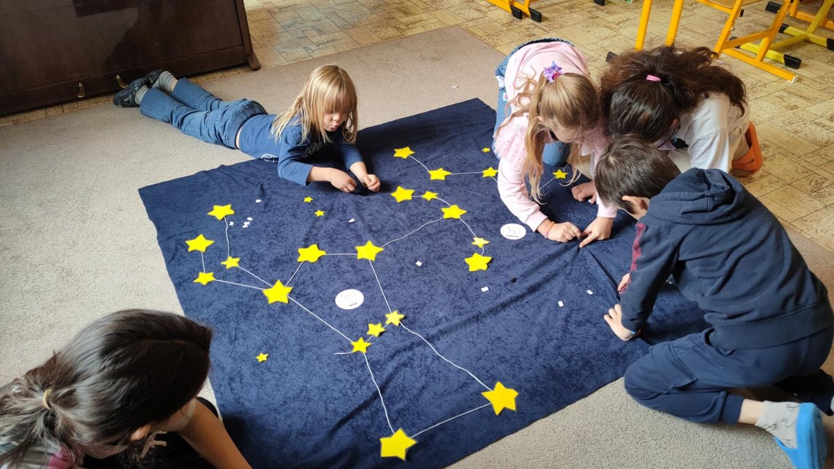 Potom nás čekala výroba hvězd. Hodně hvězd. A ty byly potřeba na venkovní vesmírnou výstavu. Podařilo se nám z nich sestavit známé souhvězdí Orion a souhvězdí Kasiopea. Bylo to zábavné, protože jsme si s hvězdami mohli i pohrát a sestavit jakékoliv jiné souhvězdí.