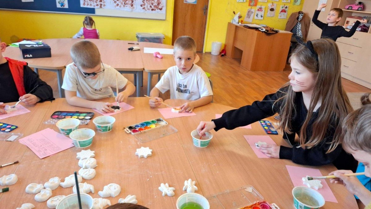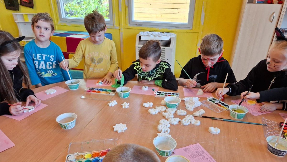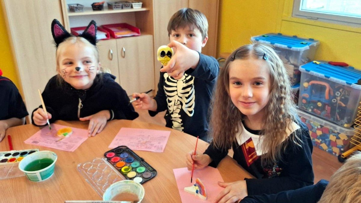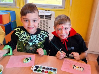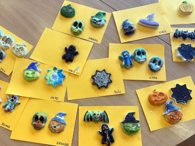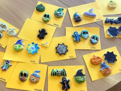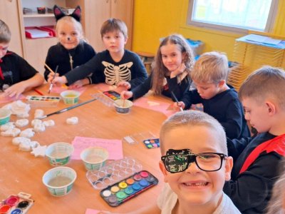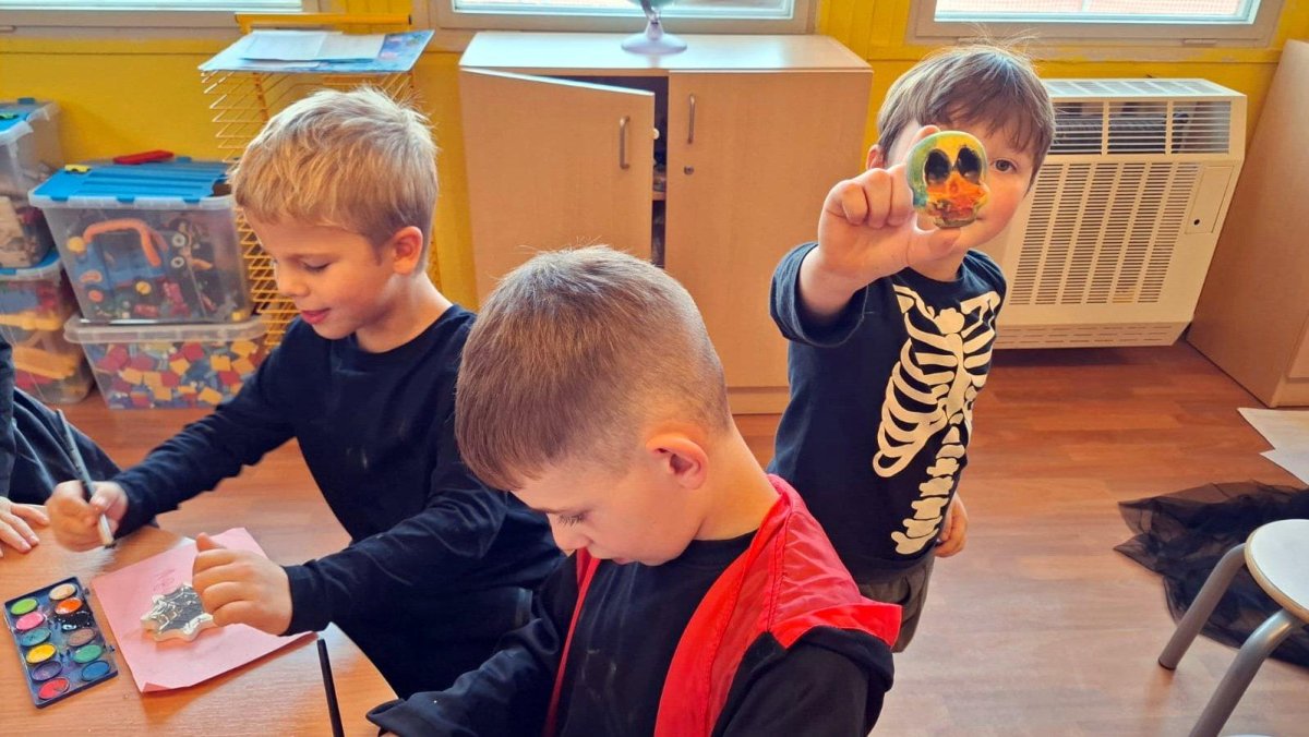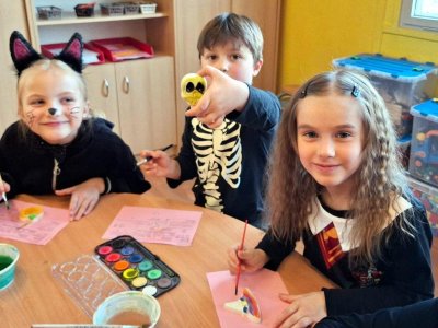 Společně jsme si přečetli pohádku, která nás všechny vtáhla do tajemného světa Halloweenu, potom jsme splnili různé úkoly a nakonec nás čekala kreativní výtvarná činnost . Pomocí vodových barev jsme si vybarvili krásné sádrové odlitky - čarodějnický klobouk, dýni, ducha, netopýra nebo pavučinu. Práce nás moc bavila a krásné výtvory jsme si s radostí odnesli domů. Za přípravu nádherných sádrových odlitků moc děkujeme paní asistentce Konvalinové!