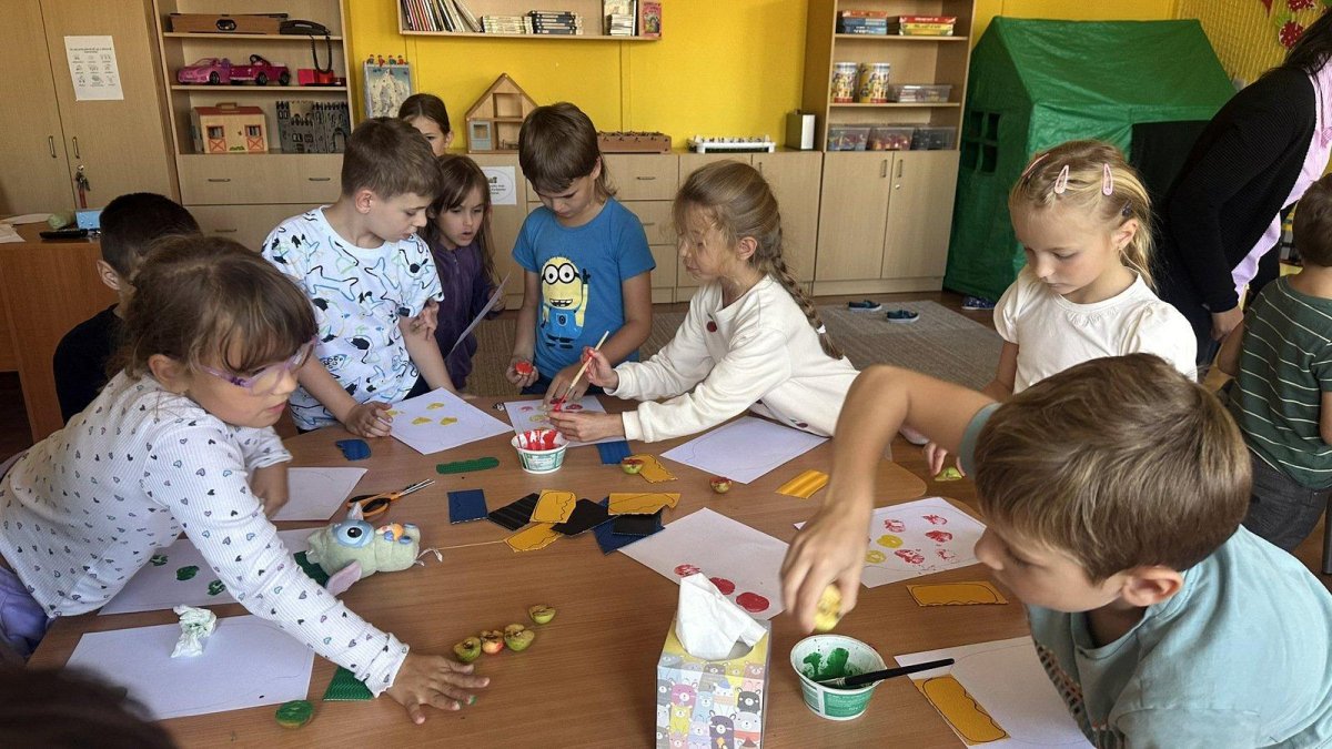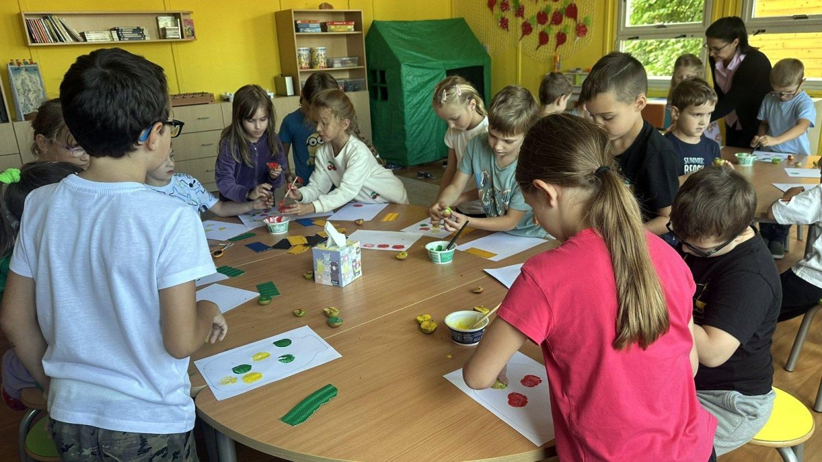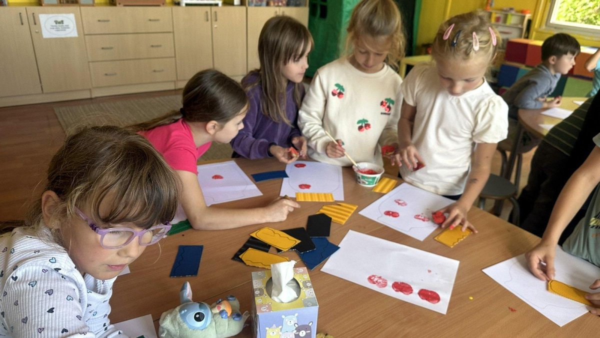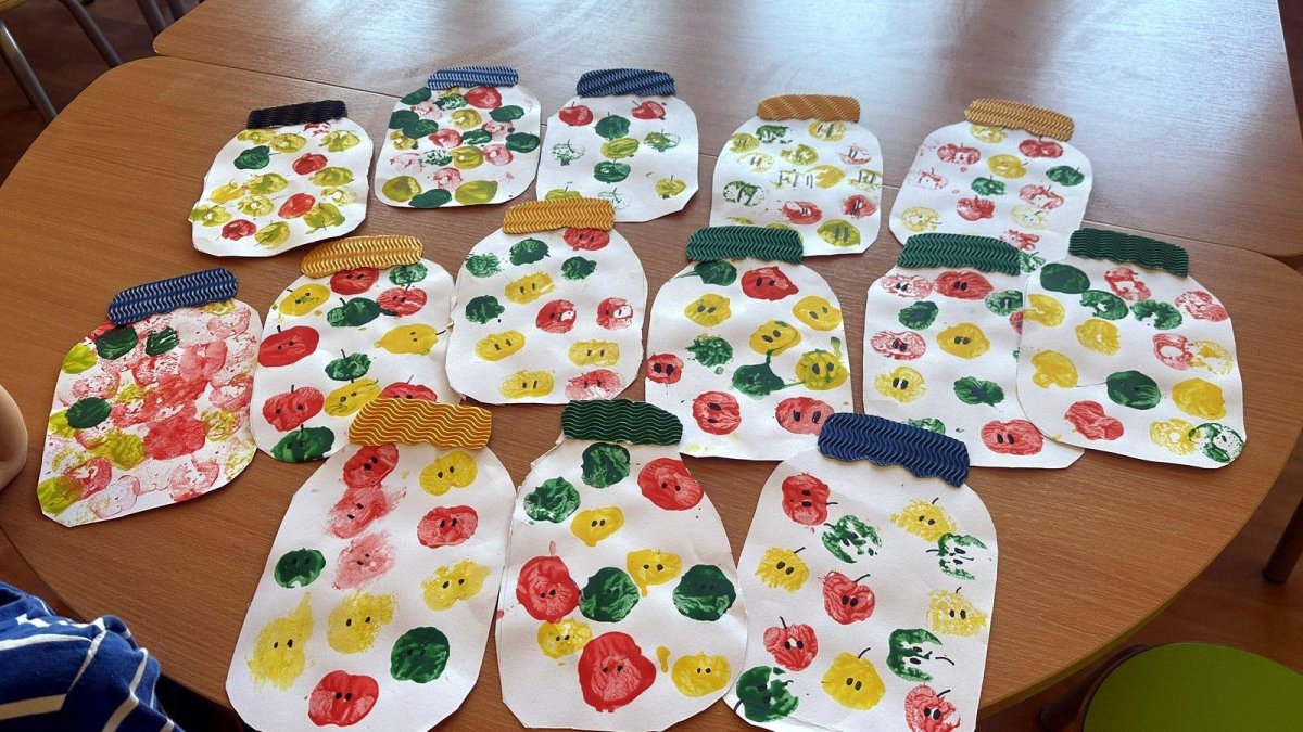 Každý otisk byl jiný - objevily se jablečné hvězdičky, kruhy a zajímavé vzory. Naše “zavařeniny” jsme dokončili víčky z barevného vlnkového papíru. Výsledek? Galerie nádherných jablečných zavařenin, kde každá sklenice byla originál.