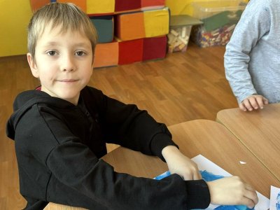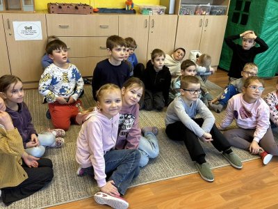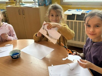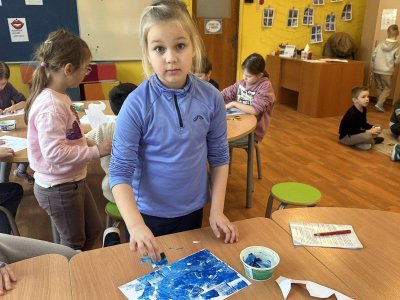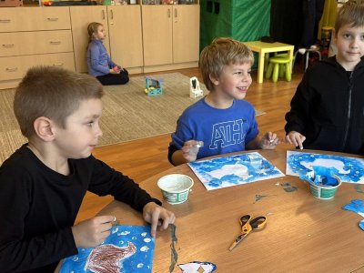 Dnešní den patřil veverkám – poslechli jsme si pohádku o veverce Terce, zazpívali si písničku a zahráli si na schovávanou s oříšky. Nejvíce se nám však povedlo zimní tvoření. Nejprve jsme si vystřihli šablonu veverky, kolem které jsme houbičkou nanesli „mrazivou“ barvu, a po zaschnutí veverku vybarvili a prstíky dotvořili padající sníh. Výsledkem jsou krásné zimní obrázky, které nám dělají velkou radost.