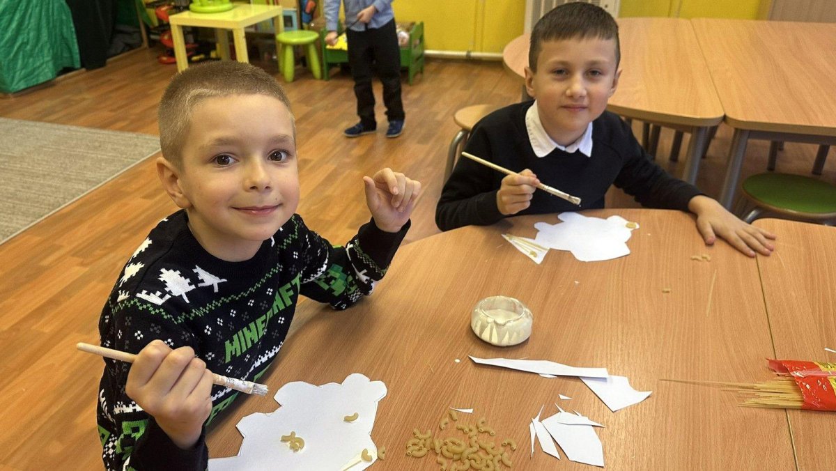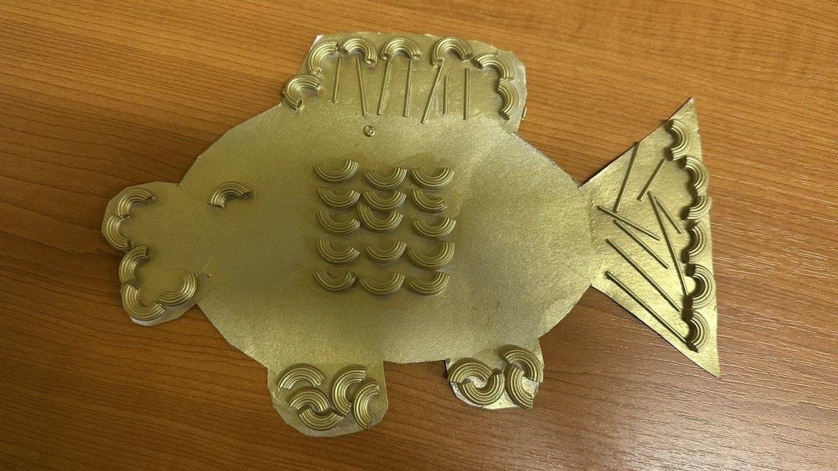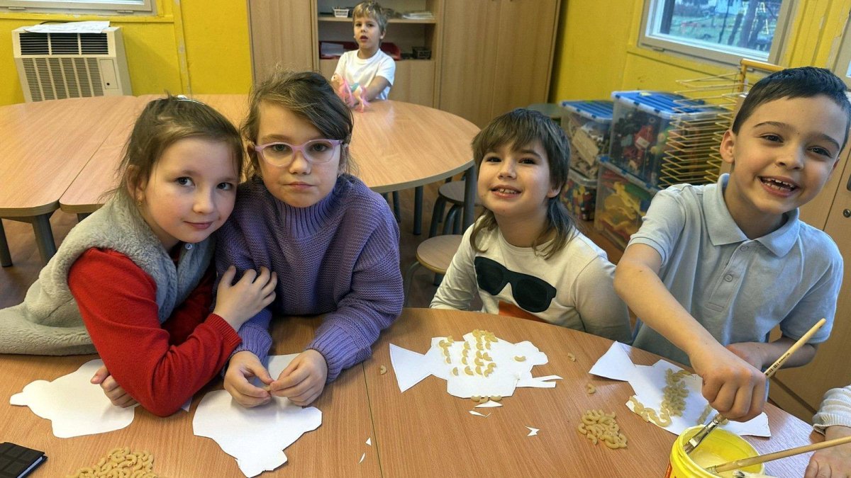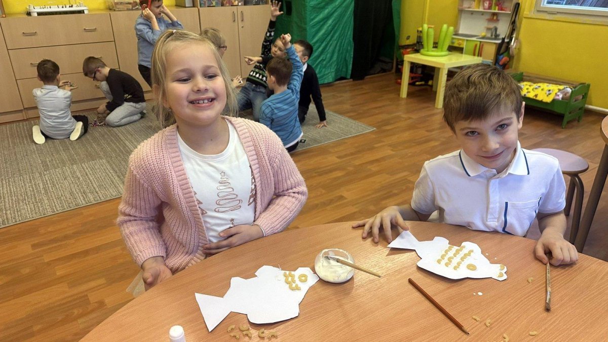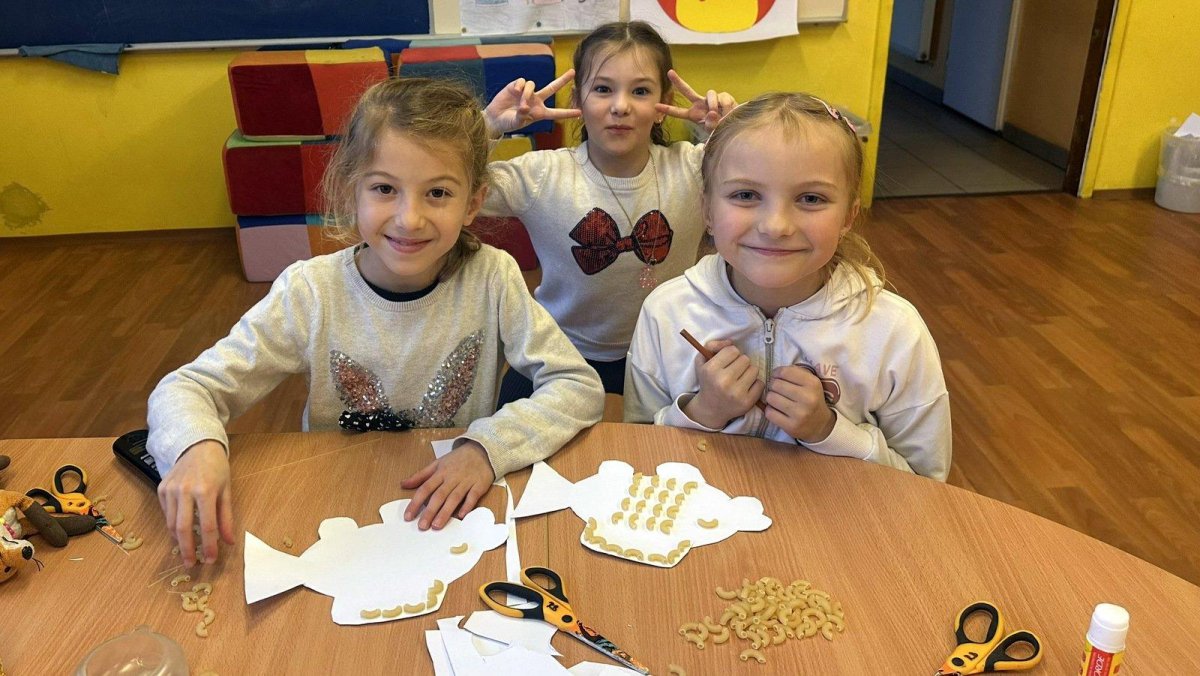 Děti pečlivě lepily těstoviny na tvar kapra a vytvářely šupinaté tělo. Zlatý sprej pak proměnil obyčejné těstoviny v nádherného třpytivého kapra.