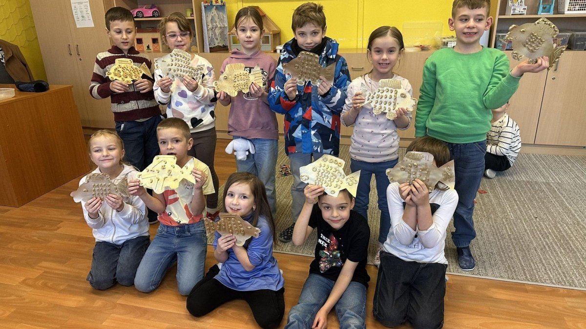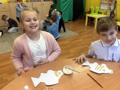 Na závěr roku jsme si společně vytvořili zlatého kapříka, který splní všechna přání. Za pomocí těstovin, lepidla a zlatého spreje se nám moc povedl.