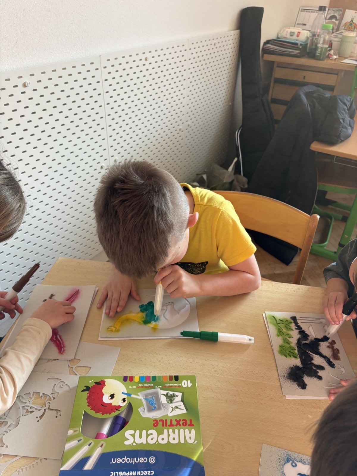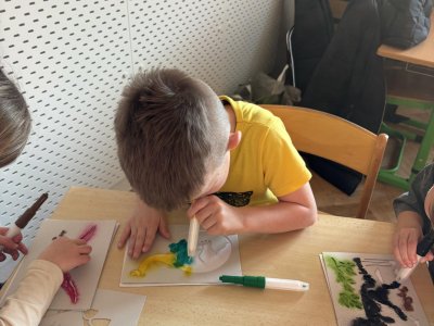 Děti se s chutí pustily do tvoření s foukacími fixy.