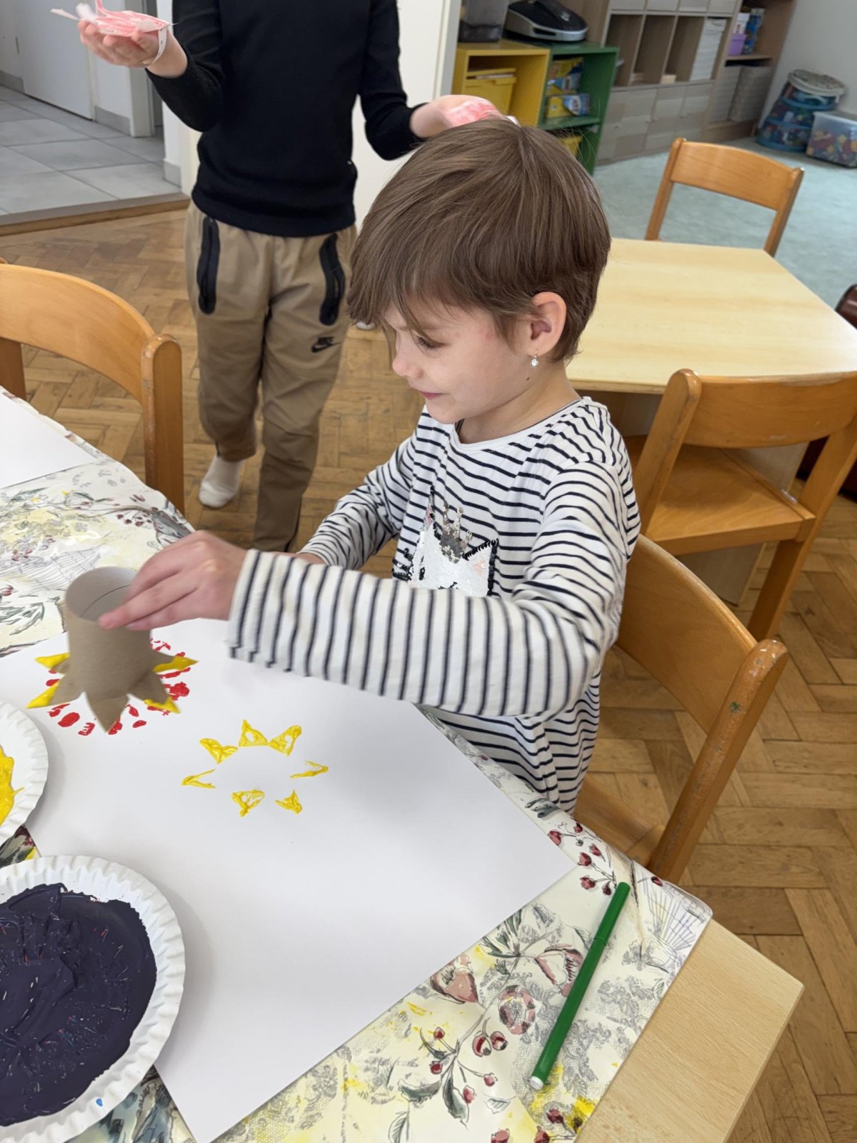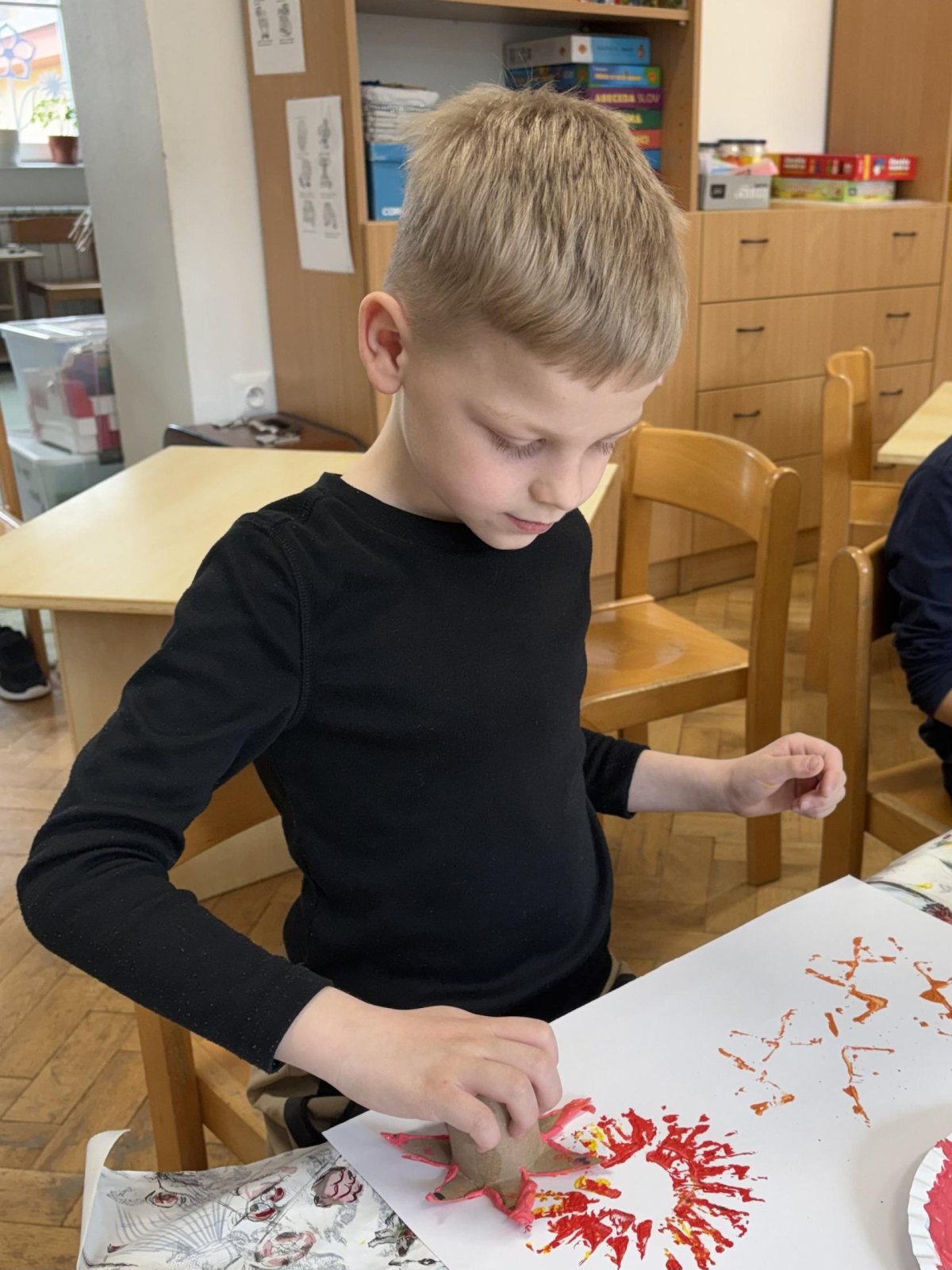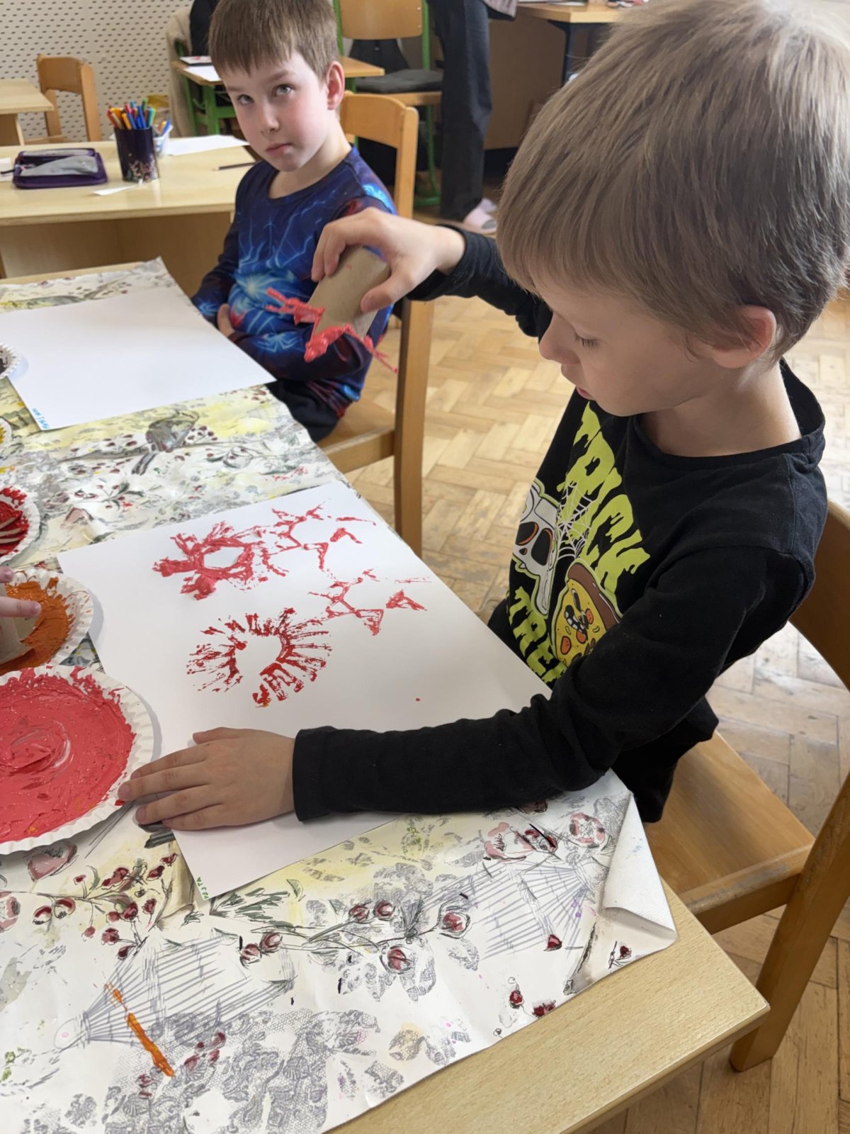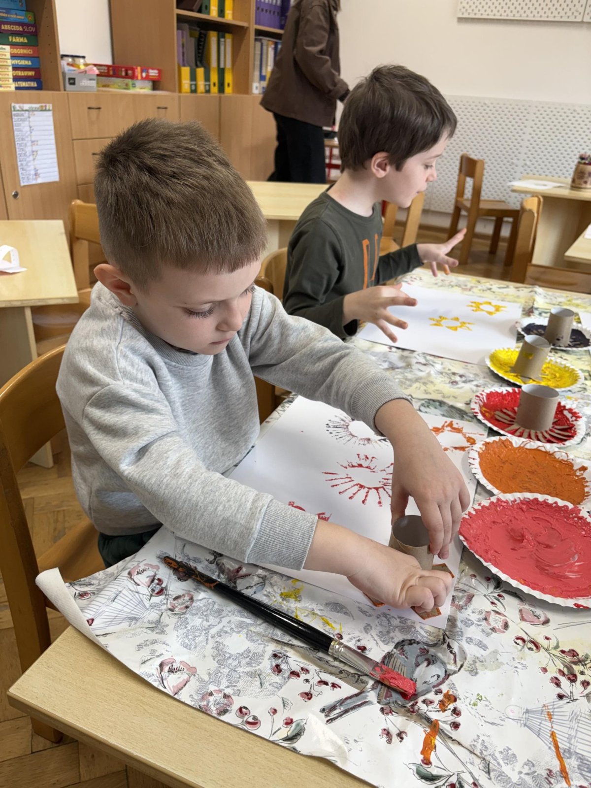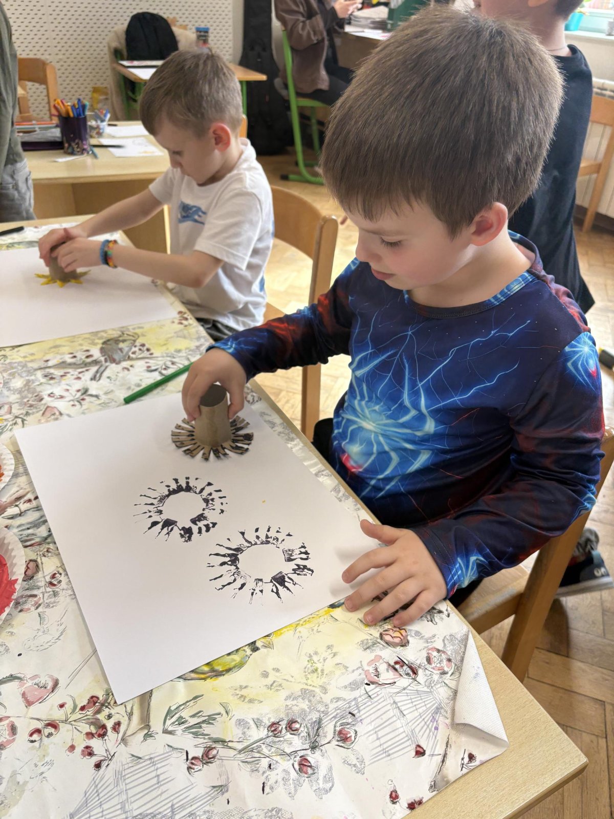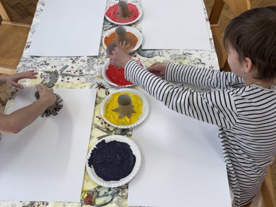 Během výtvarné činnosti děti tvořily květiny pomocí otisků, které vznikaly z papírových ruliček.