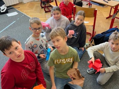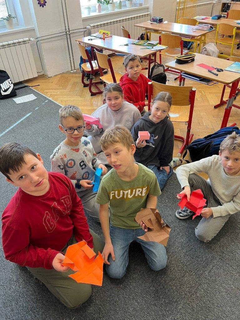 Děti si v pracovních činnostech samy poskládali krabičku z papíru. Pracovali nejdřív společně, kdy jim bylo vysvětleno a předvedeno, jak na to. Potom se rozdělili do skupin a všichni členové dávali dohromady svoje postřehy. Výrobky se povedly a skládání je velmi bavilo. Už teď se těšíme na origami někdy v budoucnu.