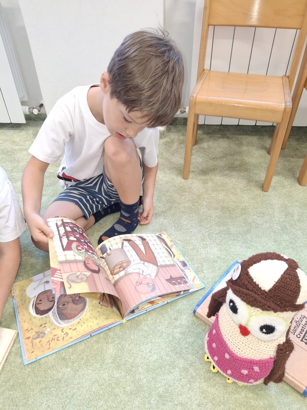 Sovík seznámil děti s různými druhy knih a co v nich všechno můžeme najít. Už víme, že knihu píše spisovatel a obrázky kreslí ilustrátor. Od Sovíka tu byly připravené i knihy na prohlédnutí a děti mu pak vyprávěly co se z knih dozvěděly nebo o čem kniha je.