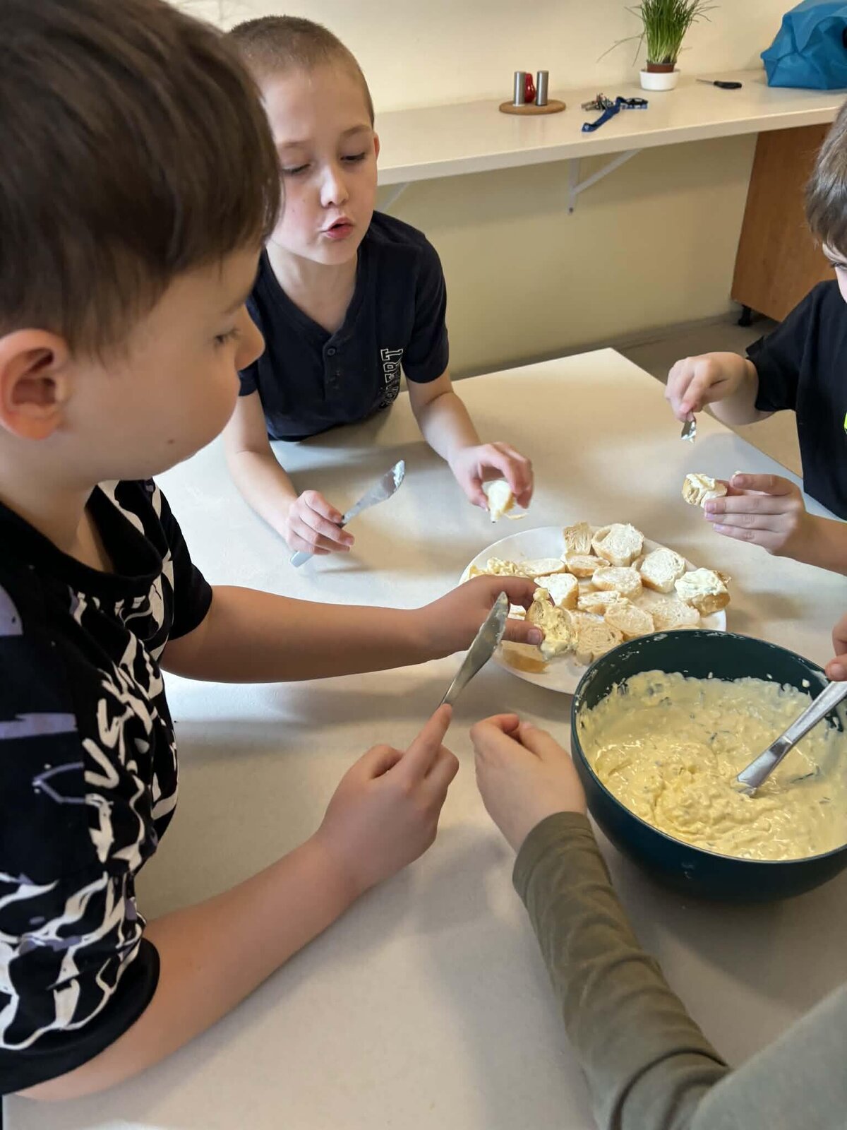 Děti se s chutí zapojily do práce – krájely, míchaly a dochucovaly, až vznikla výborná pomazánka. Tu jsme si potom společně namazali na pečivo a s radostí ochutnali.