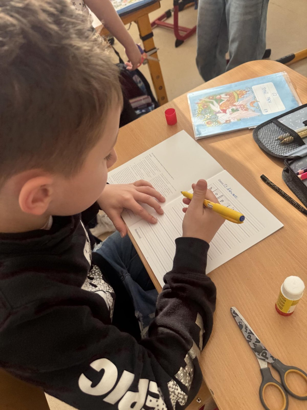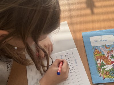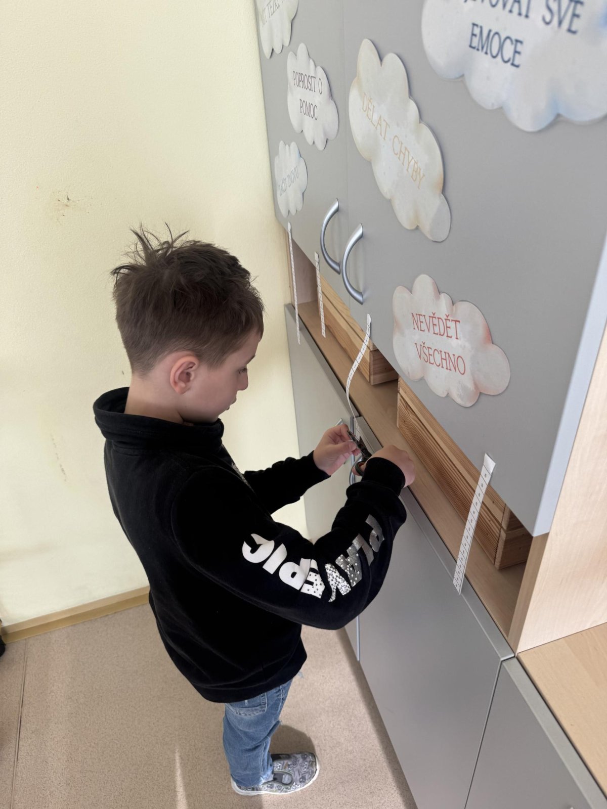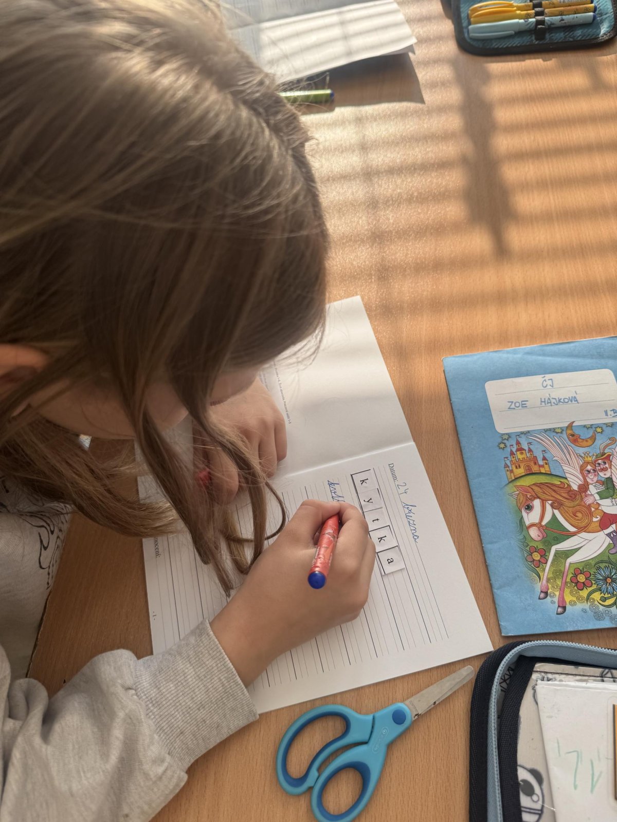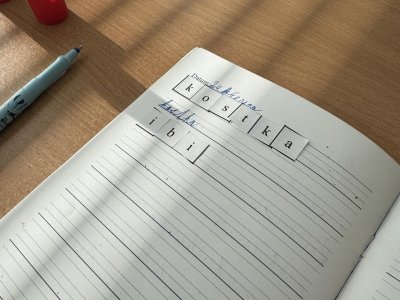 Dnešní den jsme začali pěkně svižně. Ve třídě na nás čekala písmenka, pěkně rozházená po celé třídě. Našim úkolem bylo písmenka najít, ustřihnout si je, poskládat slovo, nalepit a nakonec přepsat.