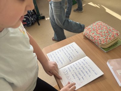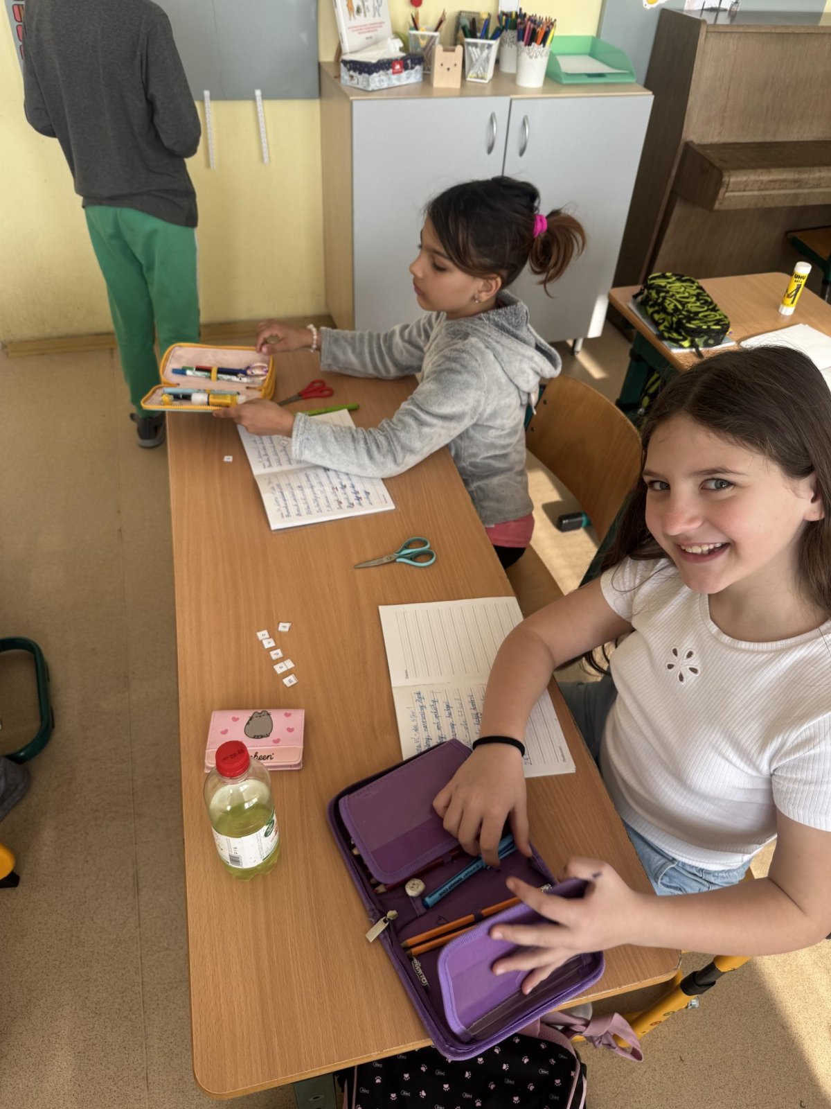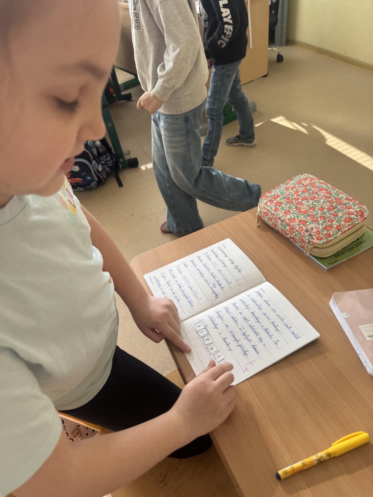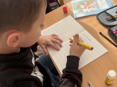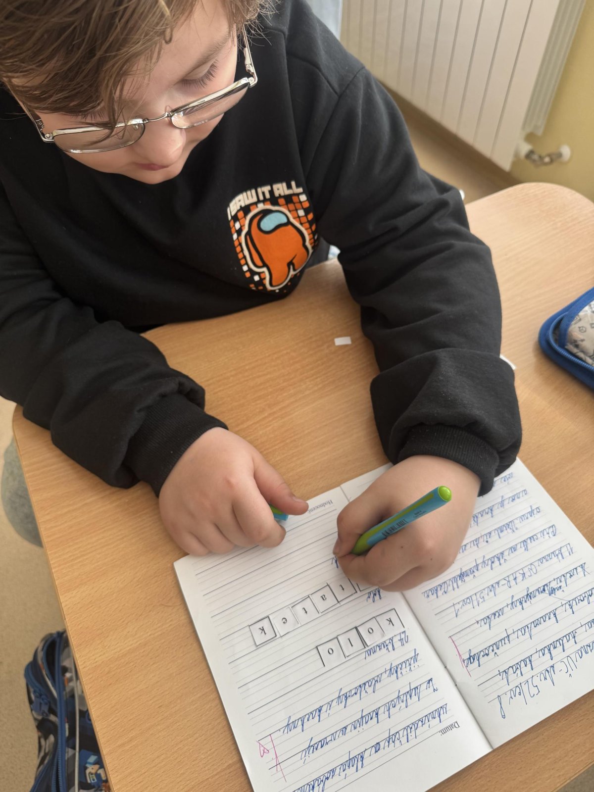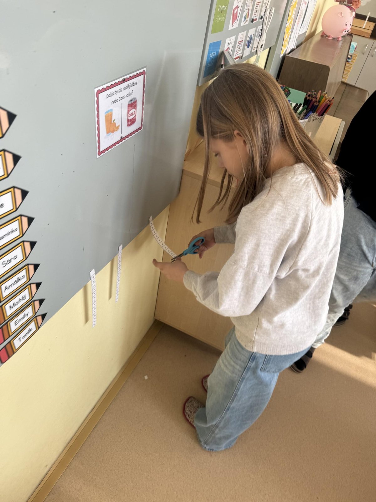 Dnešní den jsme začali pěkně svižně. Ve třídě na nás čekala písmenka, pěkně rozházená po celé třídě. Našim úkolem bylo písmenka najít, ustřihnout si je, poskládat slovo, nalepit a nakonec přepsat.