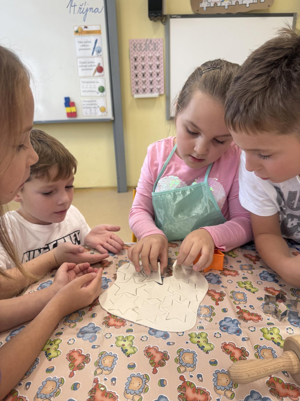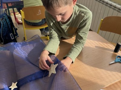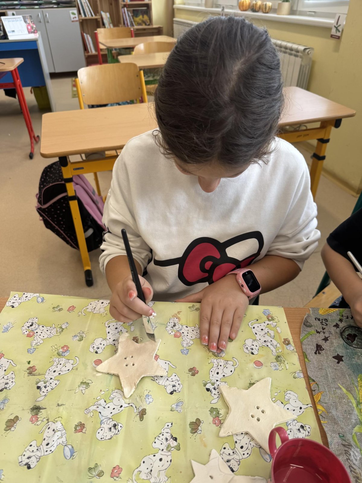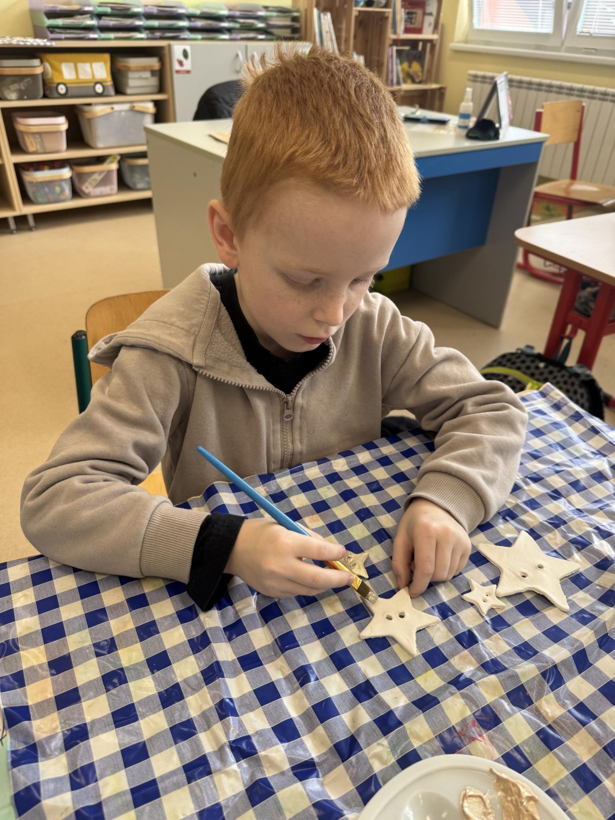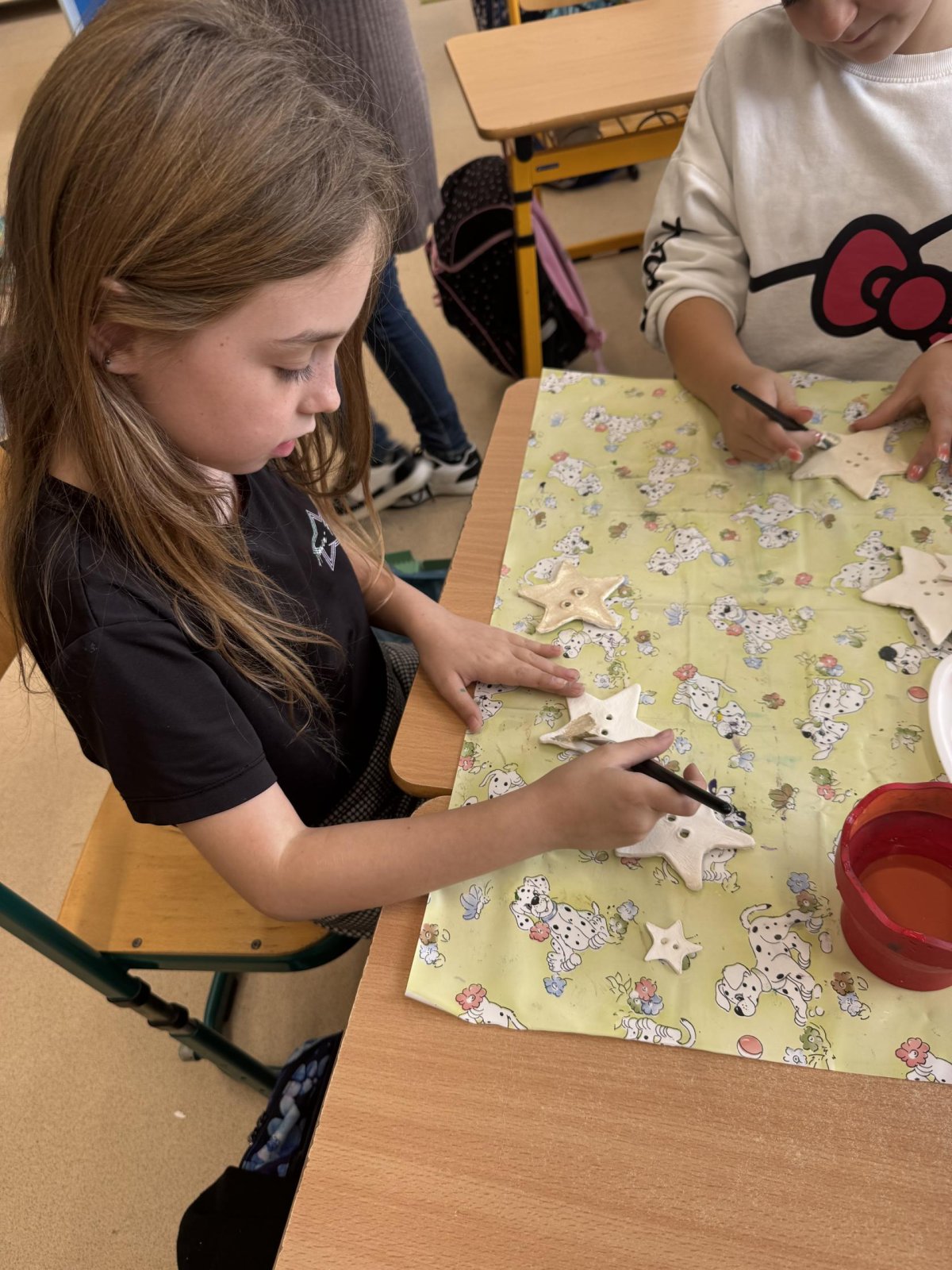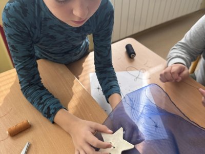 Nejdříve jsme si připravili samotvrdnoucí hmotu, kterou jsme vyváleli a pak jsme z ní vykrajovali hvězdičky. Po zatvrdnutí jsme je nabarvili krásnou zlatou barvou.