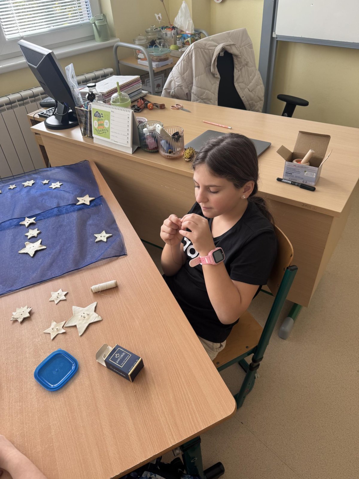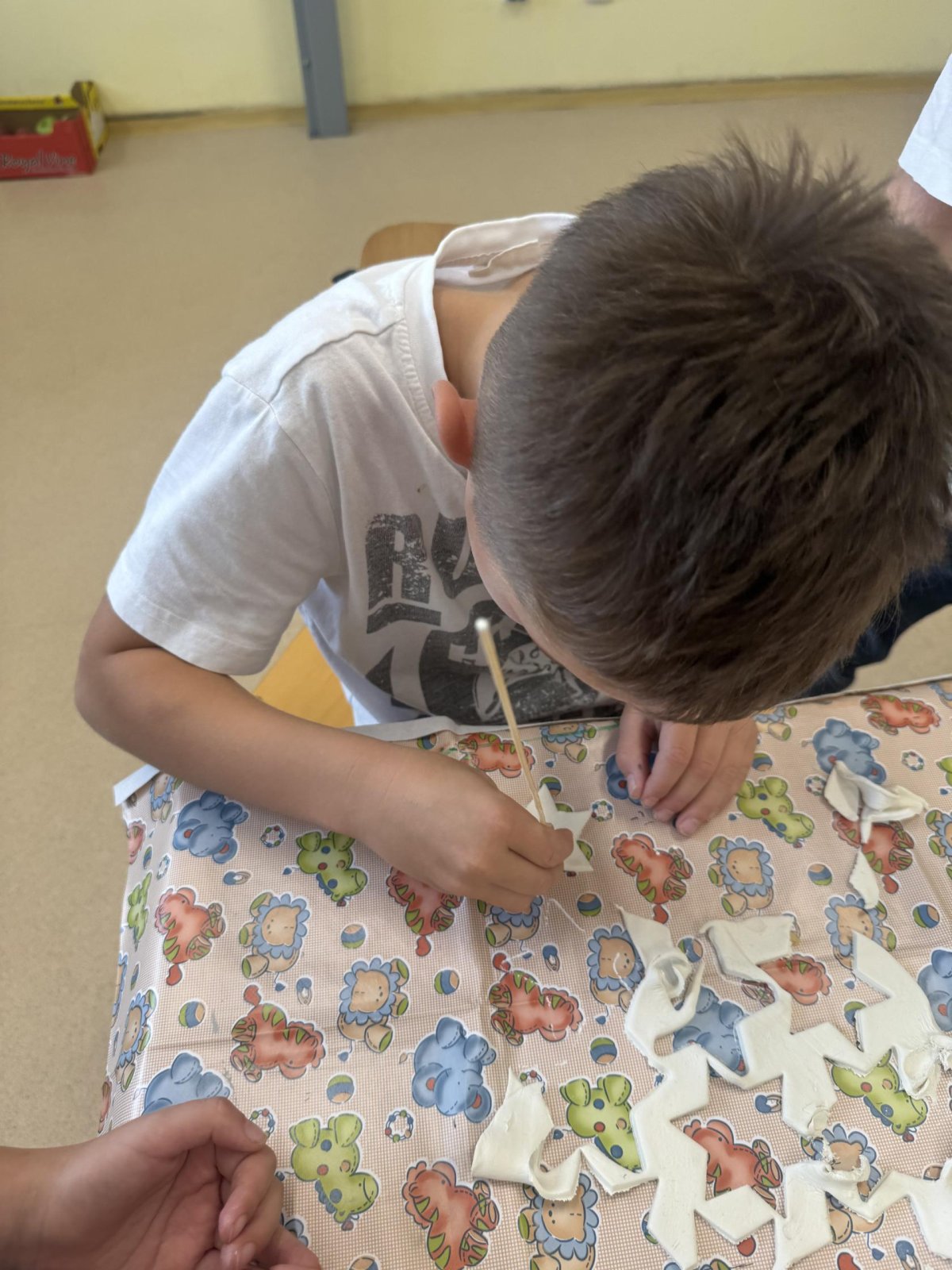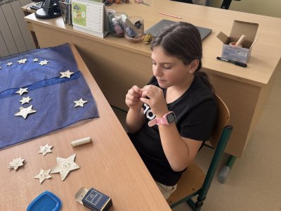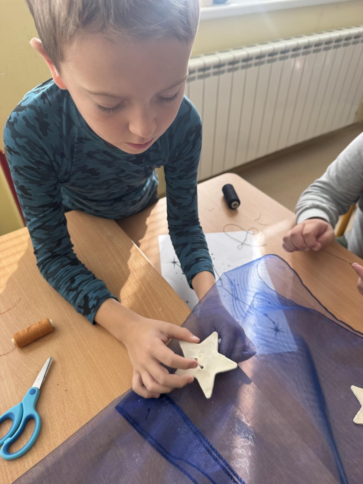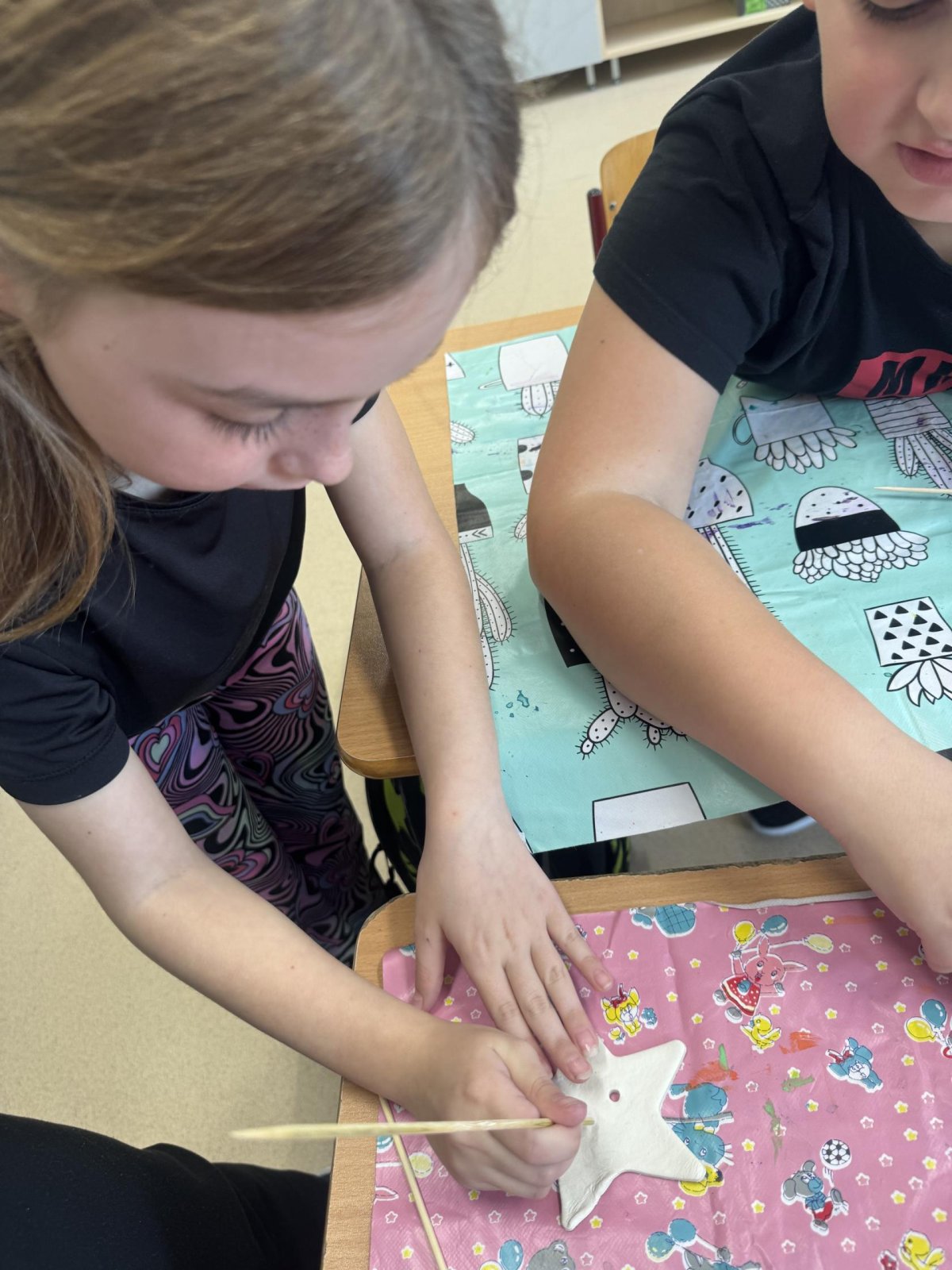 Nejdříve jsme si připravili samotvrdnoucí hmotu, kterou jsme vyváleli a pak jsme z ní vykrajovali hvězdičky. Po zatvrdnutí jsme je nabarvili krásnou zlatou barvou.