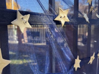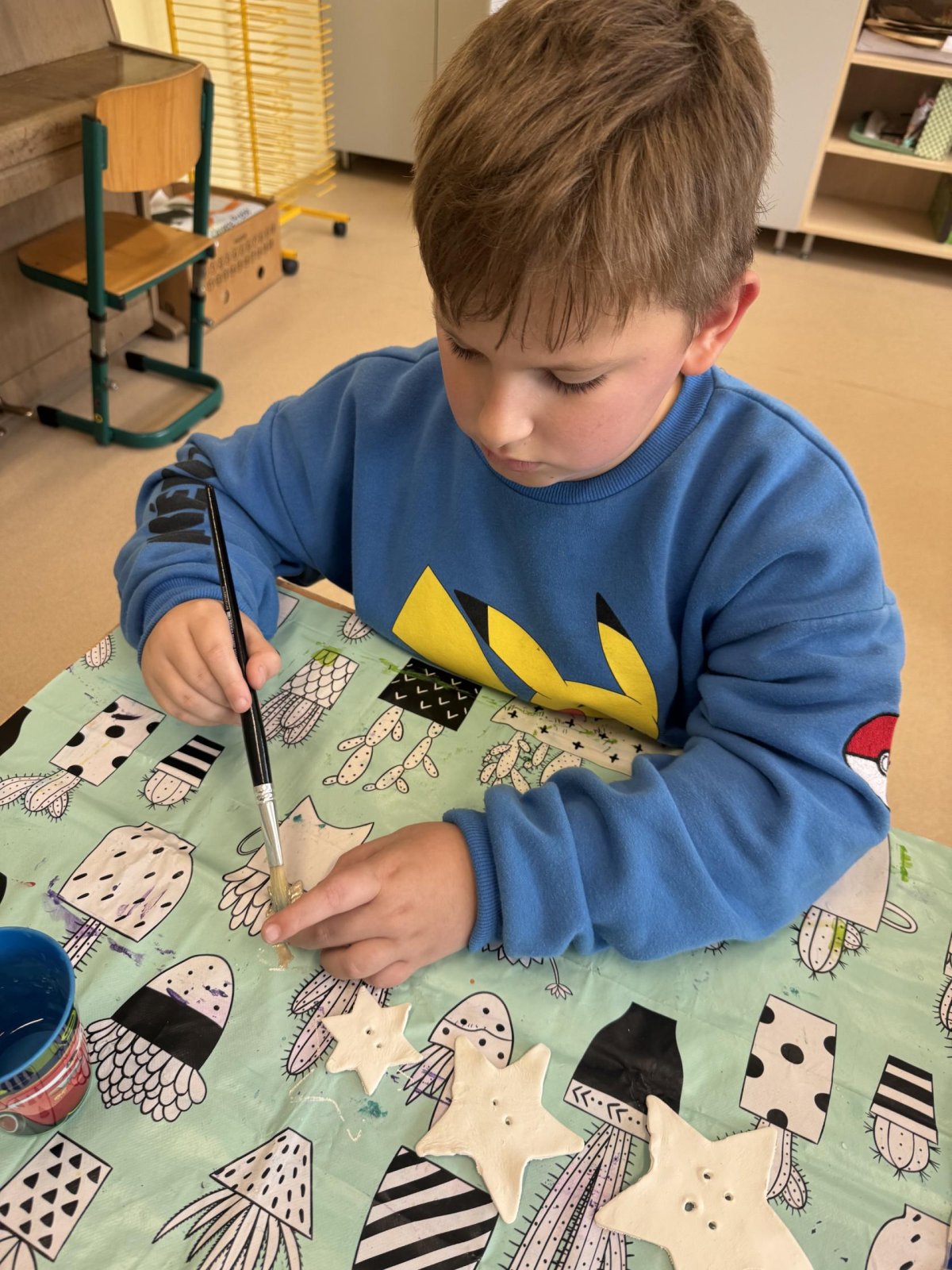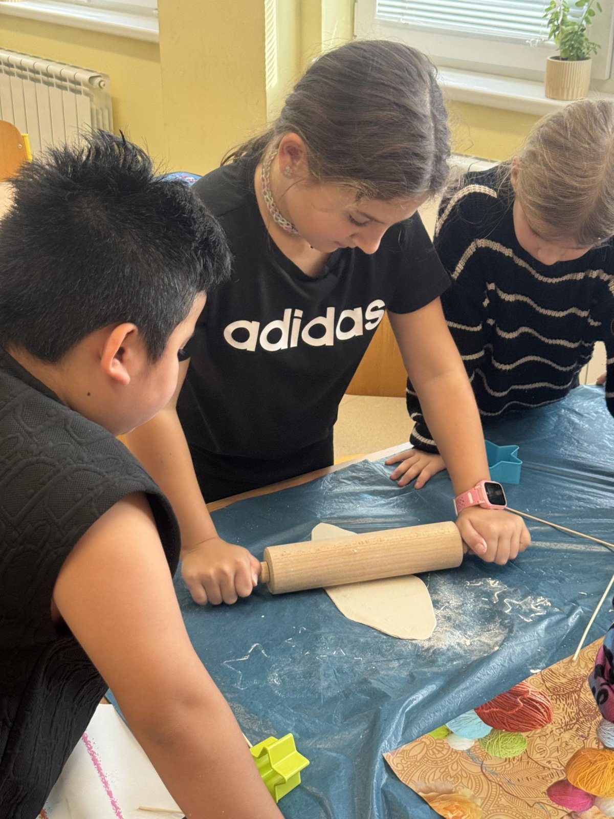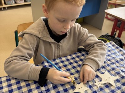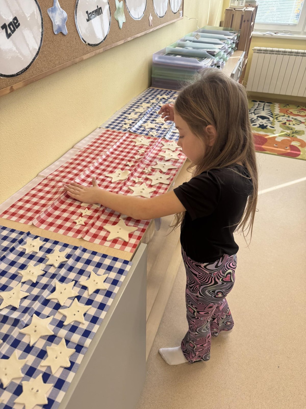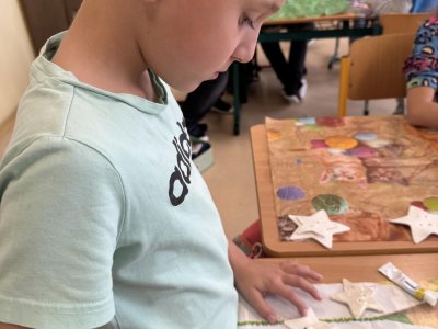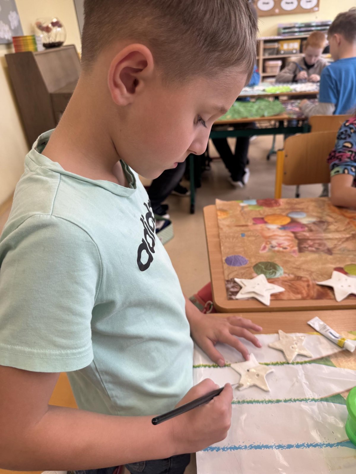 Nejdříve jsme si připravili samotvrdnoucí hmotu, kterou jsme vyváleli a pak jsme z ní vykrajovali hvězdičky. Po zatvrdnutí jsme je nabarvili krásnou zlatou barvou.