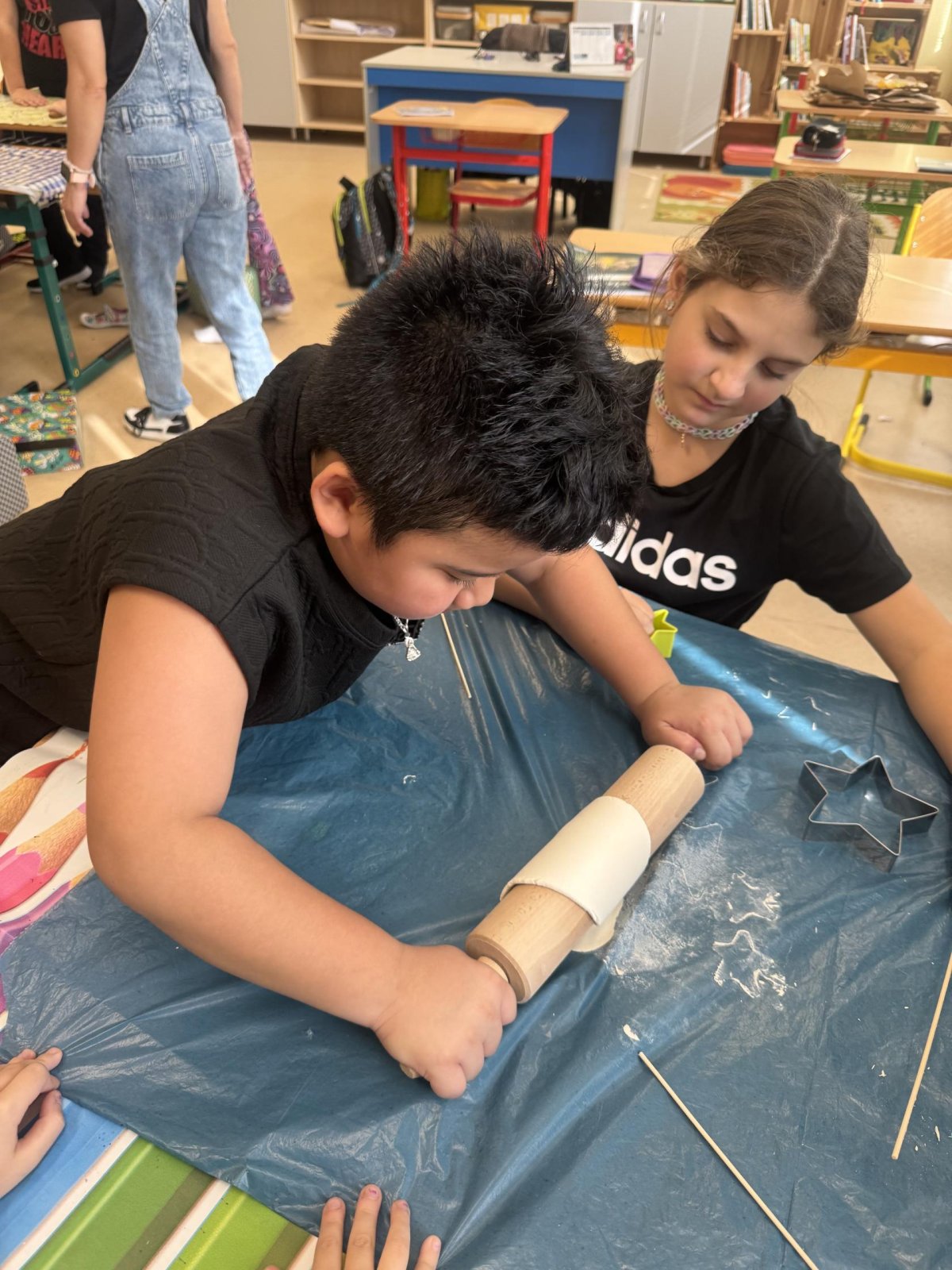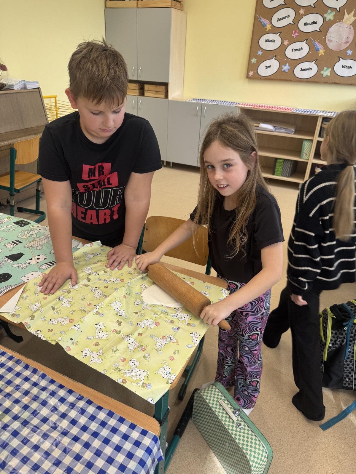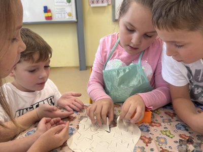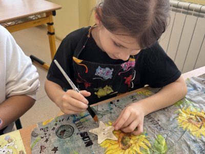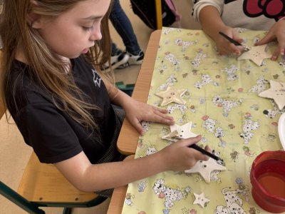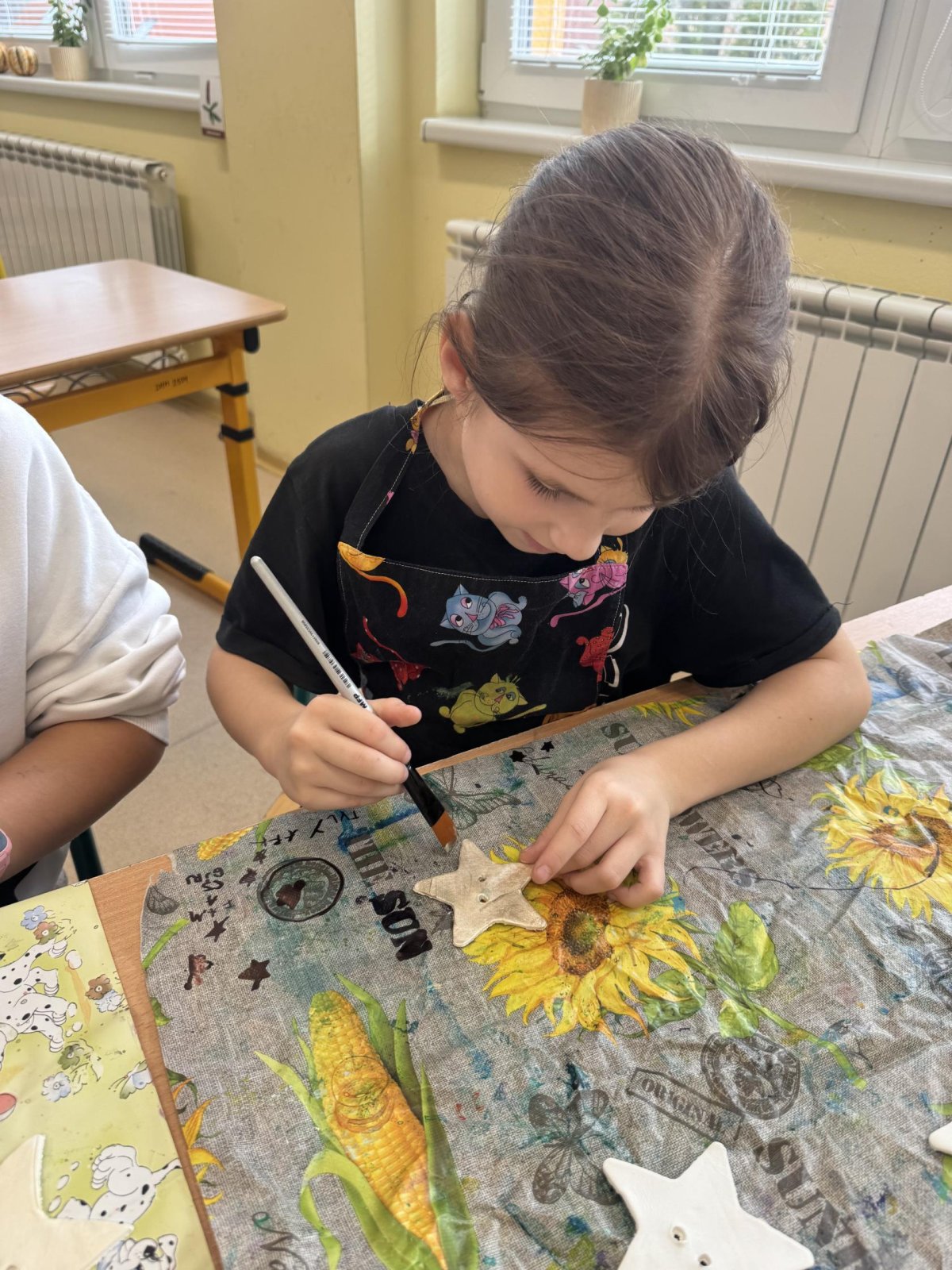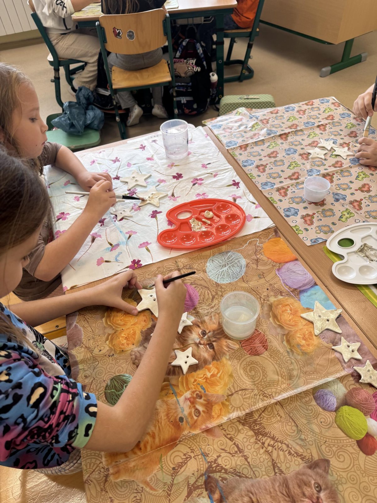 Nejdříve jsme si připravili samotvrdnoucí hmotu, kterou jsme vyváleli a pak jsme z ní vykrajovali hvězdičky. Po zatvrdnutí jsme je nabarvili krásnou zlatou barvou.