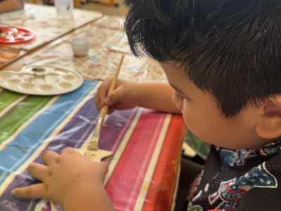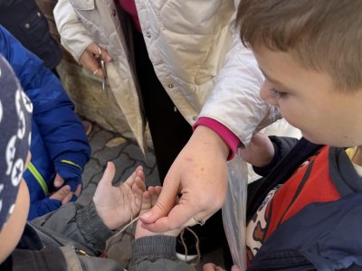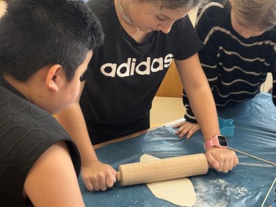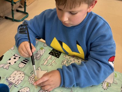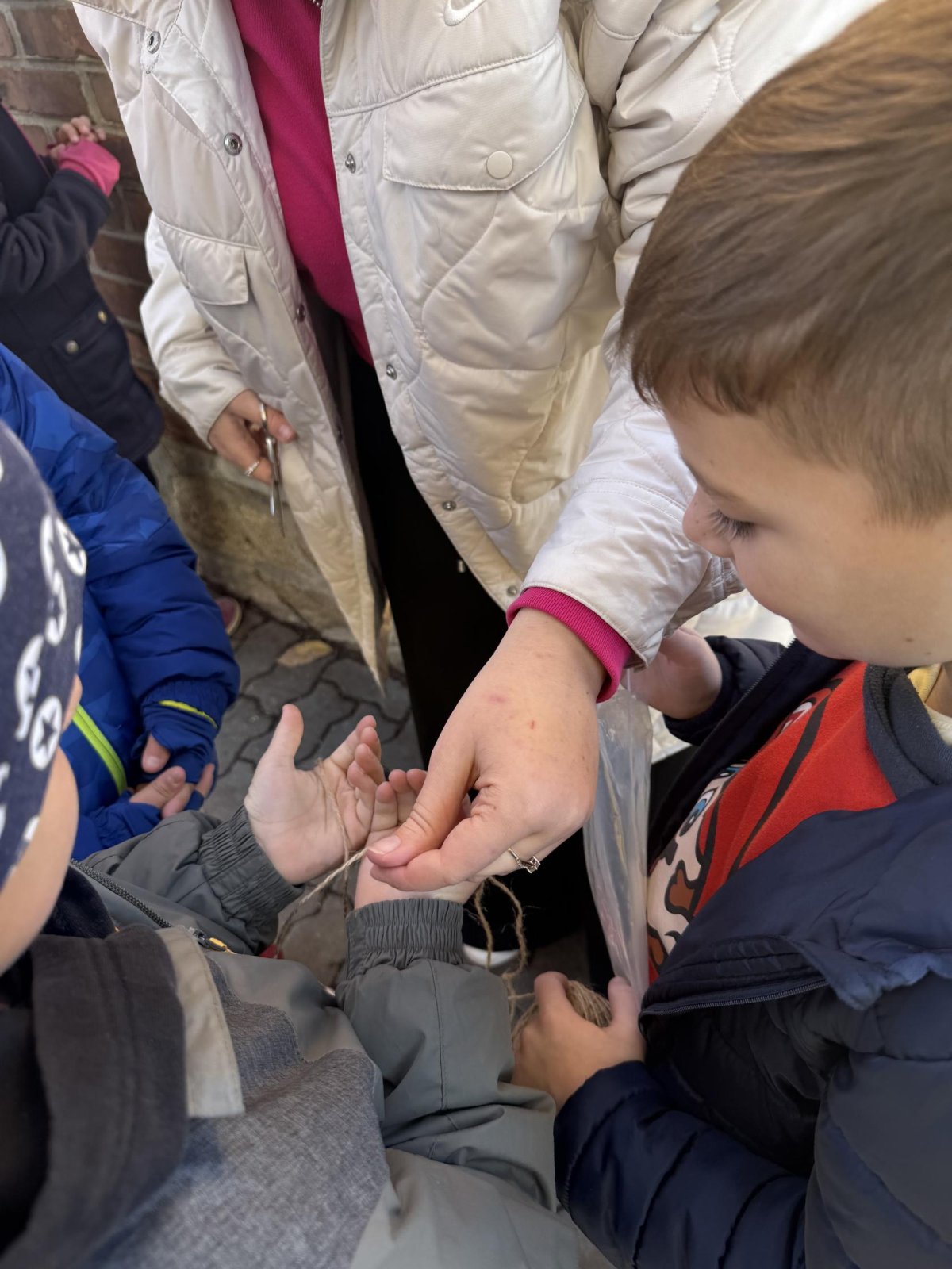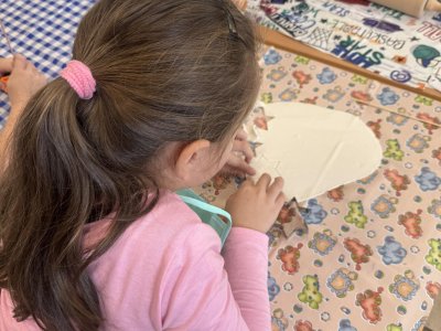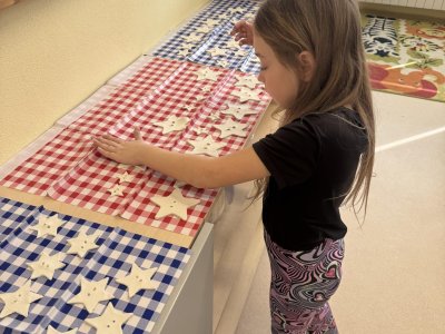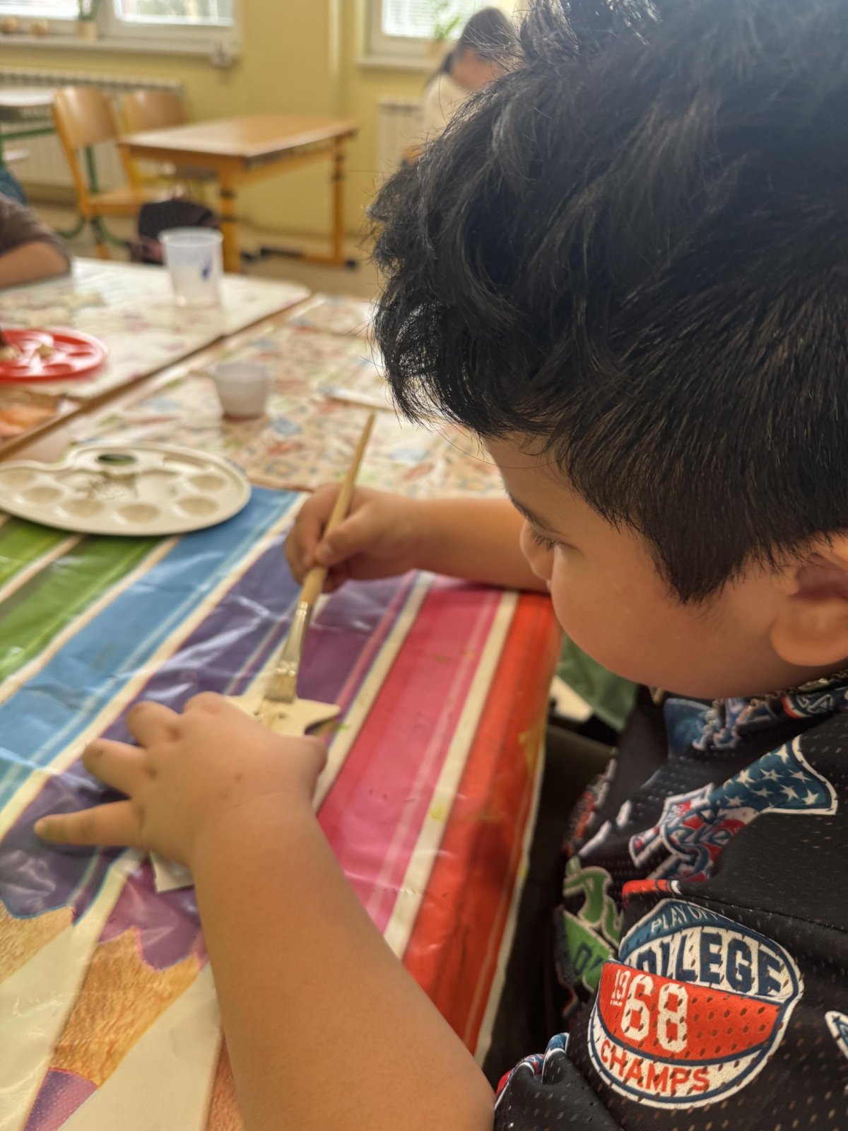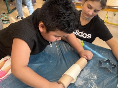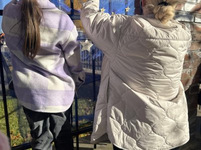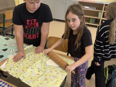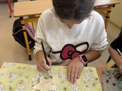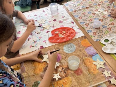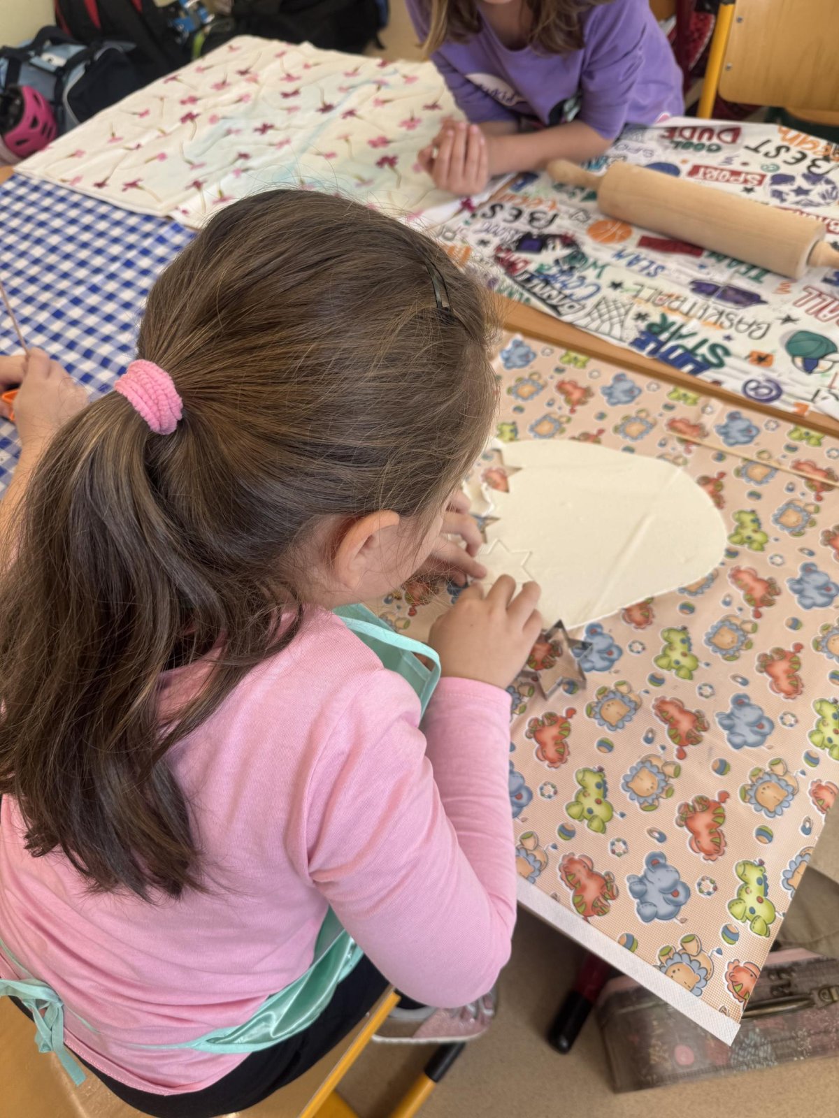 Nejdříve jsme si připravili samotvrdnoucí hmotu, kterou jsme vyváleli a pak jsme z ní vykrajovali hvězdičky. Po zatvrdnutí jsme je nabarvili krásnou zlatou barvou.
