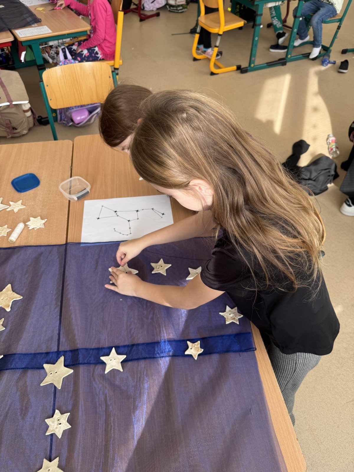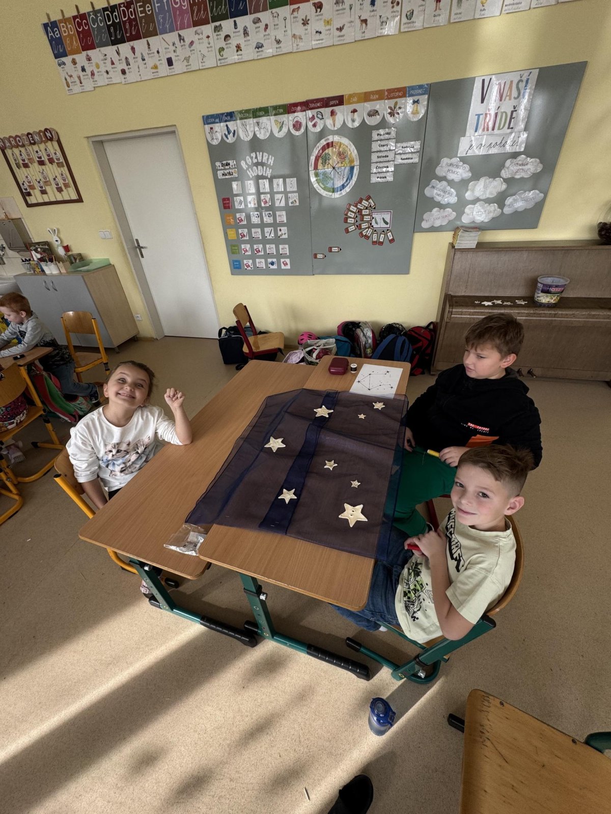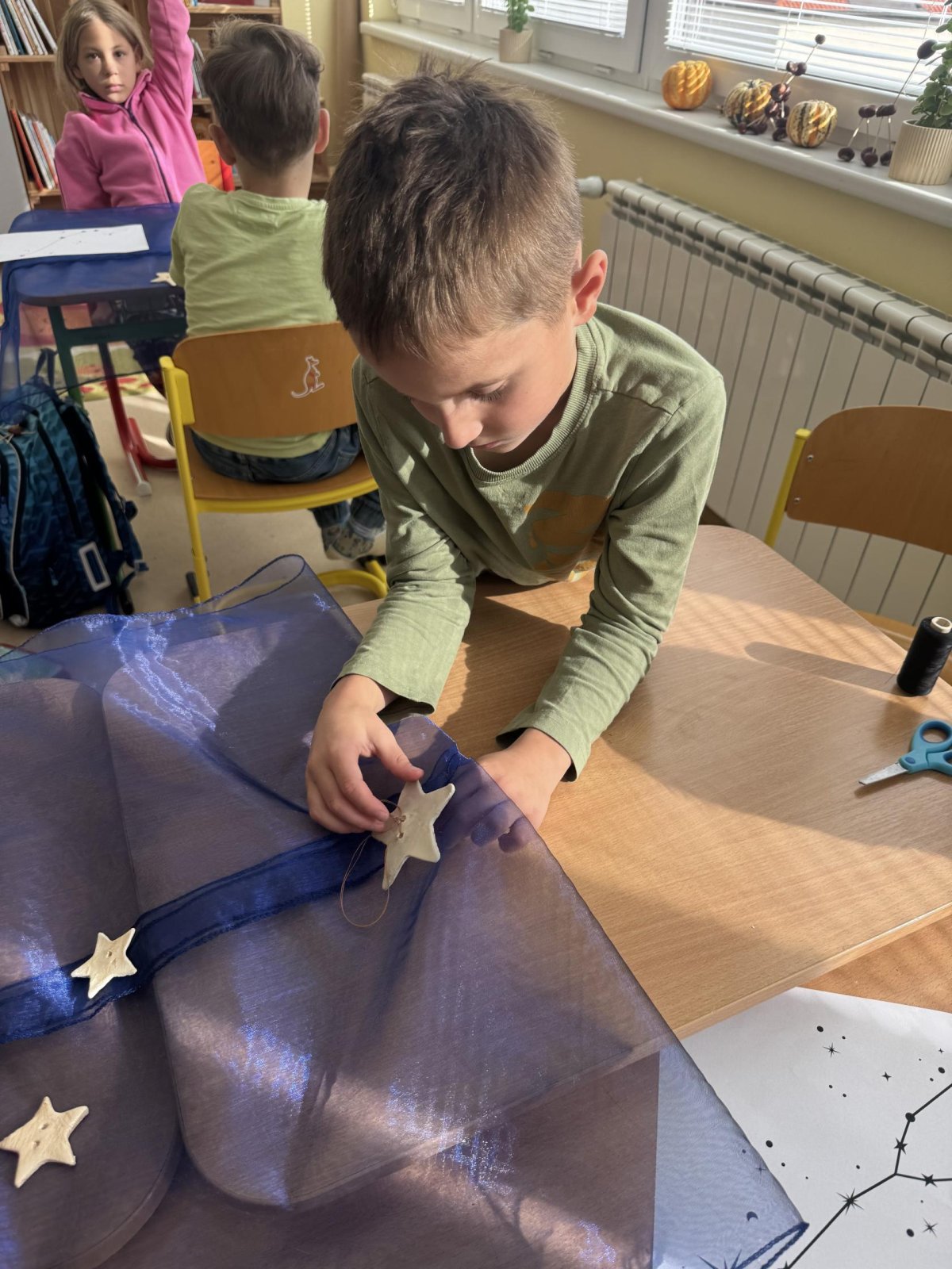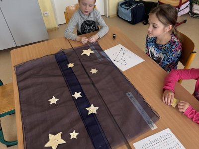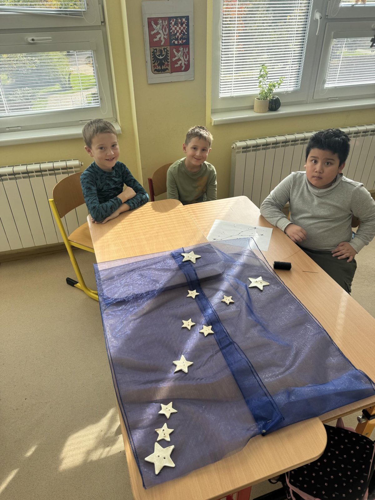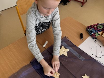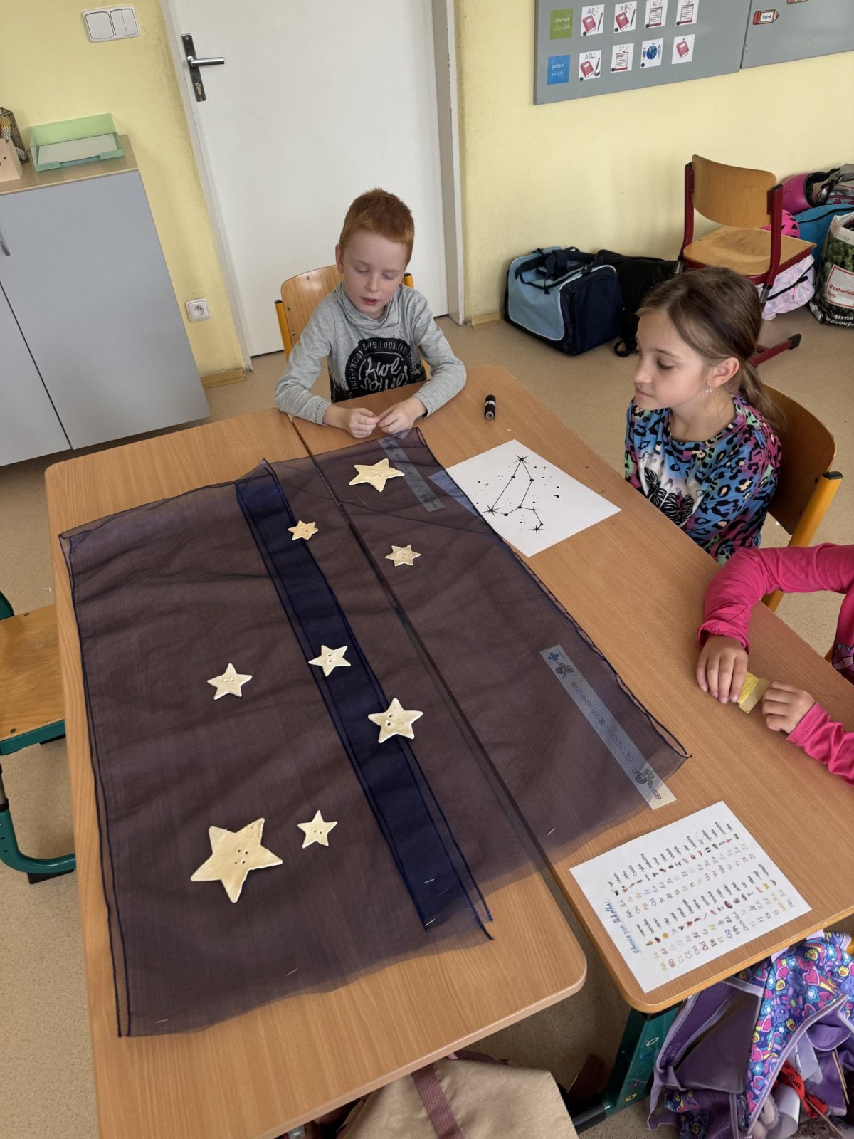 V pracovních činnostech a výtvarné výchově jsme se tentokrát nechali unášet kouzlem souhvězdí. Díky tomu jsme si tak mohli vyzkoušet spoustu výtvarných technik a pracovních postupů.