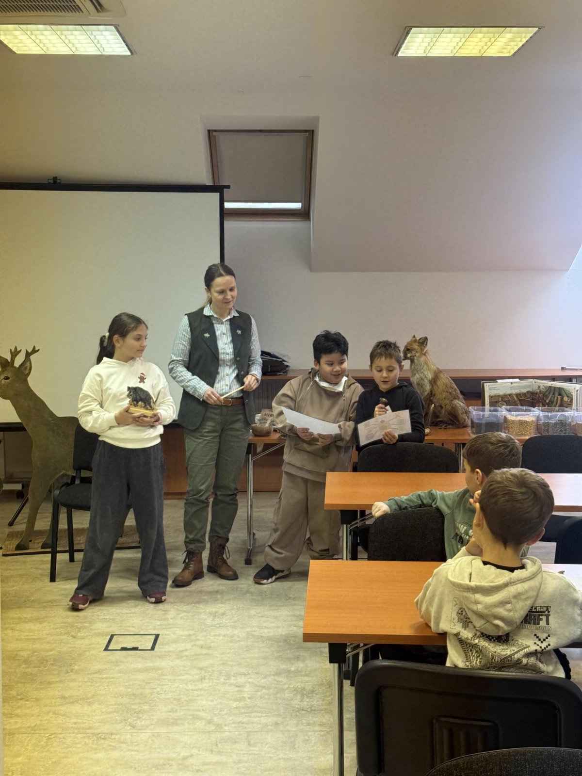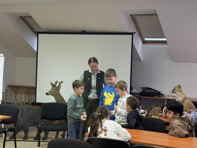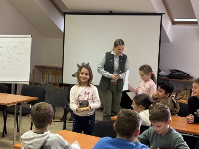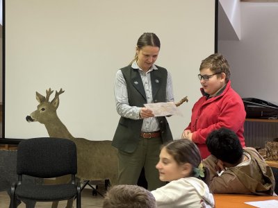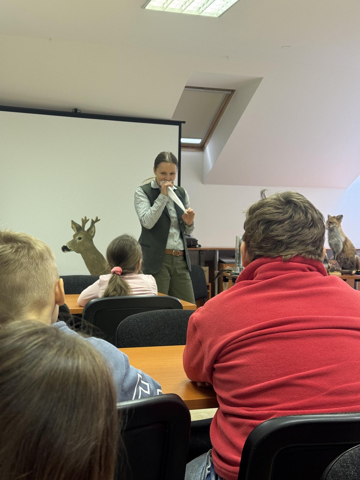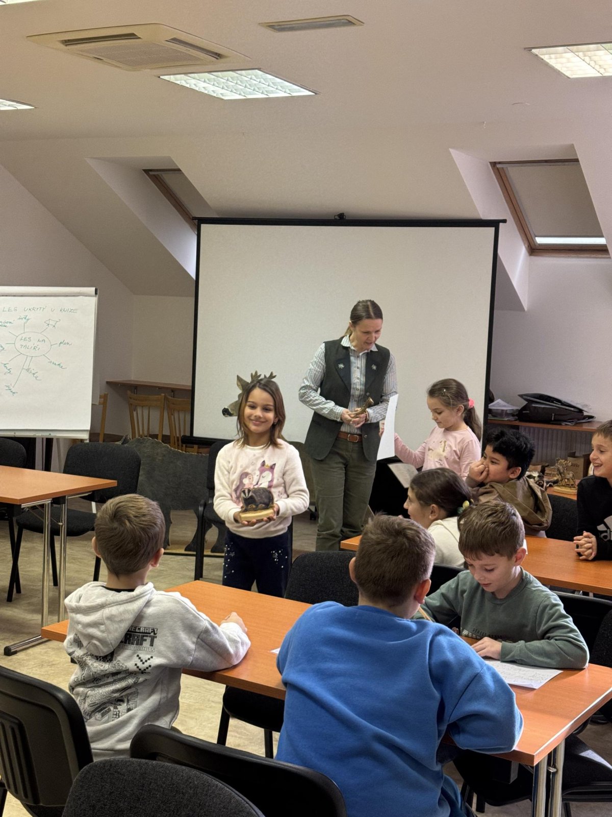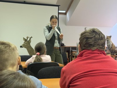 Tady už na nás čekala paní lesnice, která nám povyprávěl o zvířátkách, a hlavně o tom, co taková lesní zvířátka jedí.