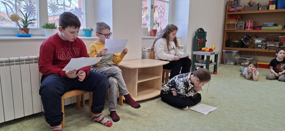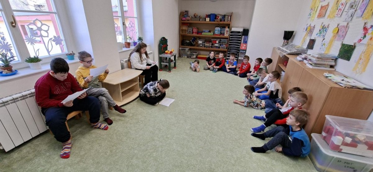 Ve čtení pohádek a krátkých pohádkových příběhů pokračují naši čtvrťáci v přípravné třídě i v březnu. Tráví tam téměř každou pondělní velkou přestávku a čtou malým posluchačům pohádkové příběhy, které oni napjatě poslouchají.