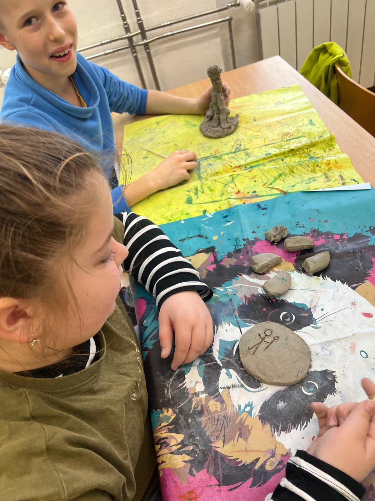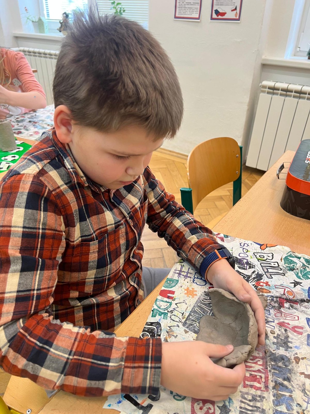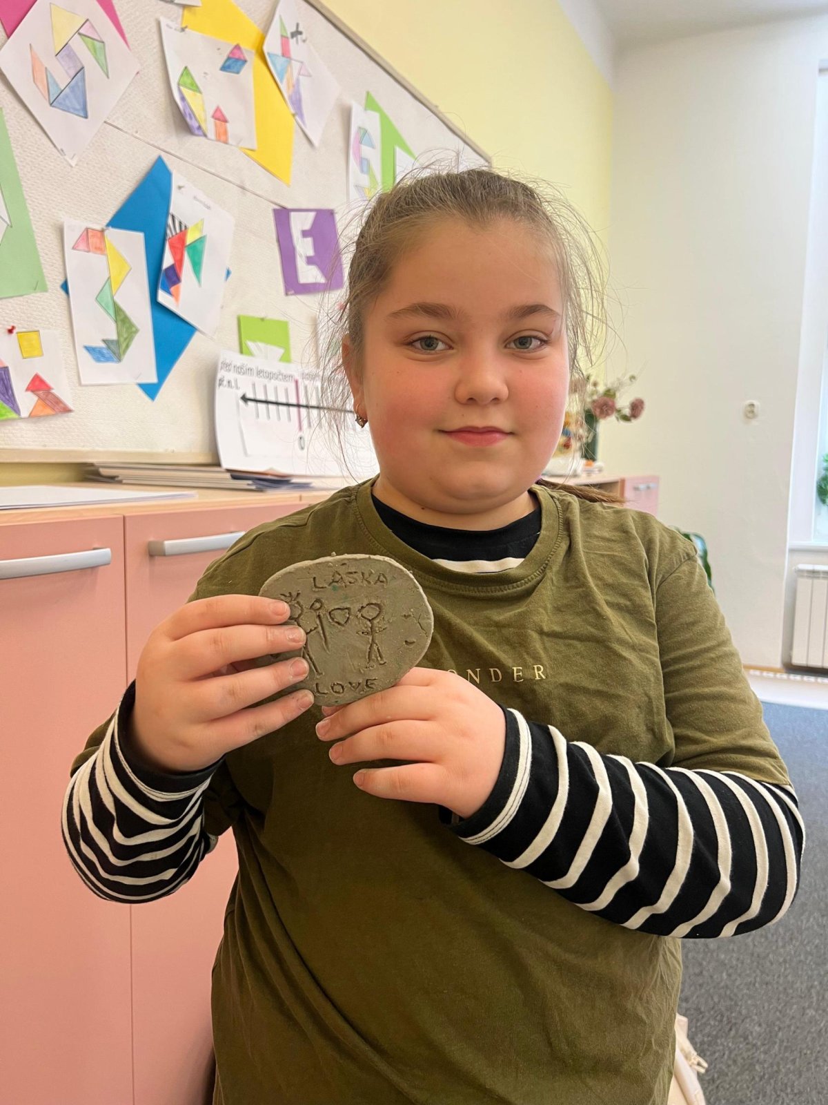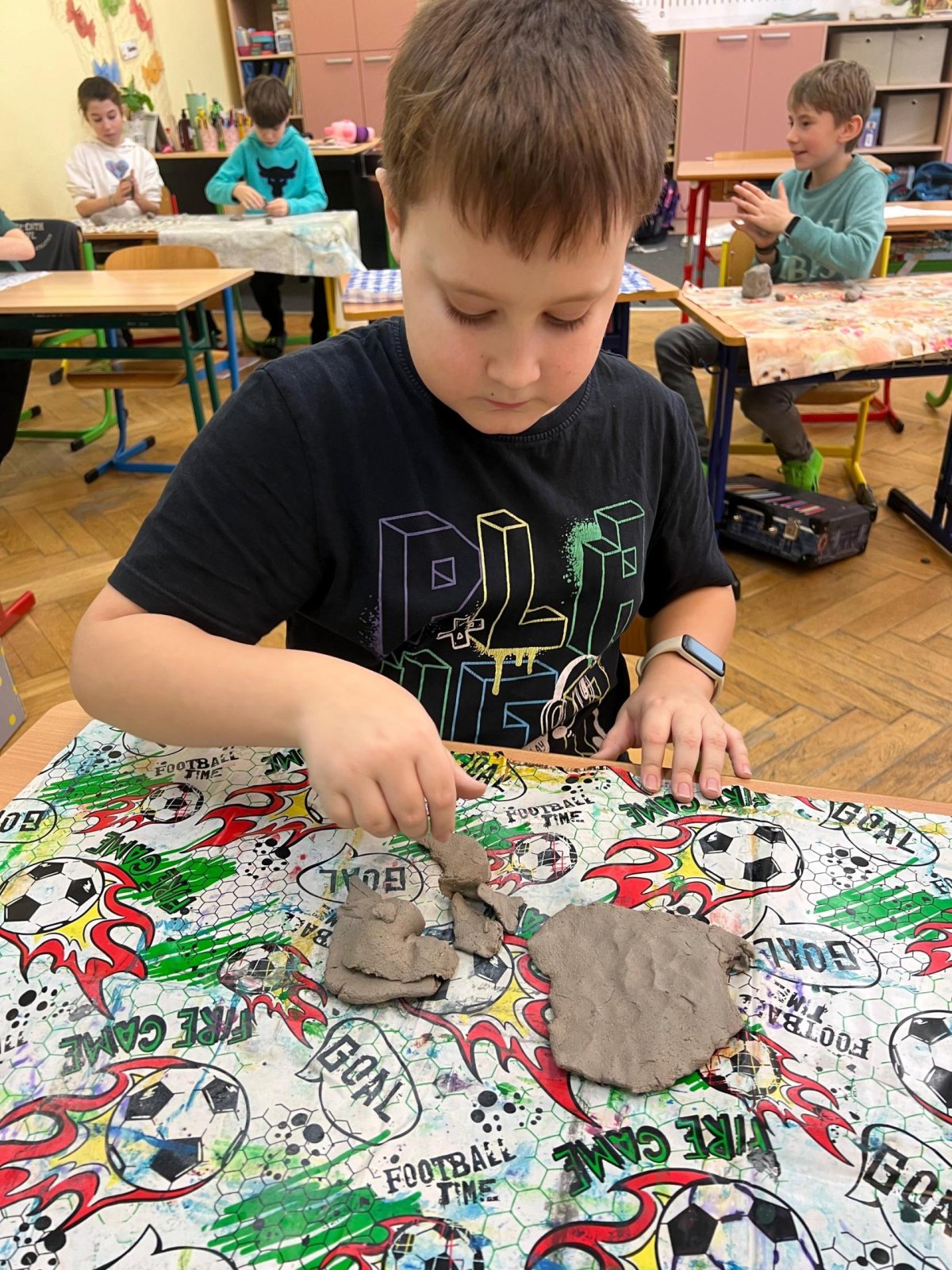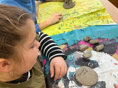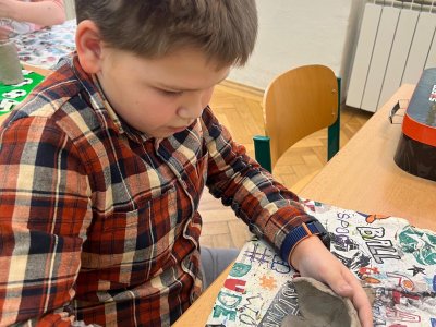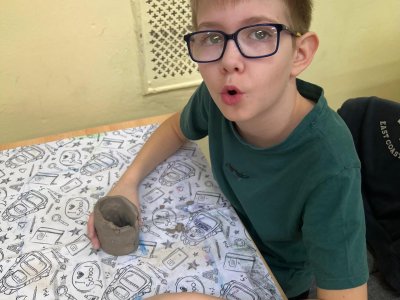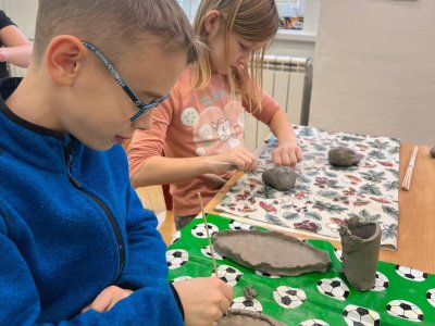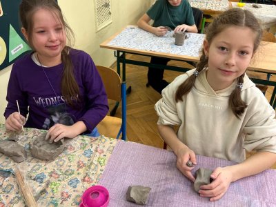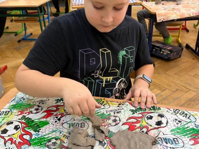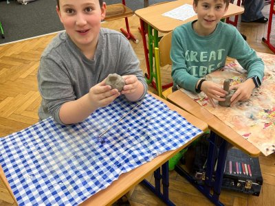 Ve vlastivědě pravěk, v muzeu výstava o tom, jak šel čas a v pracovních činnostech práce s keramickou hlínou... To byl jeden z našich školních dnů. Vůbec nebylo při práci s hlínou účelem, vytvořit umělecké dílo, to vypálit a vystavovat. Naopak - žáci si měli zkusit pracovat s "netradičním" materiálem a z této činnosti mít radost. Tento cíl byl naplněn na více než sto procent. Všichni si práci užili a zároveň vznikla krásná díla, která si na památku můžou odnést domů. Každý výrobek provázel krátký příběh o tom, jak vznikal a jak se každý u práce cítil, jak ji prožíval.