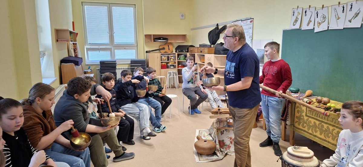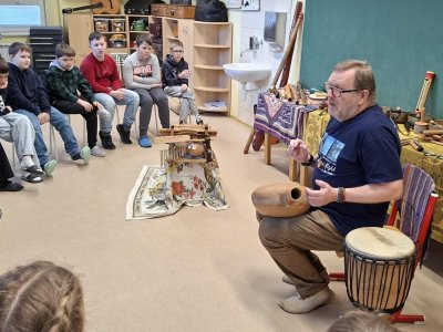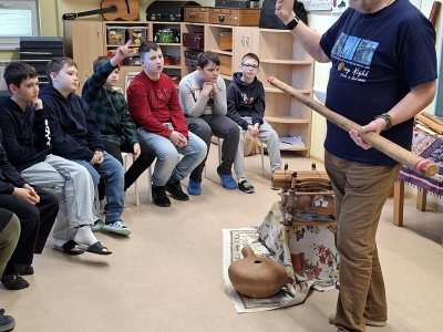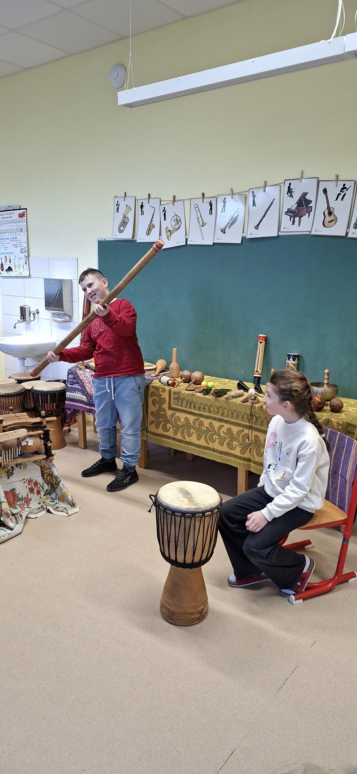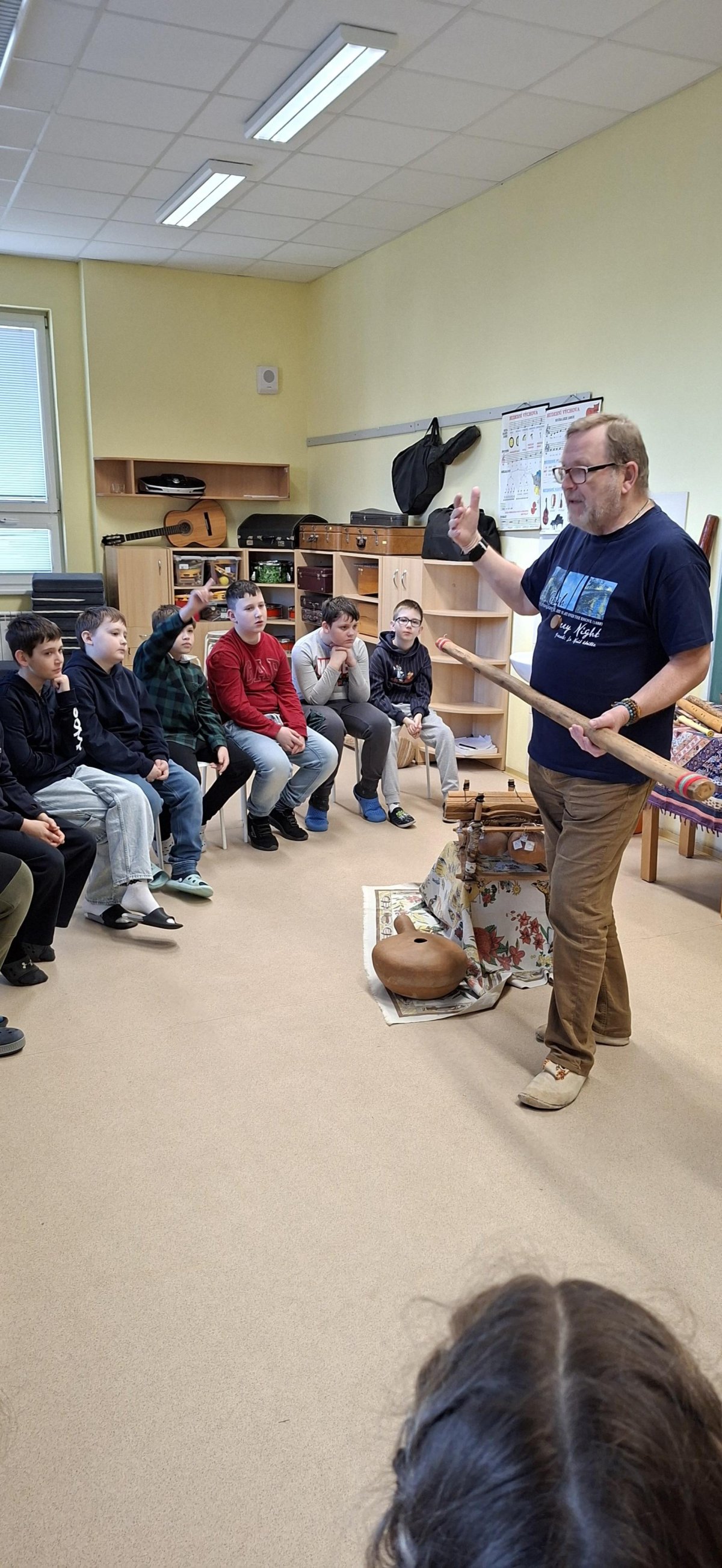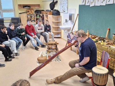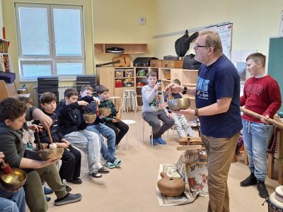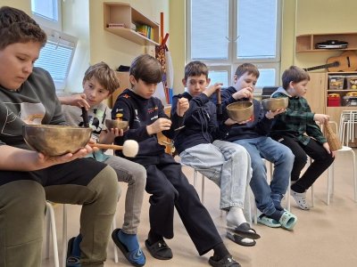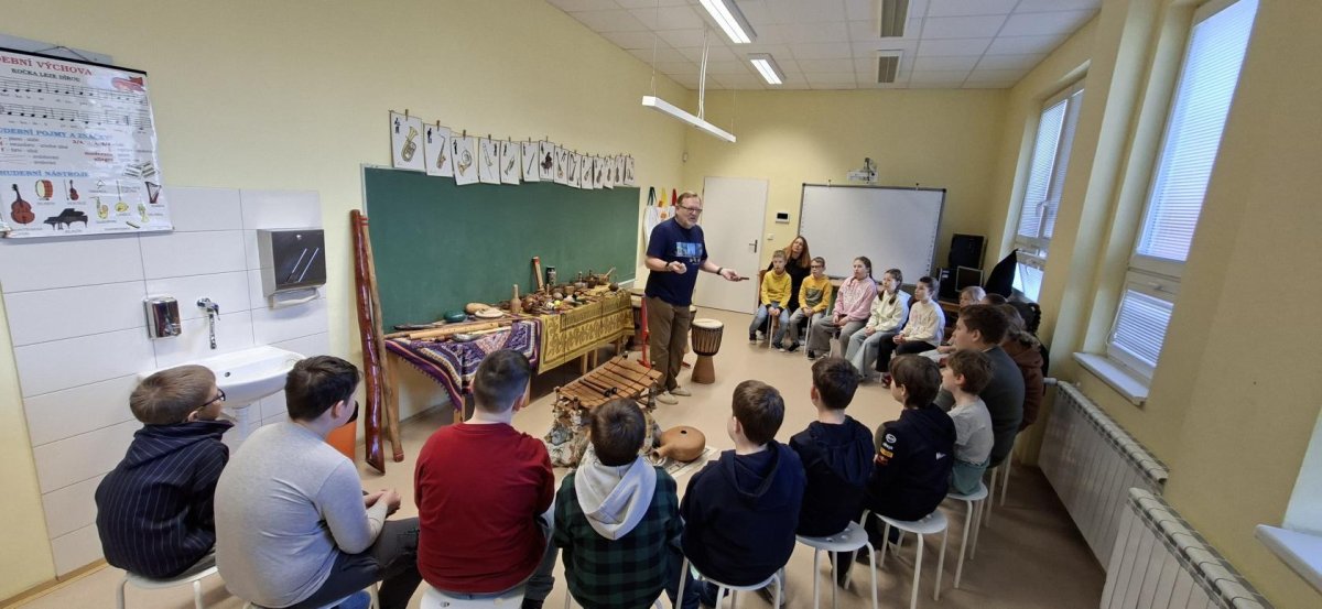 Také do naší třídy zavítal muzikoterapeut, pan Vysočan. Nejdříve nám vyprávěl o vzniku prvních hudebních nástrojů a mnohé zajímavosti o nich. Toto své povídání doplňoval ukázkami jednotlivých nástrojů i hrou na ně. Nakonec si samozřejmě i sami žáci zkusili, jak se na některé z nich hraje, bubnovali podle udávaných rytmů a také díky léčivým nástrojům vytvořili nádhenrnou hudební kulisu ke klidné, krátké meditaci.