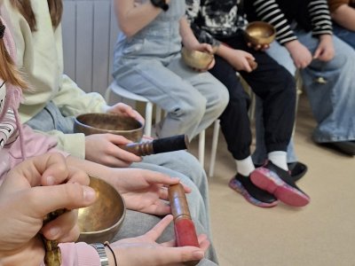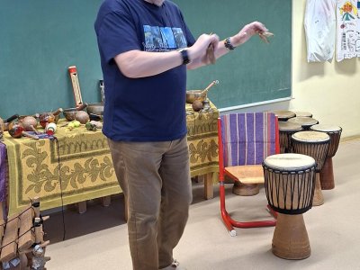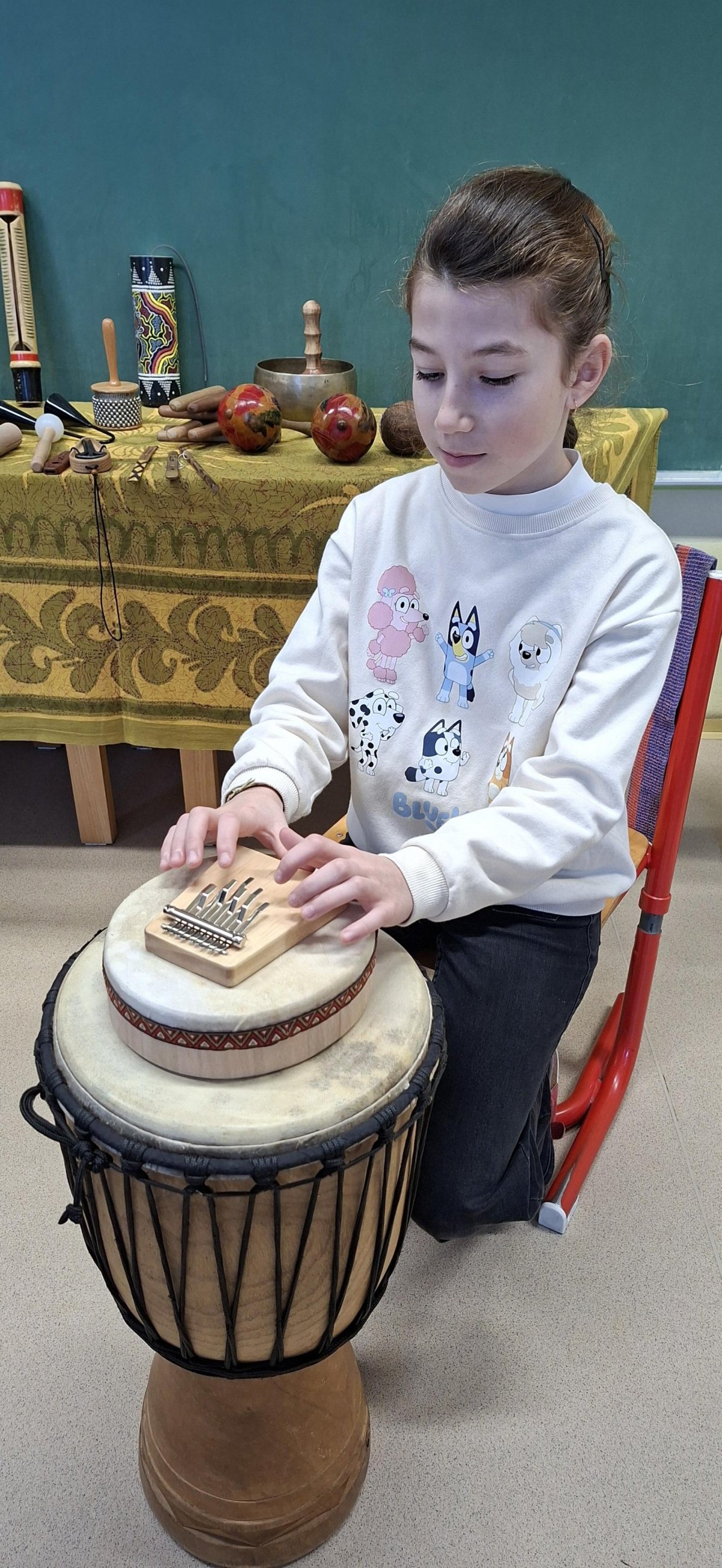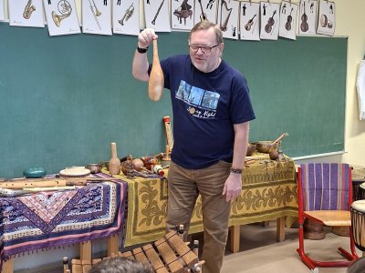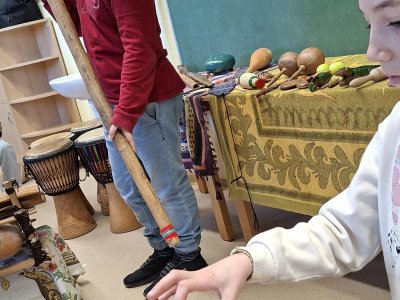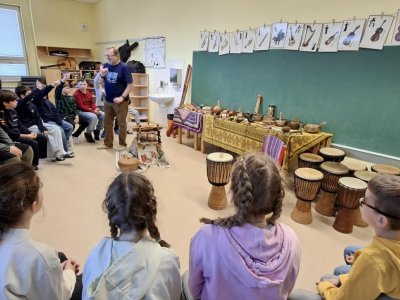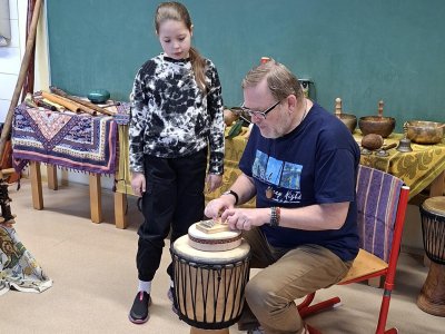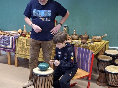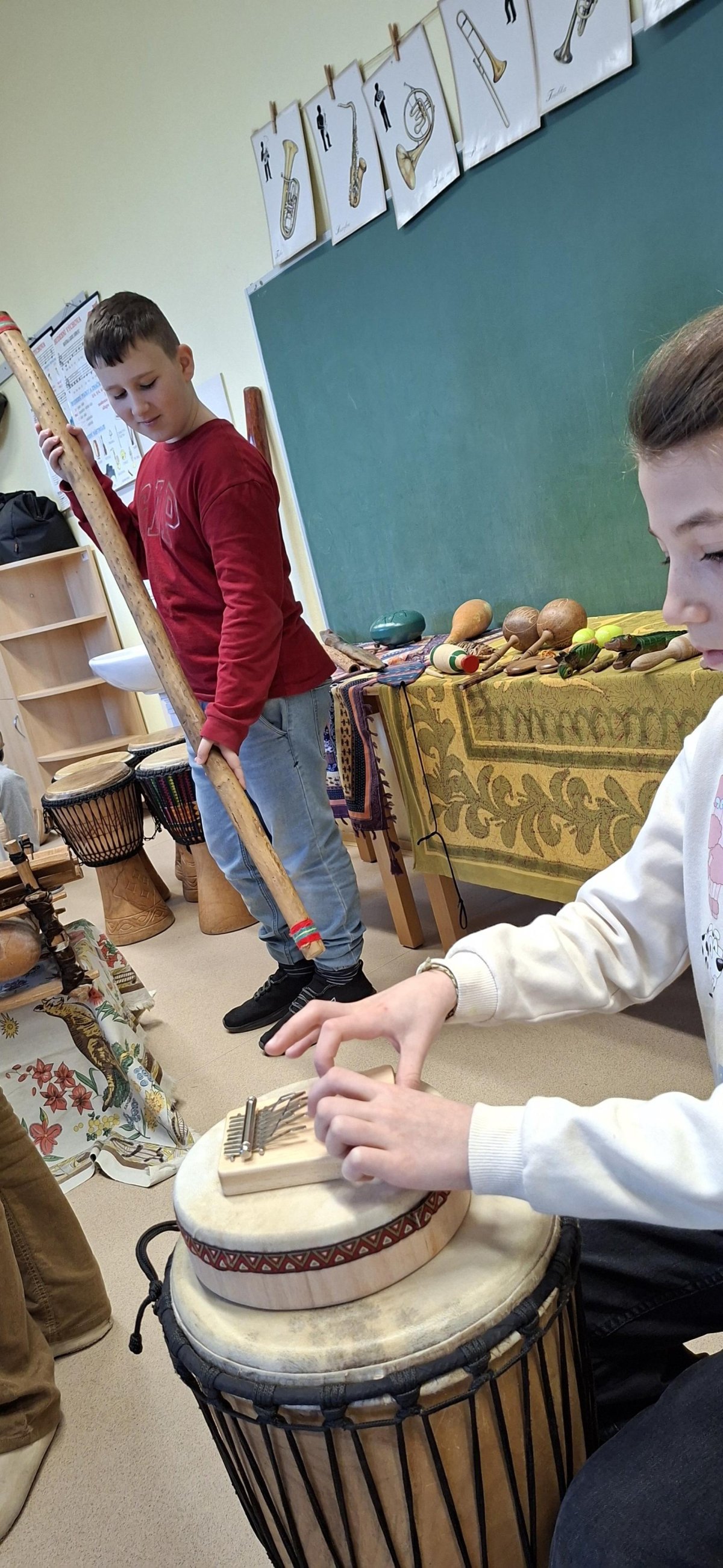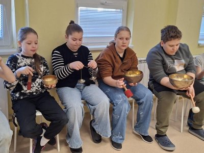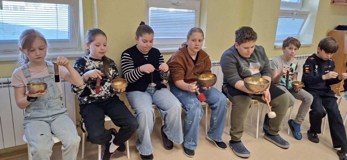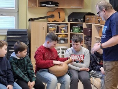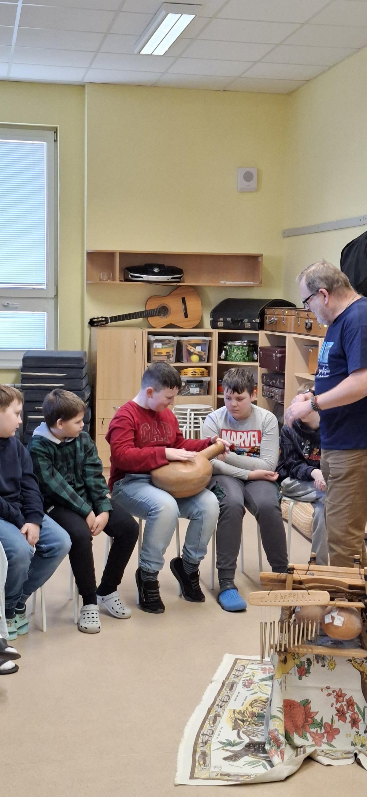 Také do naší třídy zavítal muzikoterapeut, pan Vysočan. Nejdříve nám vyprávěl o vzniku prvních hudebních nástrojů a mnohé zajímavosti o nich. Toto své povídání doplňoval ukázkami jednotlivých nástrojů i hrou na ně. Nakonec si samozřejmě i sami žáci zkusili, jak se na některé z nich hraje, bubnovali podle udávaných rytmů a také díky léčivým nástrojům vytvořili nádhenrnou hudební kulisu ke klidné, krátké meditaci.