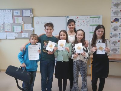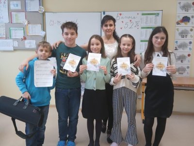Náš krásný úspěch zcela plnohodnotně doplnil Karel Veljlupek, který hudební pauzy vyplnil hrou na trubku - příjemná hudební vsuvka nám udělala radost a společně jsme si vychutnali vítězství a úspěch. Všem žákům děkujeme. Jsme rádi, že je hudba pro děti stále potěšením, užili jsme si to.