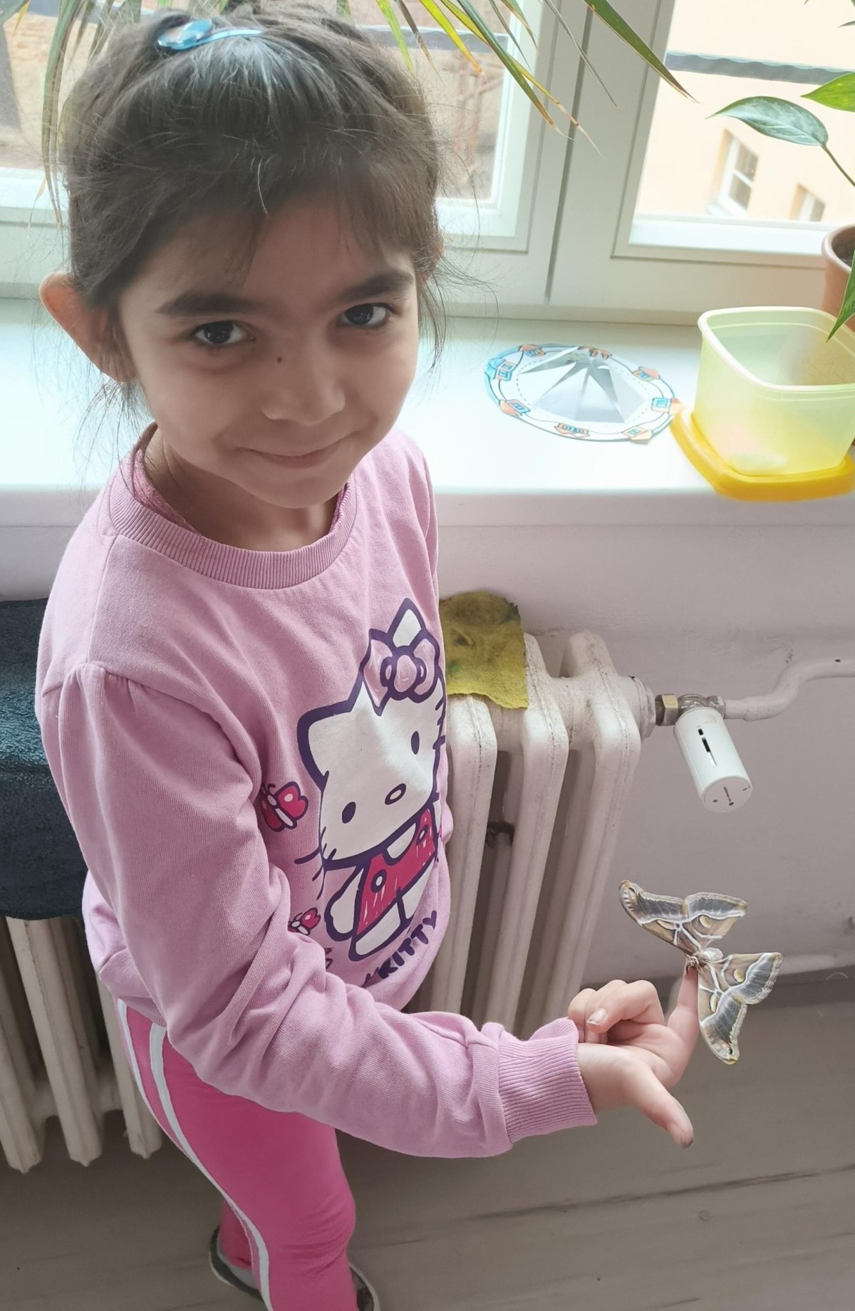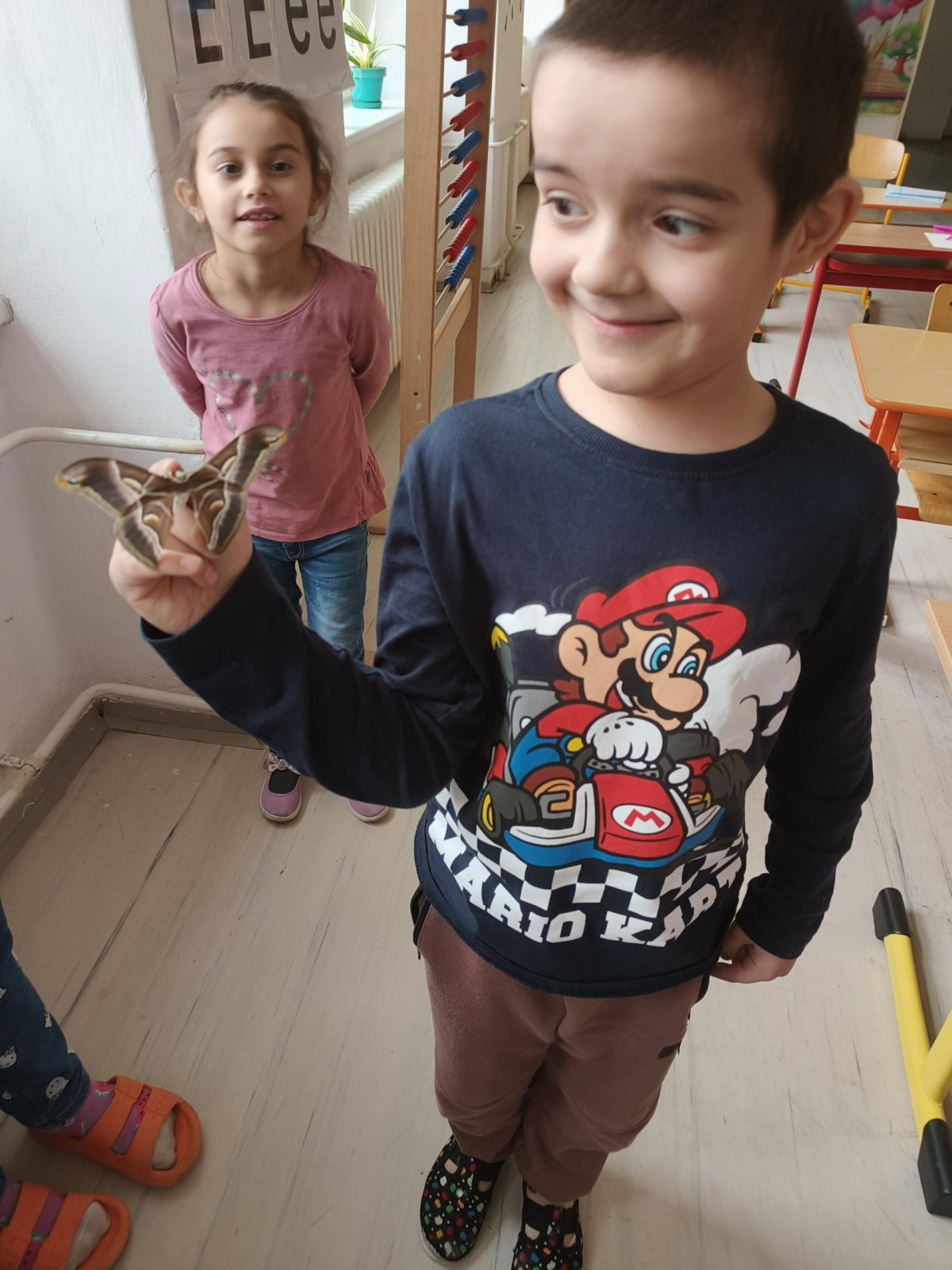Největší nadšení ale přišlo ve chvíli, kdy jsme si mohli živého motýla vzít na prst. Děti byly opatrné, zvědavé a uchvácené jeho velikostí i jemnými křídly. Motýl nám dokonce vzlétl a létal po třídě, což u dětí vyvolalo úžas a veselé překvapení. Nakonec se nám ho podařilo znovu chytit a děti si oddechly, že je náš vzácný návštěvník v pořádku.