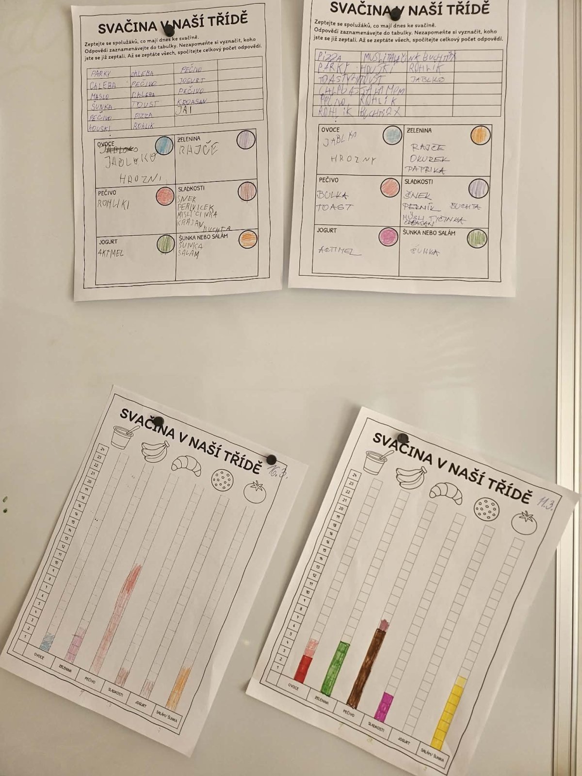 Na konci každého týdne společně zpracováváme výsledky do přehledného grafu. Díky tomu můžeme sledovat, jak se složení svačin v průběhu času mění. A změny jsou opravdu viditelné – během týdne se u většiny žáků začaly objevovat zdravější varianty, jako je více ovoce, zeleniny nebo celozrnného pečiva.